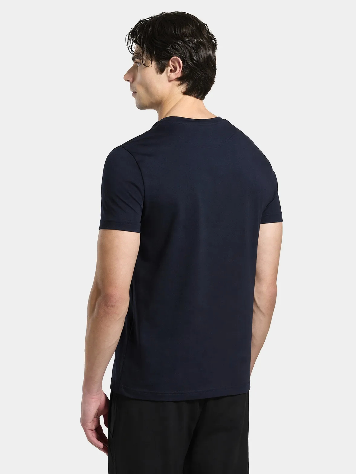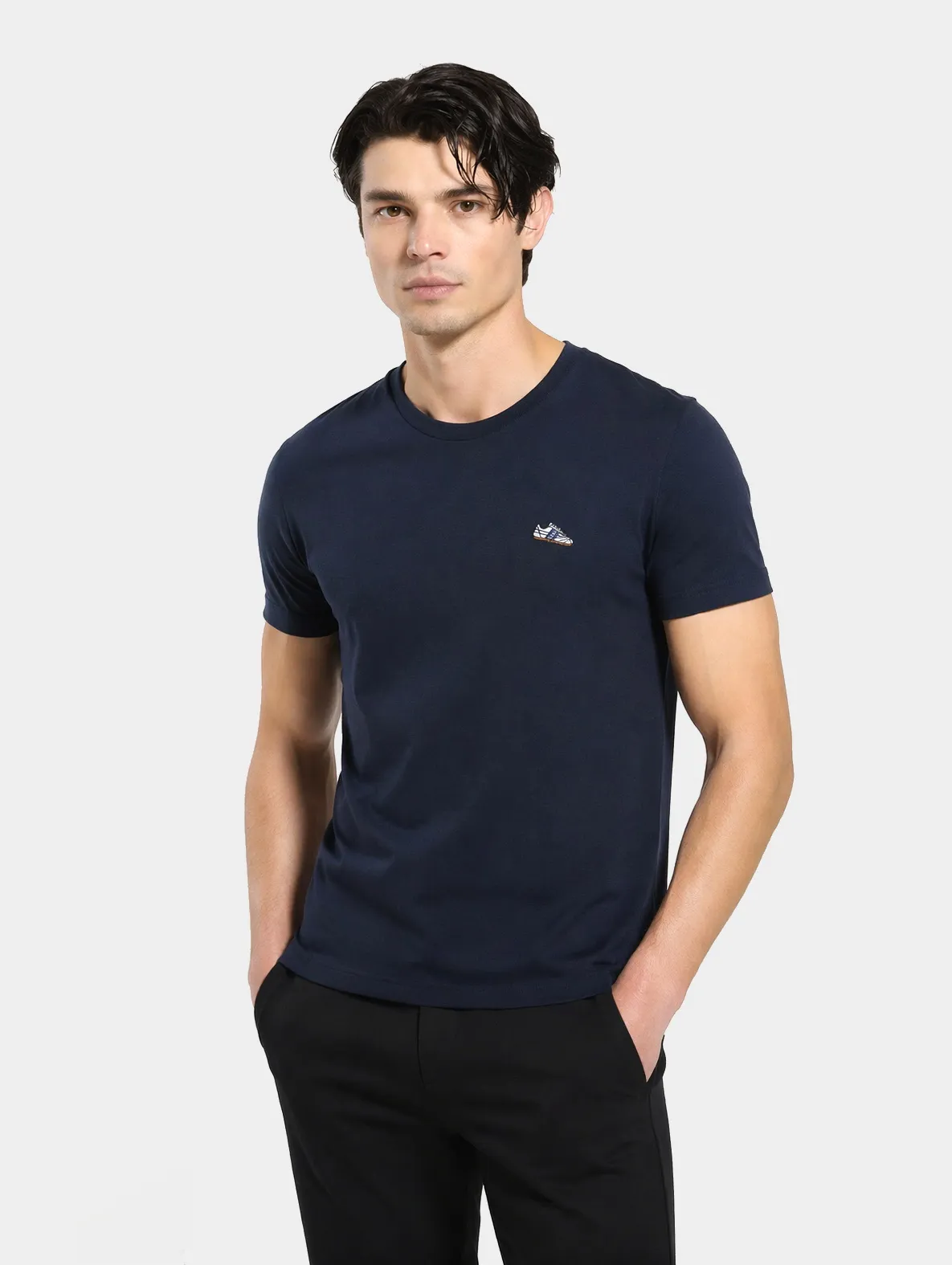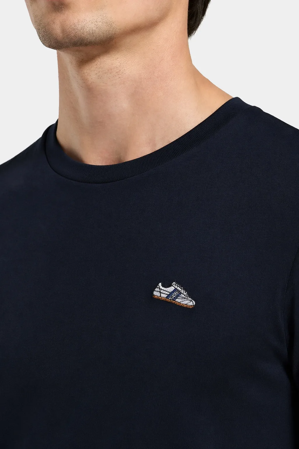 Мужская футболка из натурального хлопка с нашивкой на груди в футбольной тематике. Футболка прямого кроя с круглым вырезом и короткими рукавами.