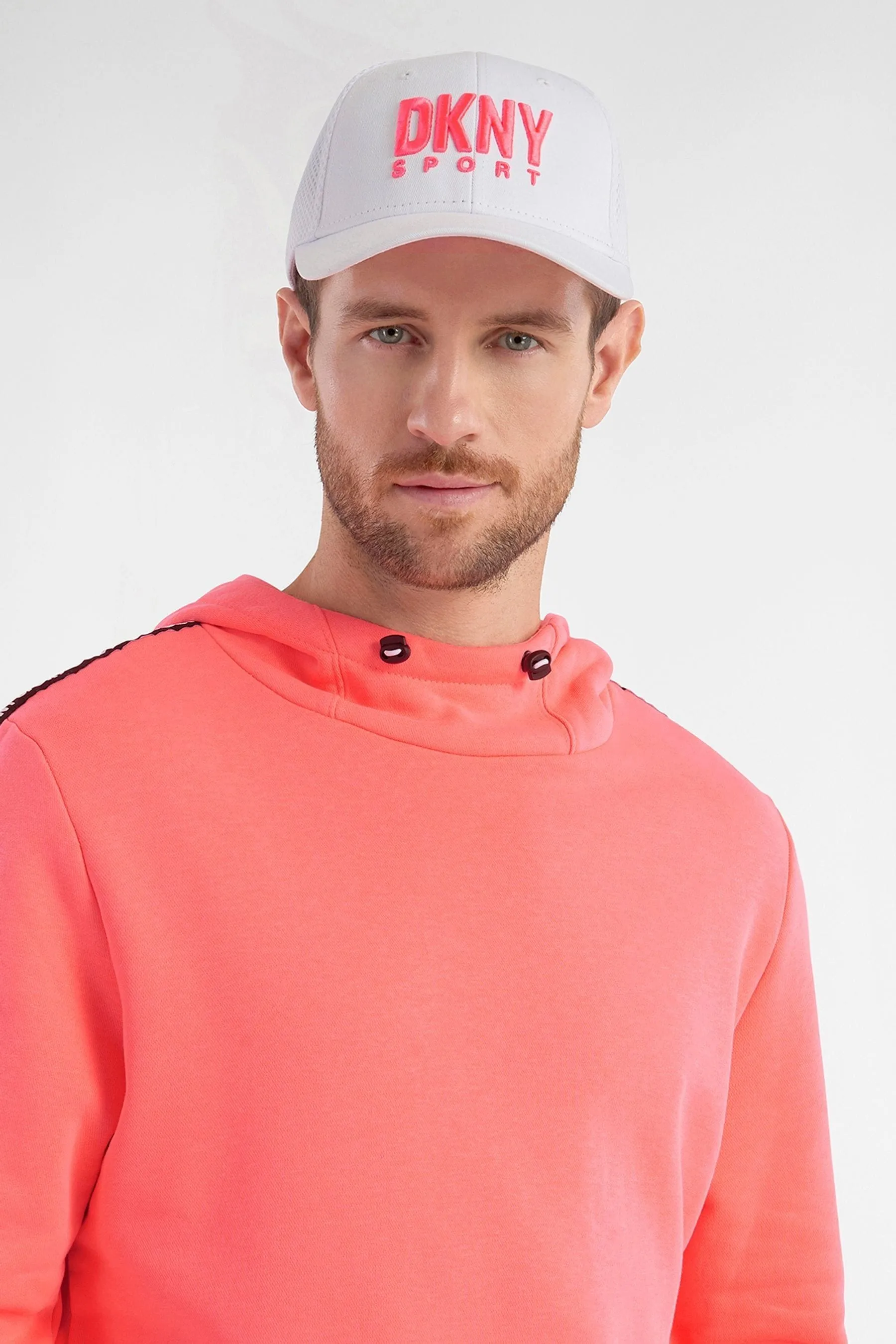 Дышащая бейсболка белого цвета. Спереди расположены вентиляционные отверстия и вышитый крупный логотип бренда DKNY Sport. Сзади кепка сшита из сетчатого, воздухопроницаемого материала.