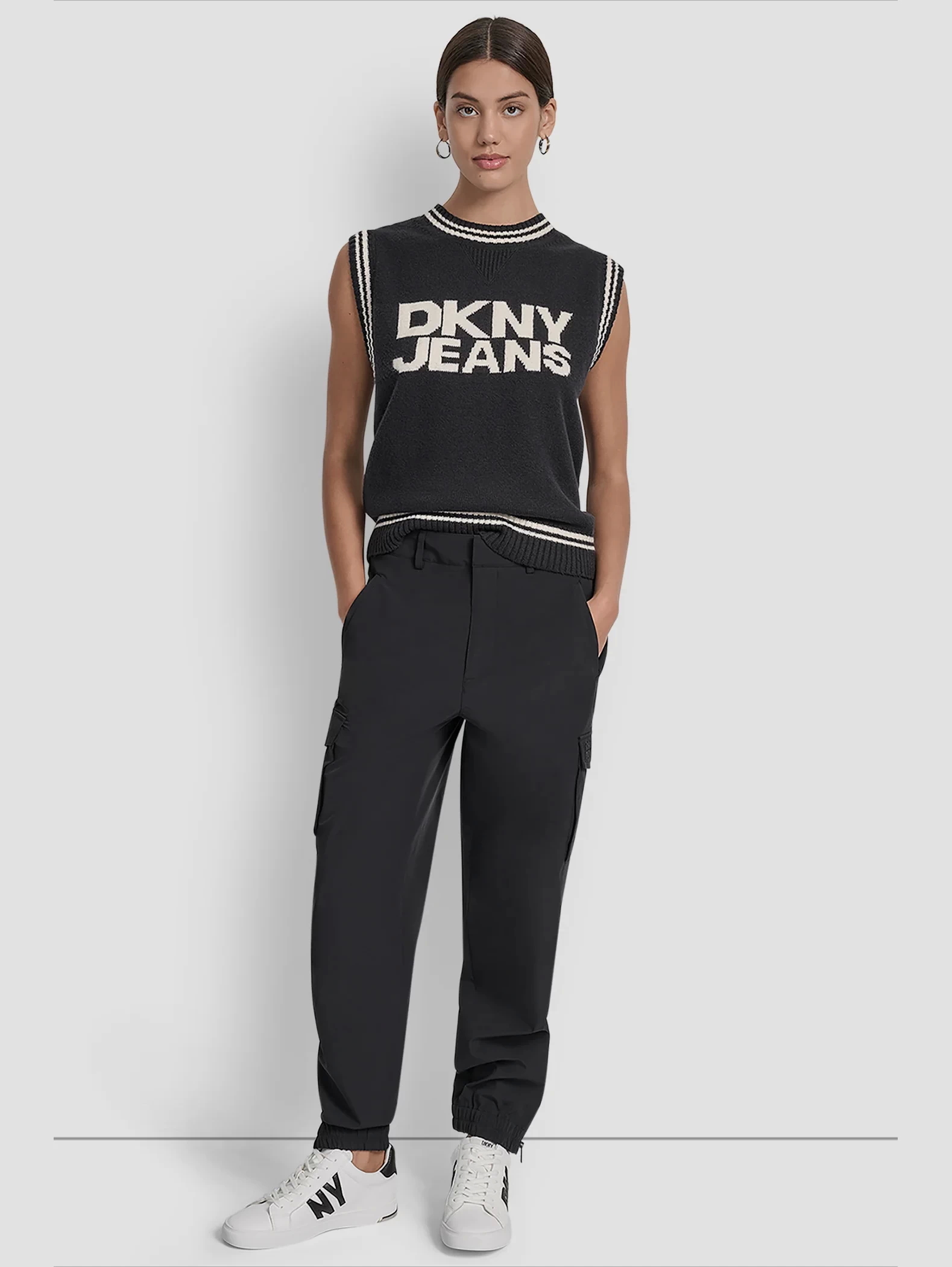 Женские брюки-карго DKNY в спортивно-городском стиле выполнены с высокой талией и дополнены функциональными карманами. Молнии на щиколотках позволяют регулировать посадку и добавляют динамики образу.