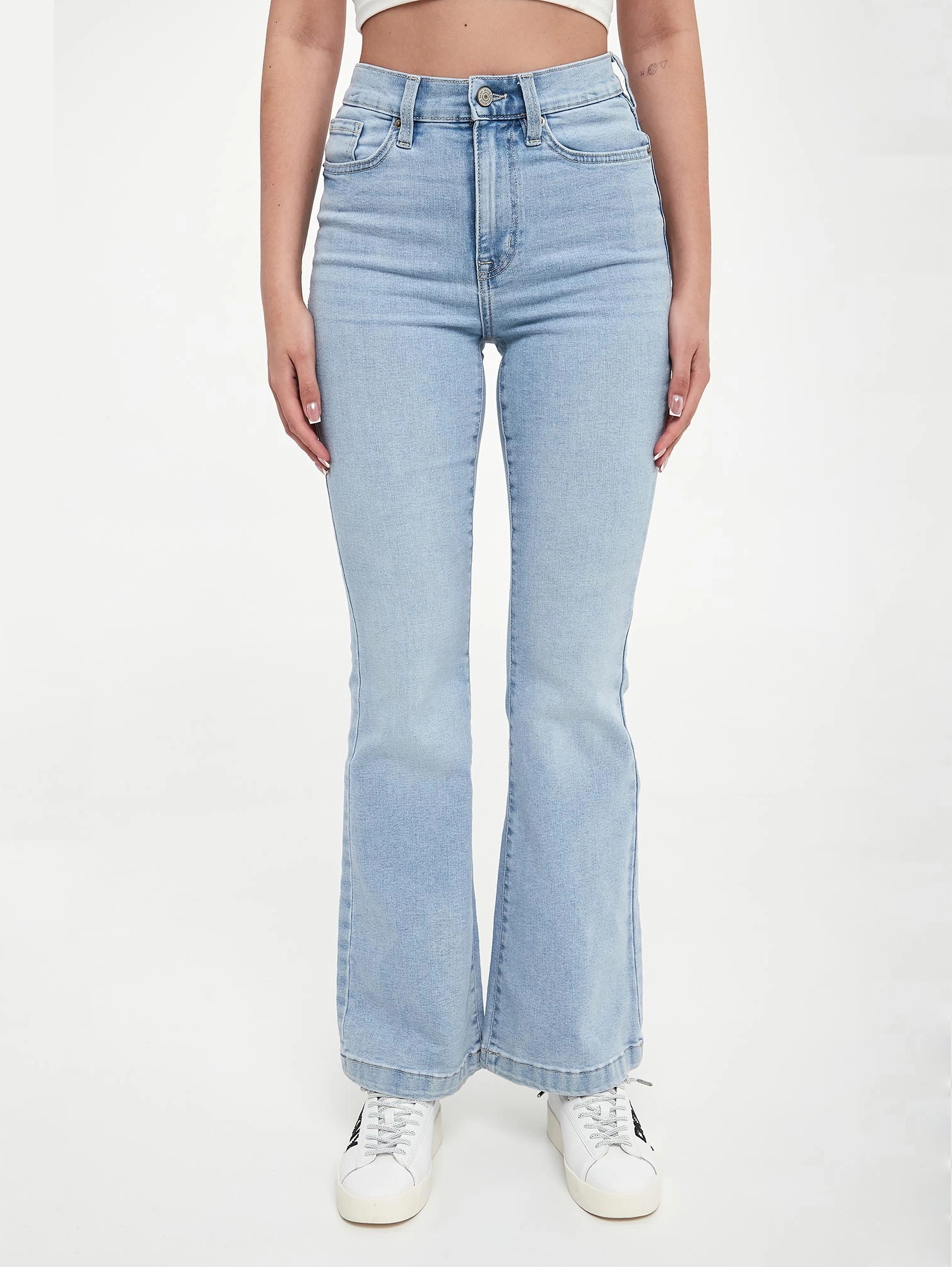 Женские джинсы-клёш — лаконичная базовая модель с современным акцентом. Плотный деним обеспечивает комфорт в движении, а силуэт с расклешённым низом визуально вытягивает ноги и легко сочетается с разными образами — от кэжуал до более элегантных.