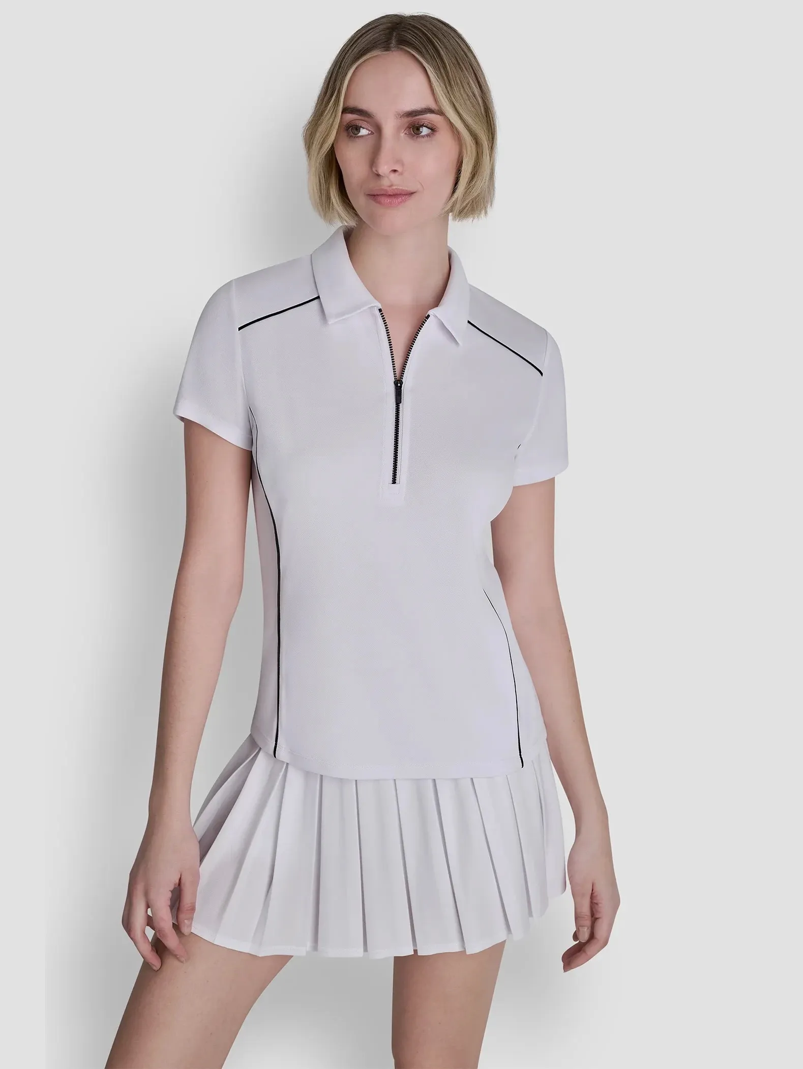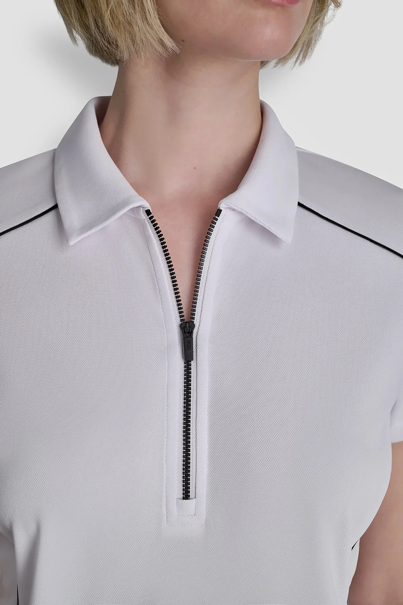 Женская спортивная футболка-поло — стильный выбор для тенниса, гольфа, тренировок и активного отдыха. Приталенный крой, короткие рукава, воротник на молнии и контрастные линии визуально стройнят и подчеркивают силуэт.