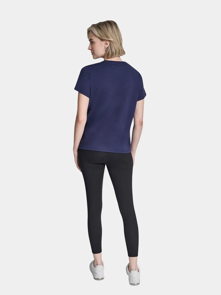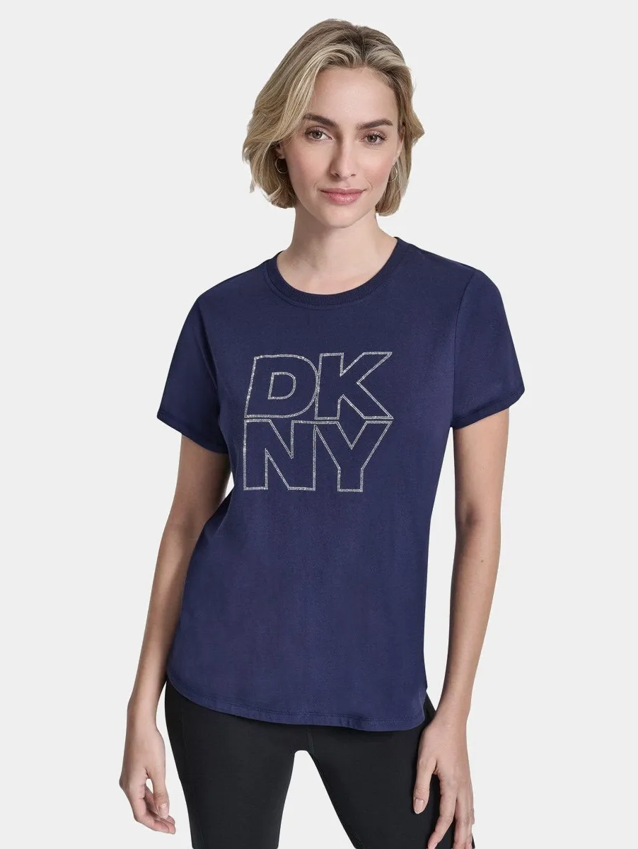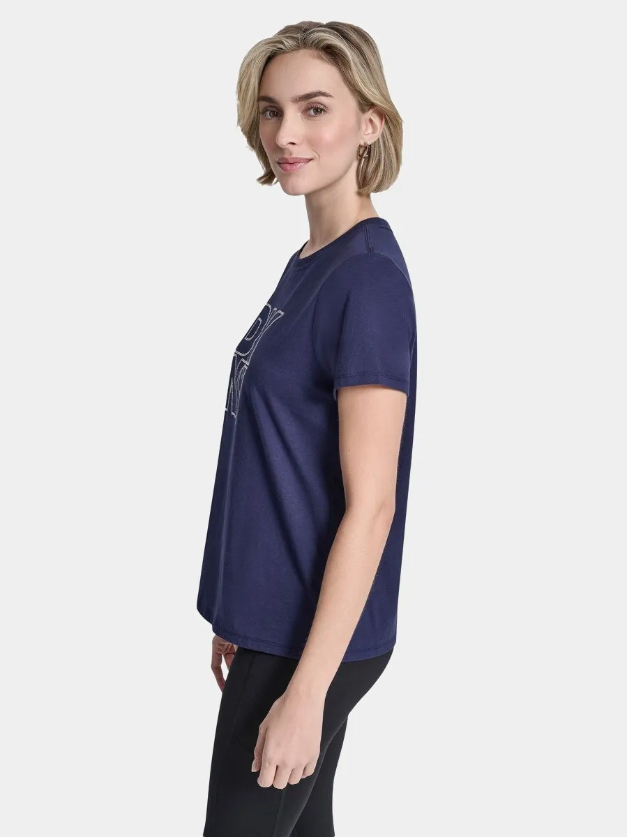 Женская футболка прямого кроя из натурального хлопка. Спереди декорирована серебристым логотипом бренда. Универсальная модель для casual и стильных городских образов.
