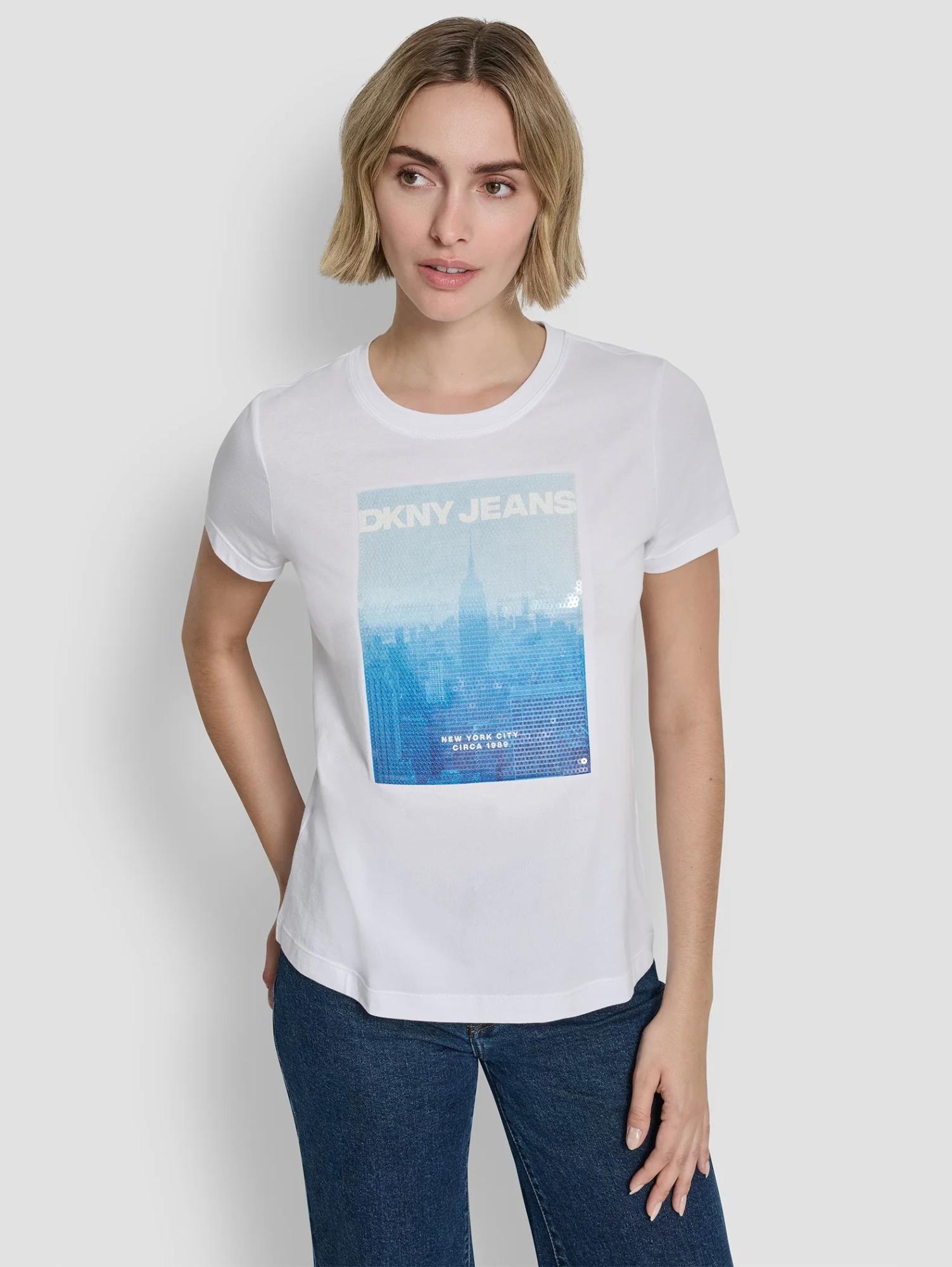 Женская футболка с акцентным фирменным принтом и вышитыми пайетками — стильная база для повседневных образов. Прямой крой, мягкий трикотаж, короткие рукава и городской принт с логотипом делают модель актуальной и универсальной. Отлично сочетается с джинсами, шортами и casual-образами на каждый день.