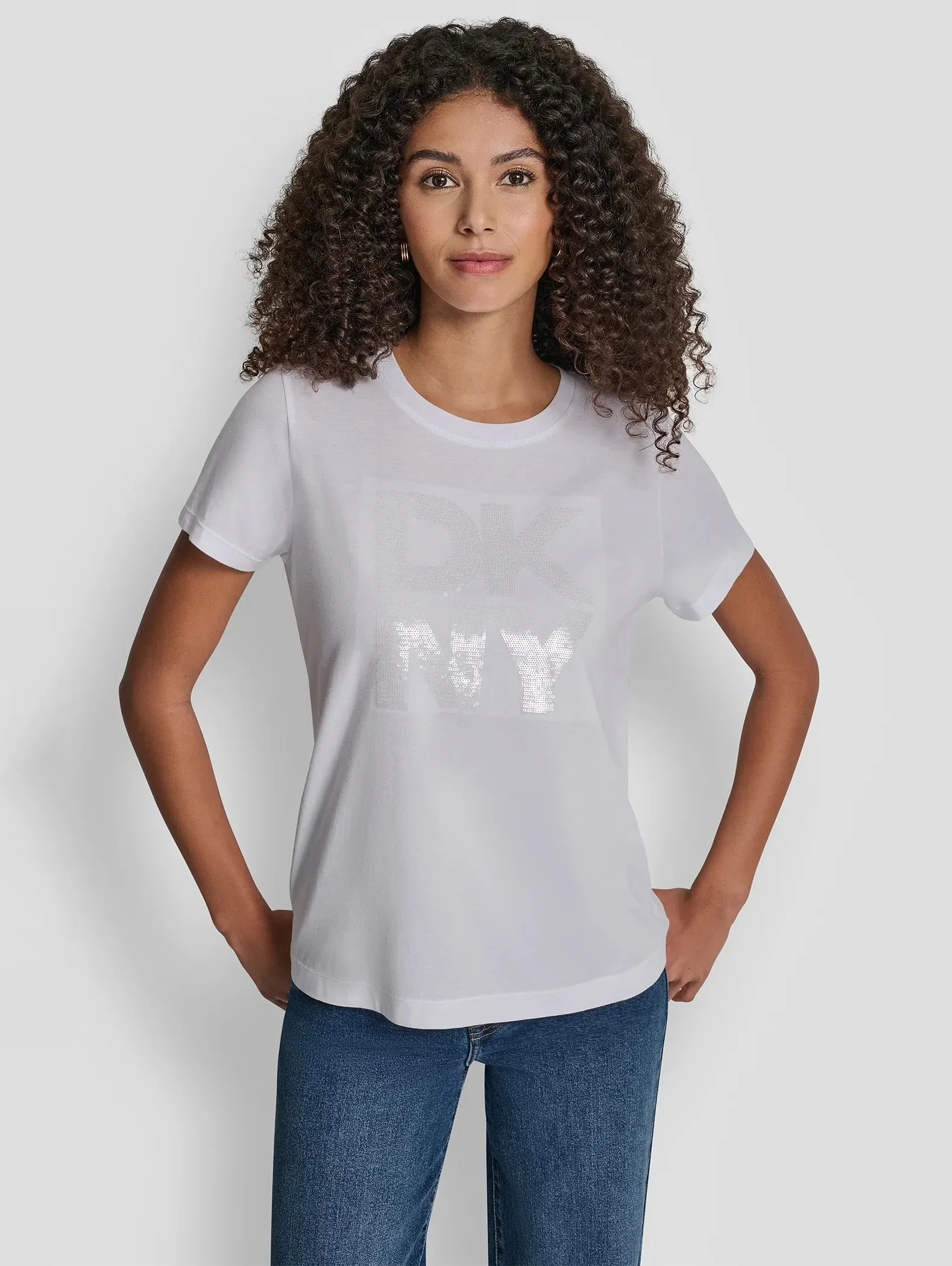 Женская футболка прямого кроя — эффектная база с модным акцентом. Прямой крой, мягкий трикотаж, короткие рукава и крупный логотип бренда из пайеток делают модель стильной и выразительной. Идеально подходит для повседневных образов с джинсами, брюками, юбками.