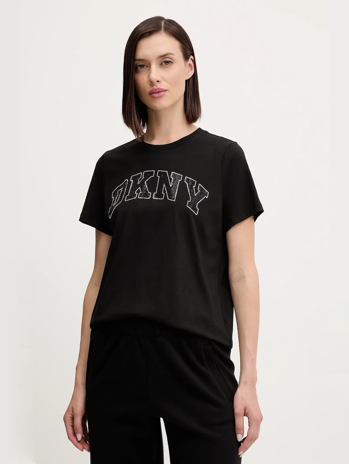 Женская футболка DKNY из чёрного хлопка прямого кроя с логотипом из страз спереди станет стильным акцентом в повседневных образах.