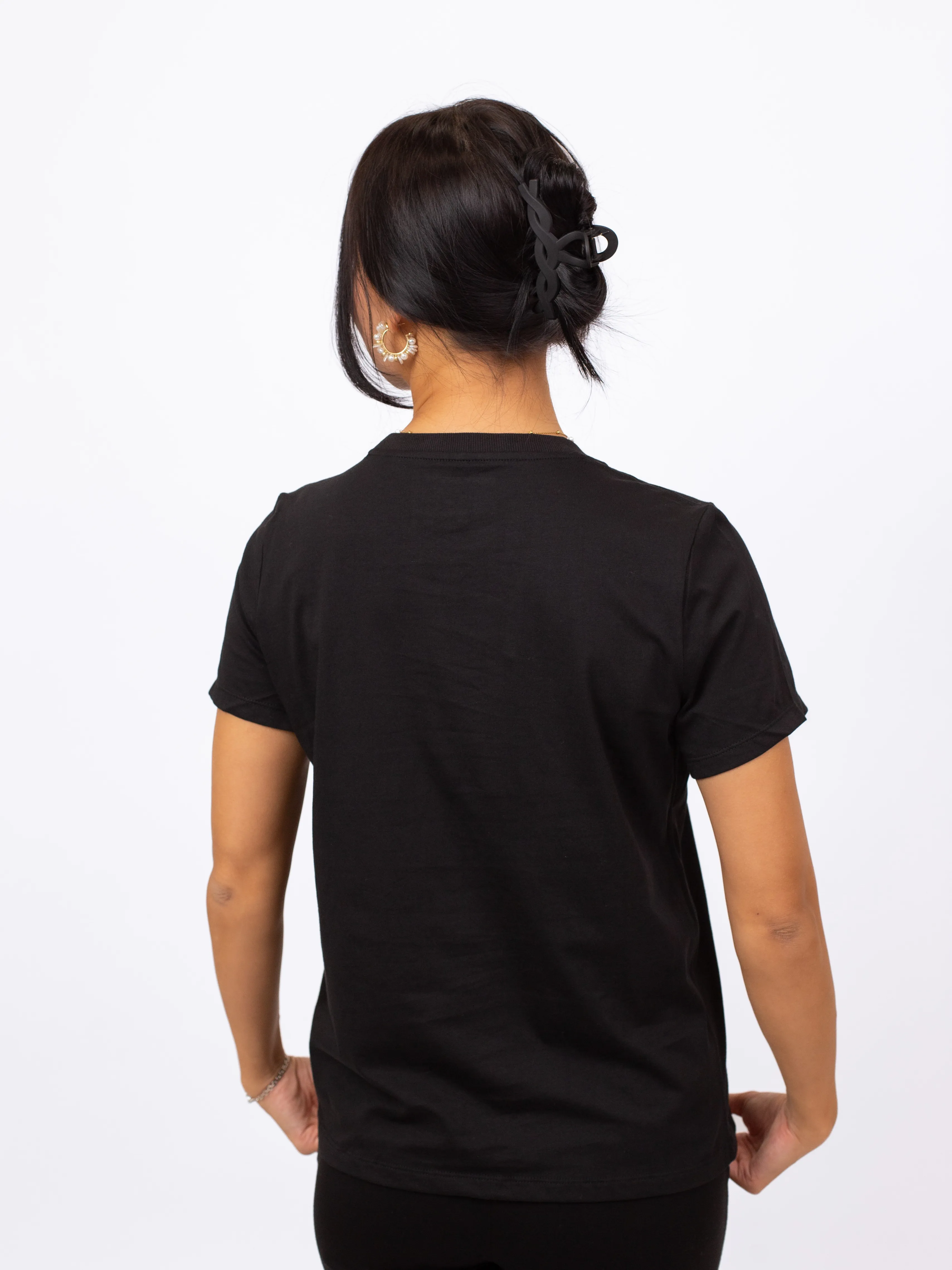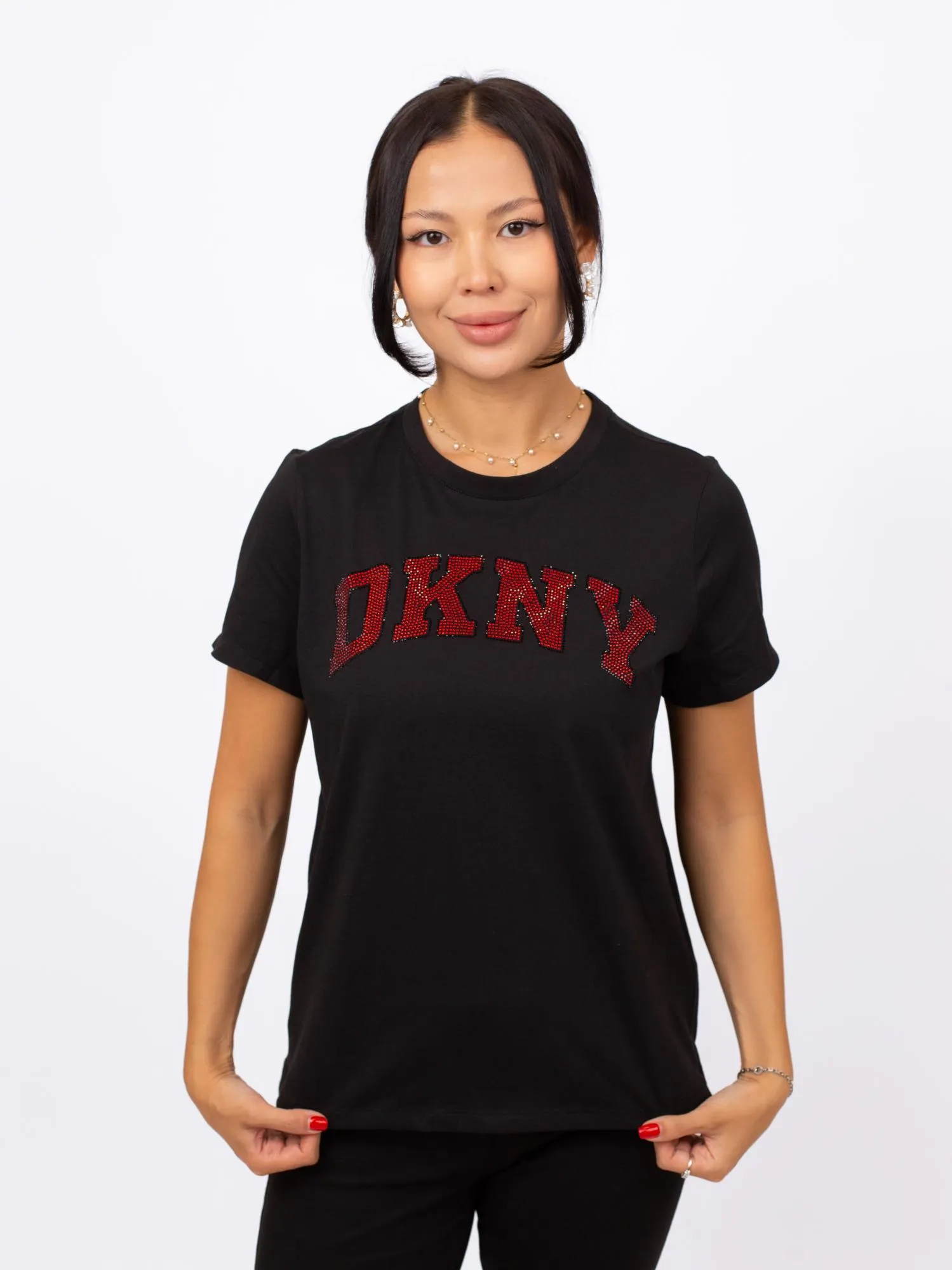 Женская футболка DKNY черного цвета из хлопка прямого кроя с контрастным логотипом из страз спереди подчеркнёт ваш индивидуальный стиль и легко дополнит повседневный гардероб.