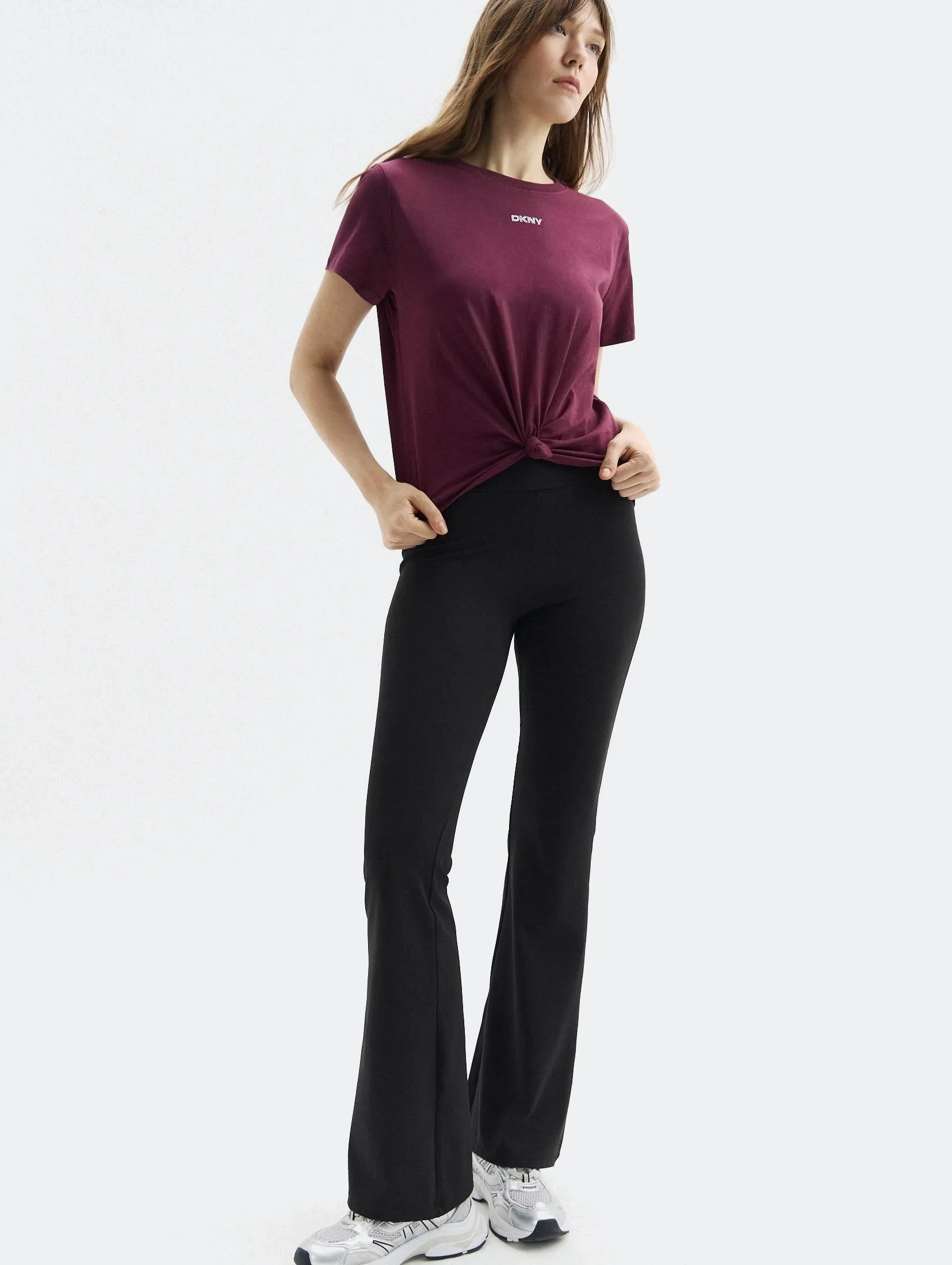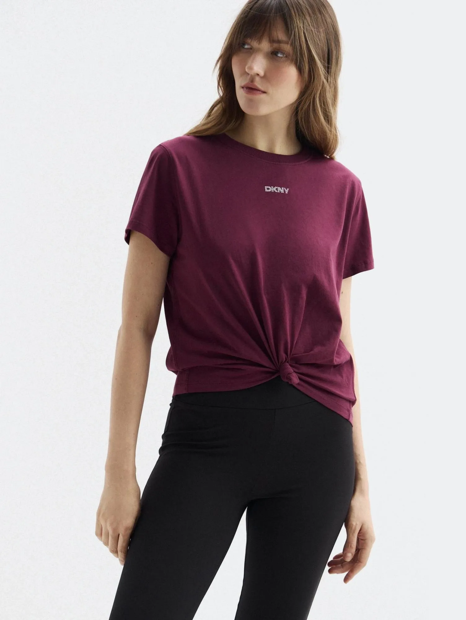 Женская футболка DKNY из натурального, дышащего хлопка, спереди украшена клепками с изображением логотипа бренда. Прямой крой, короткие рукава и круглый вырез делают её универсальной. Идеальна как для casual-образов, так и для стильных сочетаний с джинсами.