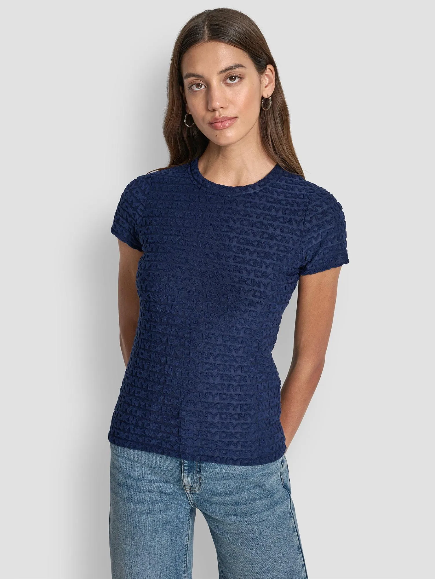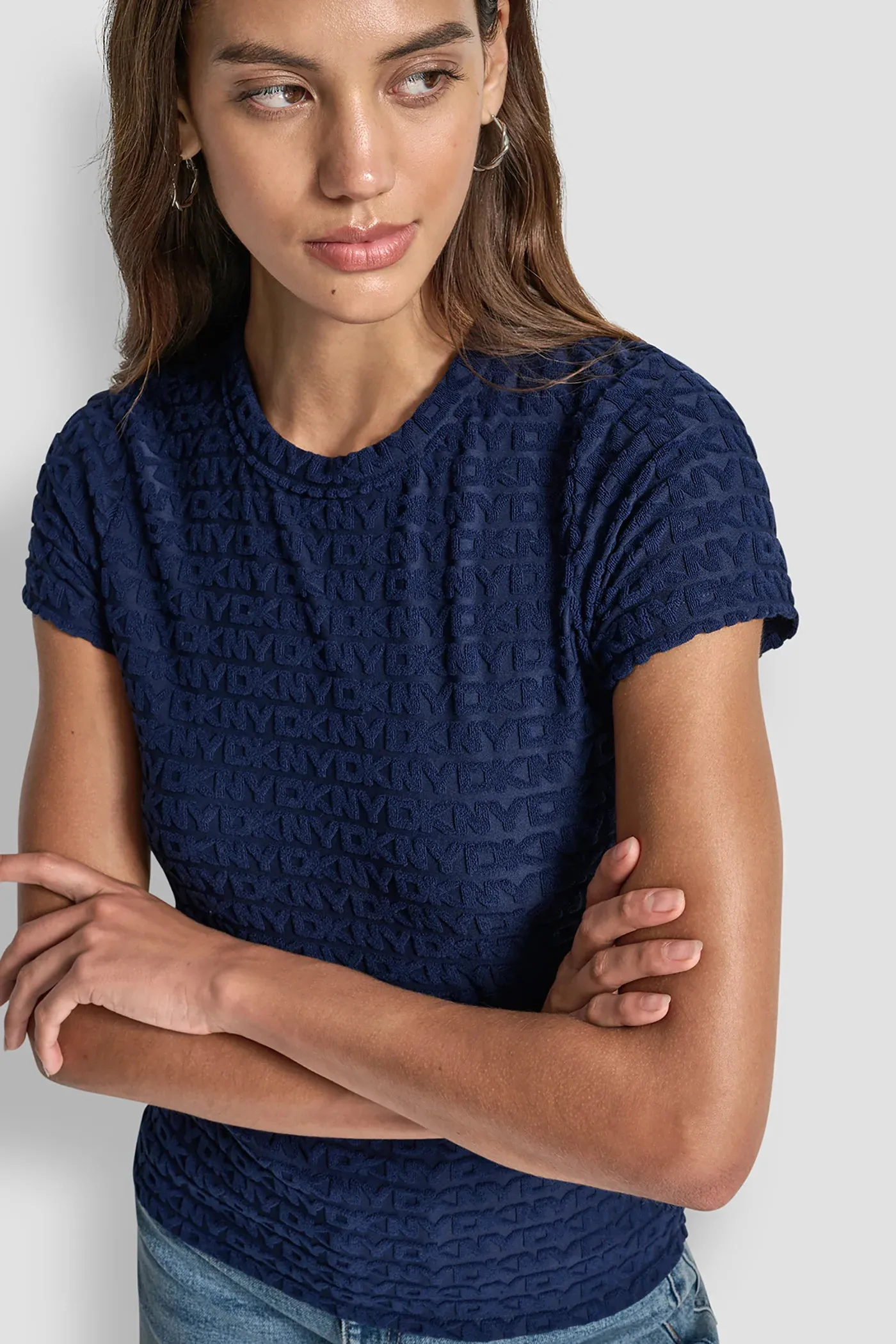 Женская облегающая футболка с короткими рукавами и круглым вырезом из эластичного нейлона, украшенная тиснёным логотипом. Идеальна для casual и городских образов.
