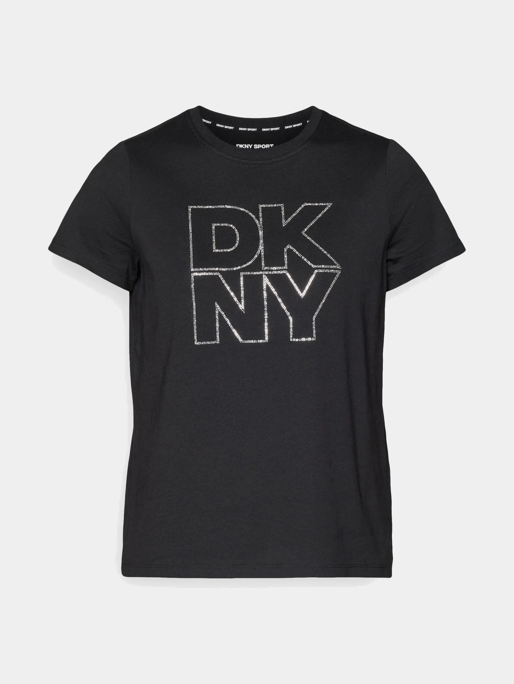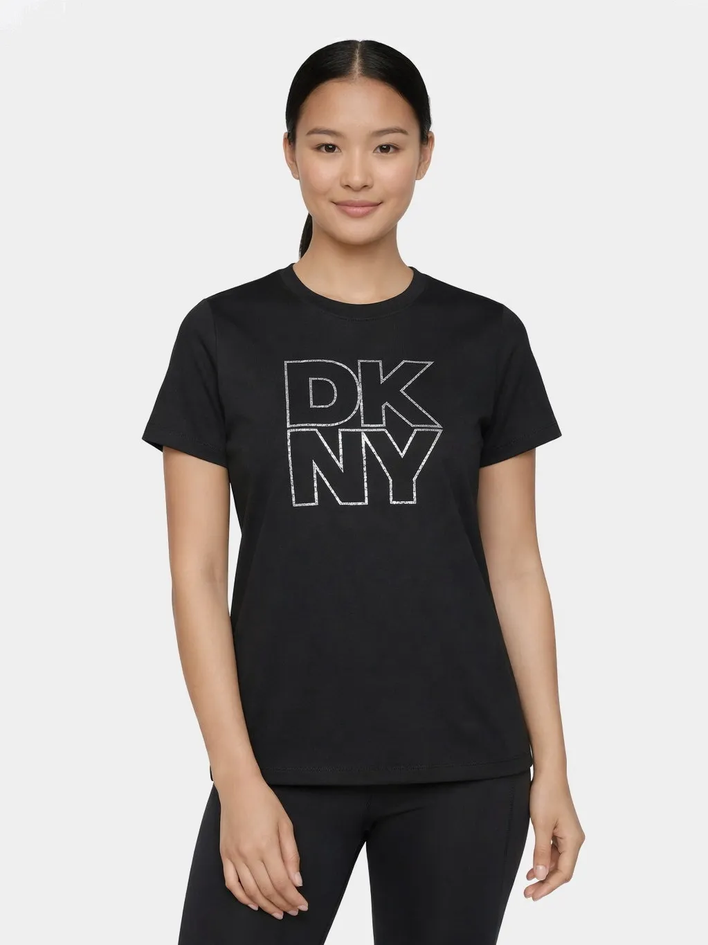 Женская футболка прямого кроя из натурального хлопка. Спереди декорирована серебристым логотипом бренда. Универсальная модель для casual и стильных городских образов.