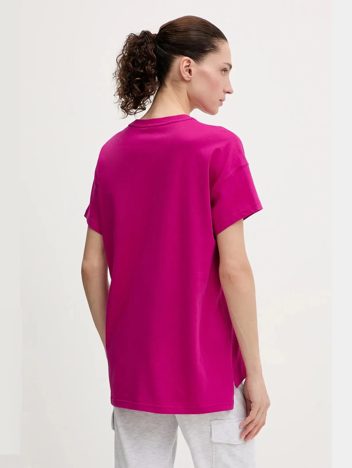 Женская футболка свободного кроя из натурального плотного хлопка. Удлиненная спинка, боковые разрезы. Спереди декорирована крупным логотипом бренда. Универсальная модель для casual и стильных городских образов.