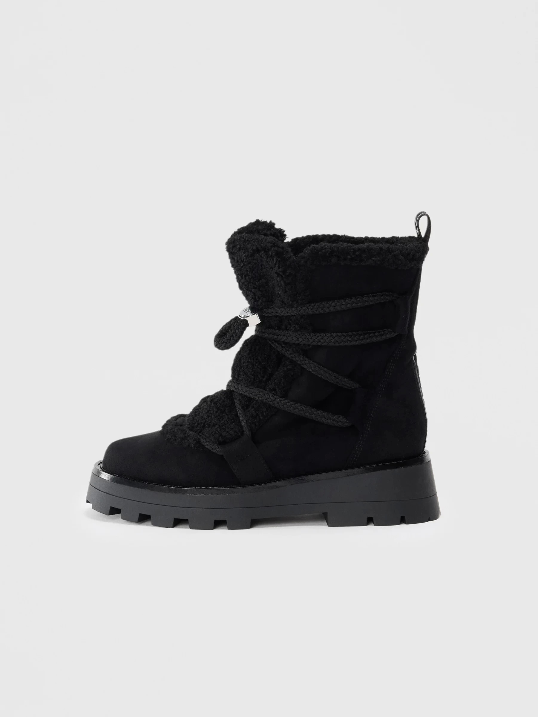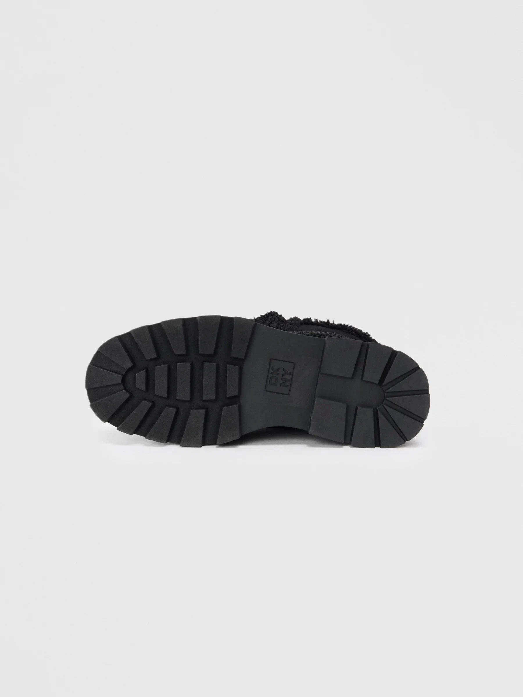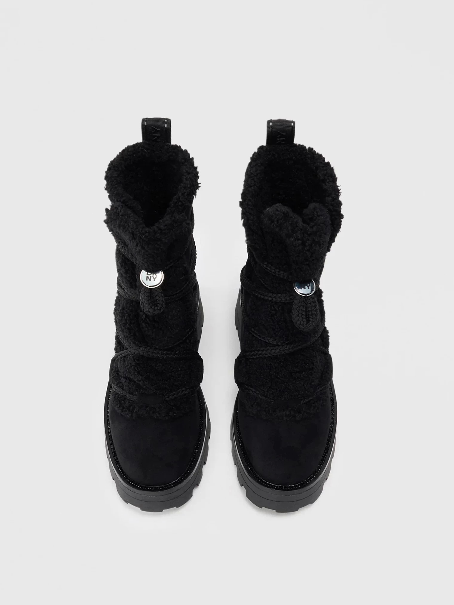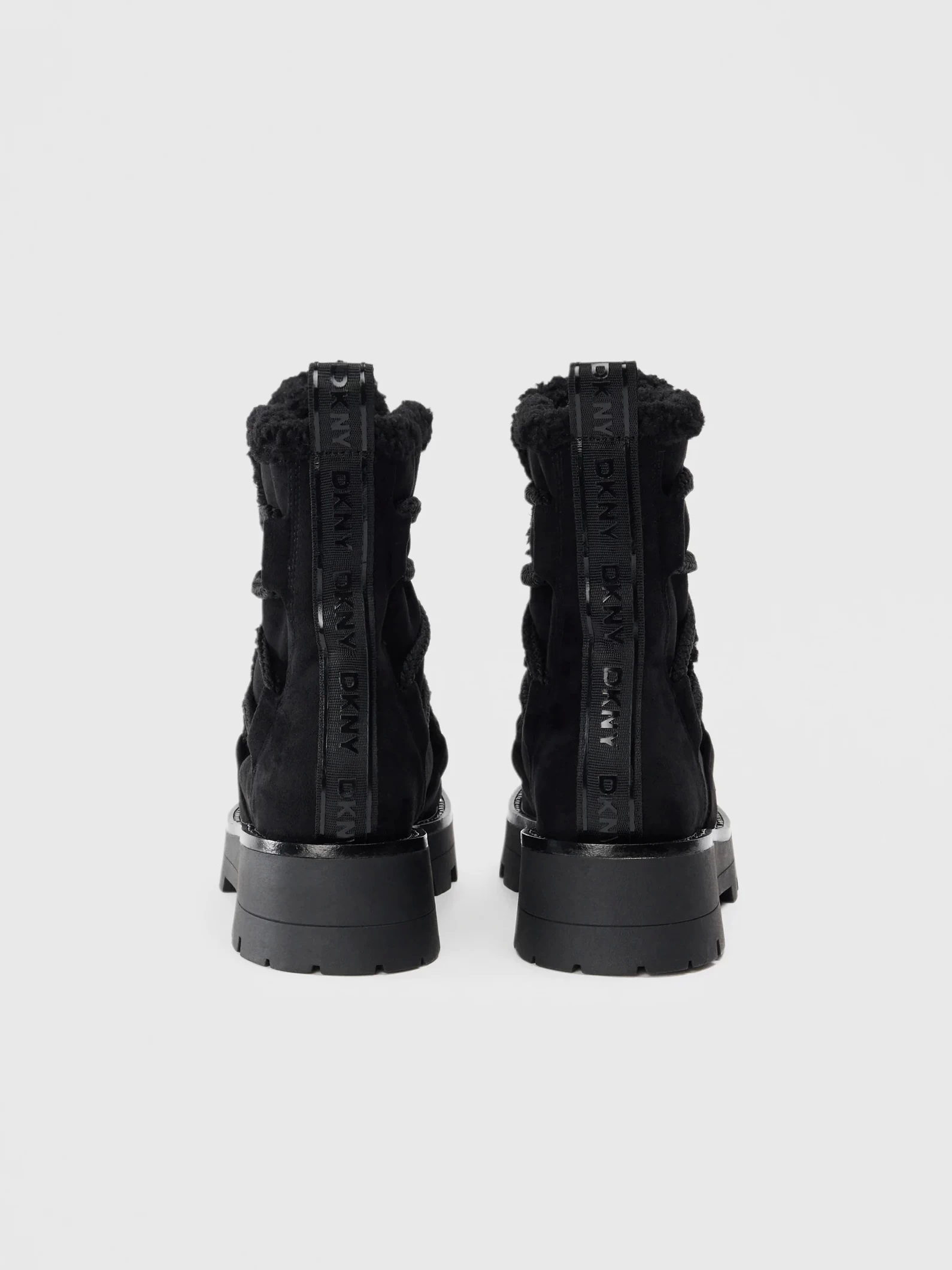 Женские зимние ботинки SIGNE от DKNY выполнены из искусственной замши с отделкой из искусственной овчины и рифлёной подошвой для устойчивости. Модель с круглым носком и шнуровкой сочетает комфорт, тепло и стиль.