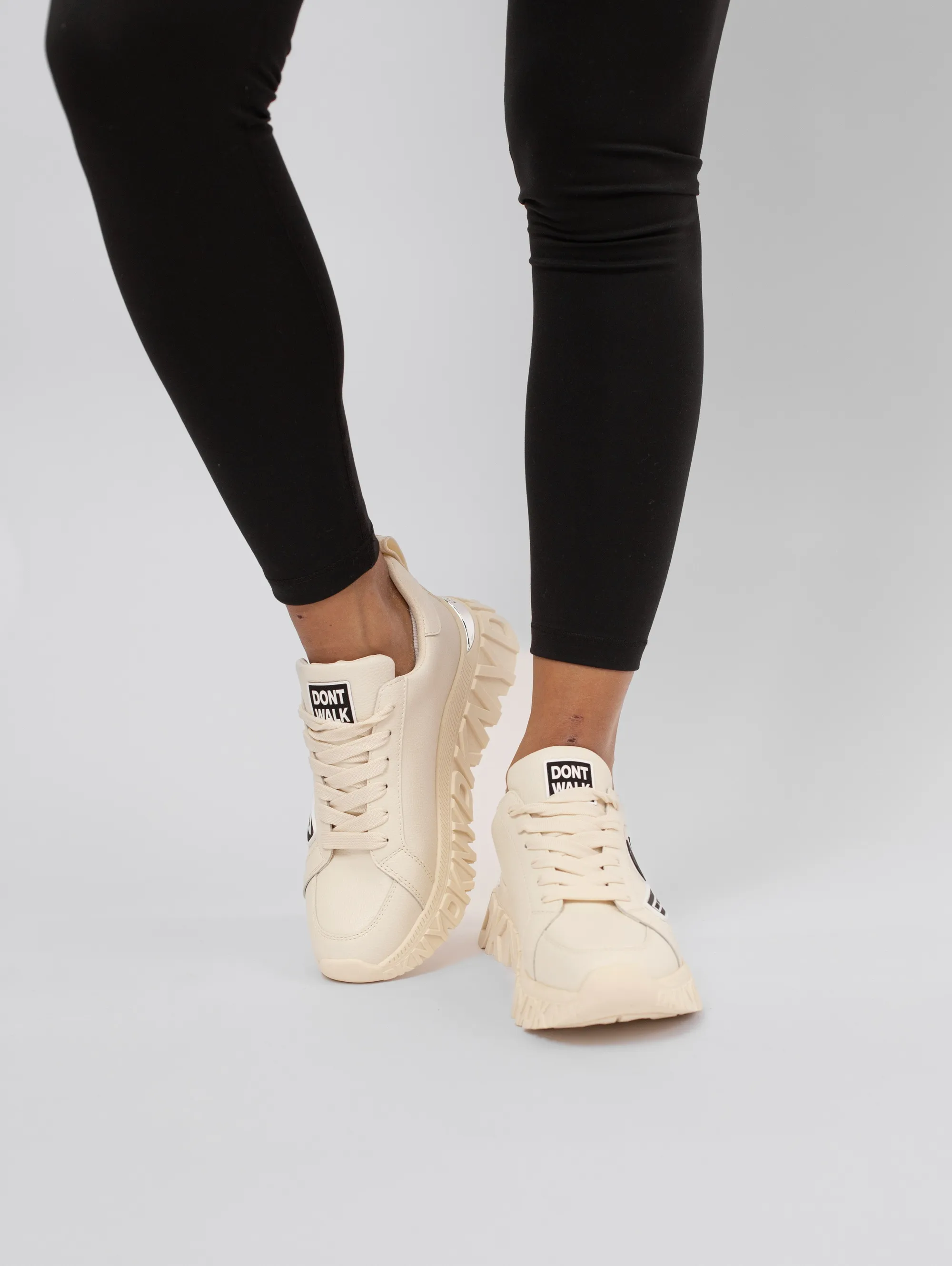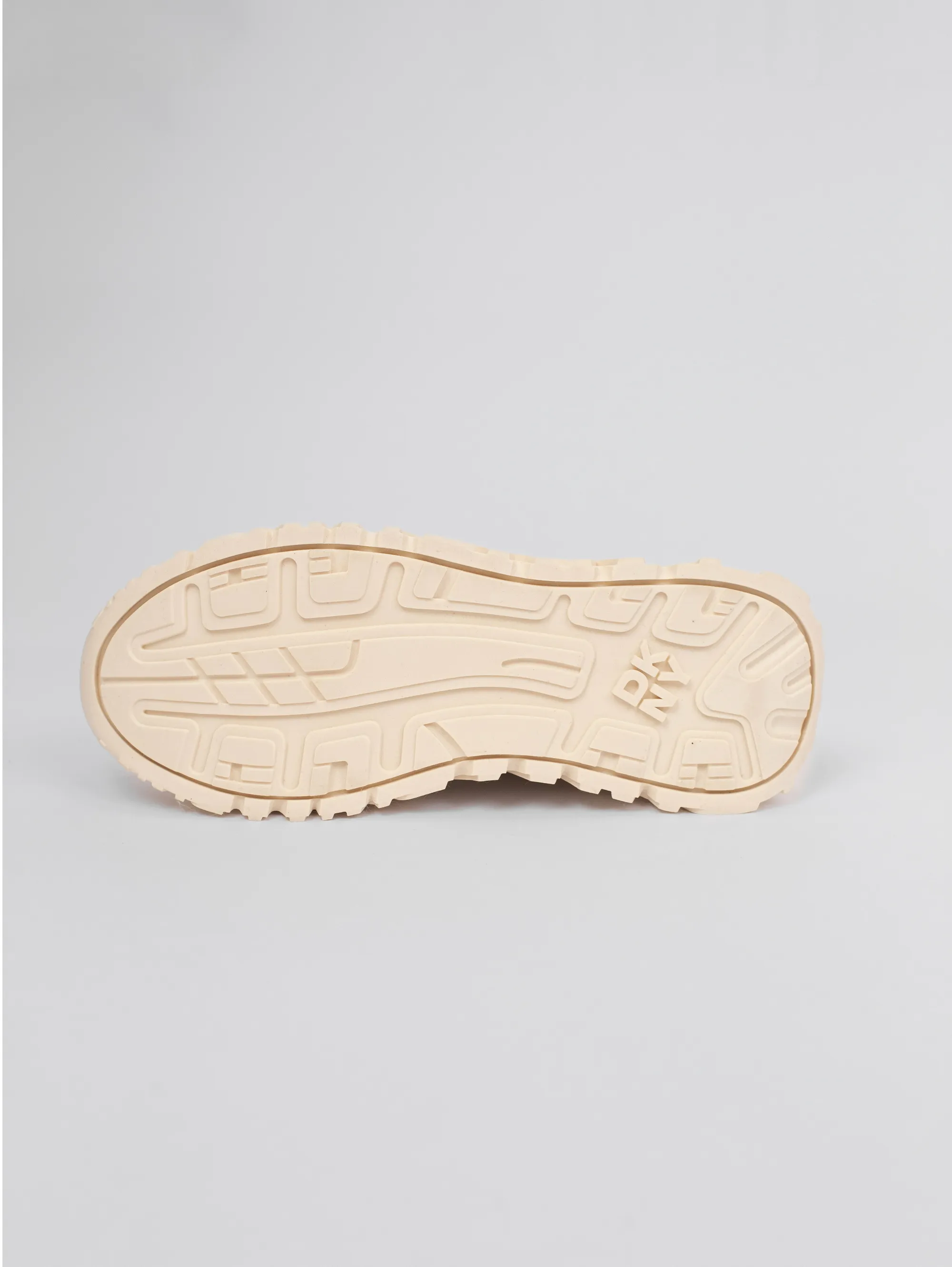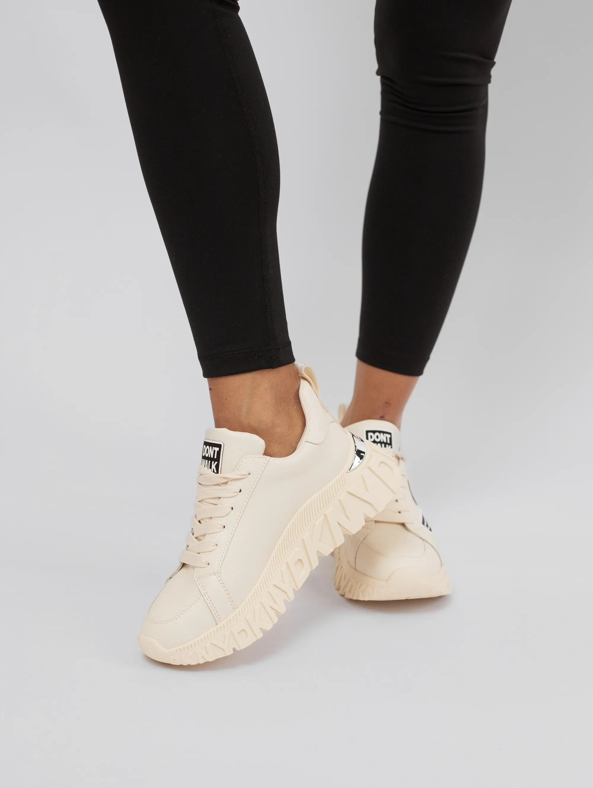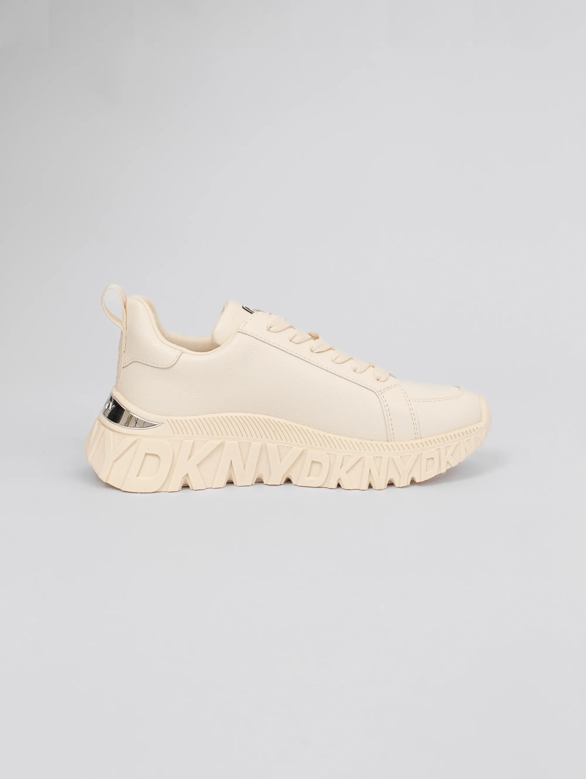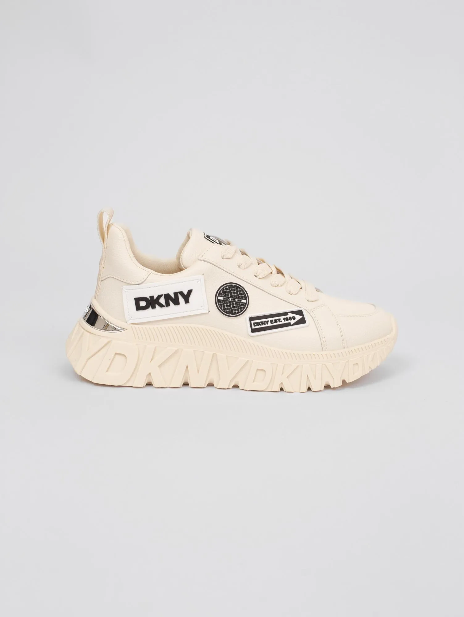 Женские кроссовки из натуральной кожи в молочном цвете от DKNY, созданные для динамичного городского ритма. Декорированы фирменными нашивками, а платформа дополнена рельефным логотипом бренда. Резиновая подошва обеспечивает надёжное сцепление и амортизацию при ходьбе.
