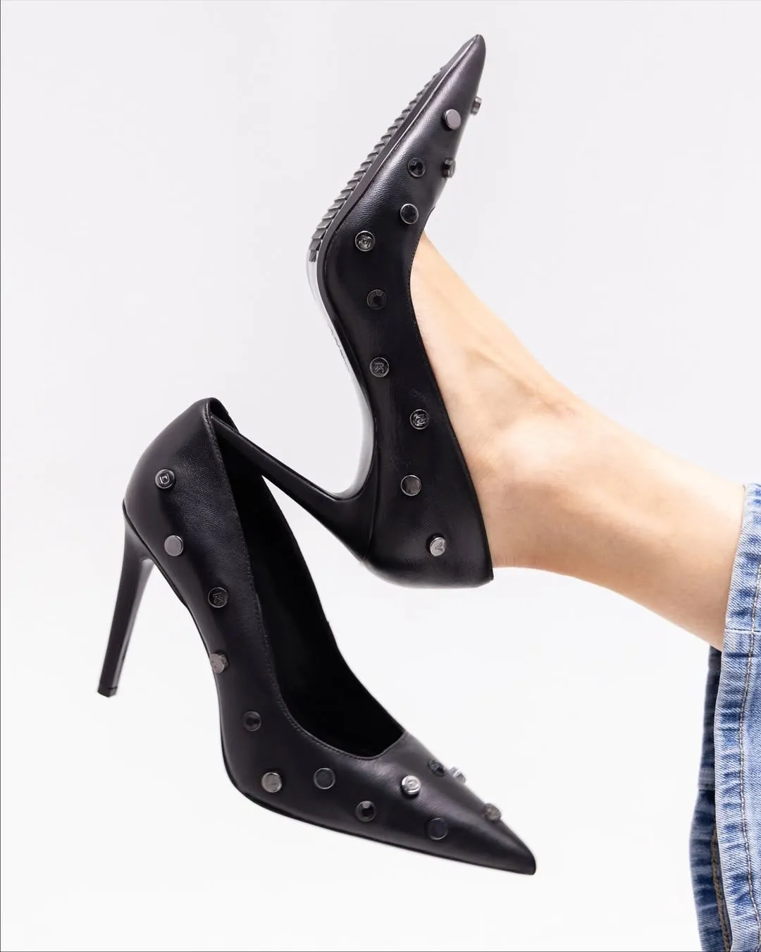Черные туфли-лодочки DKNY на высоком каблуке 10 см выполнены из натуральной кожи. Декорированы фирменными металлическими клепками и стразами, которые придают образу элегантность и выразительность. Идеальный выбор для стильных и уверенных в себе женщин.