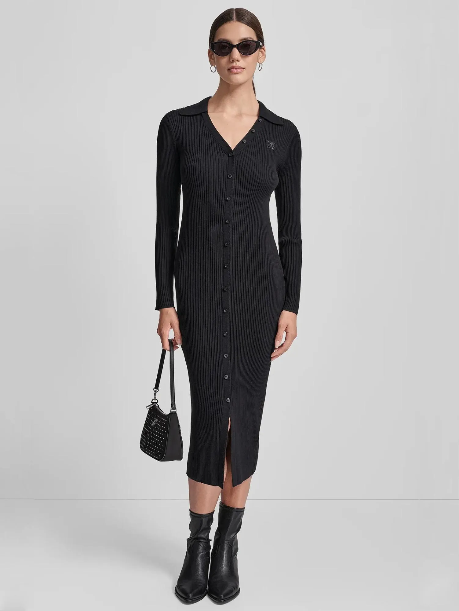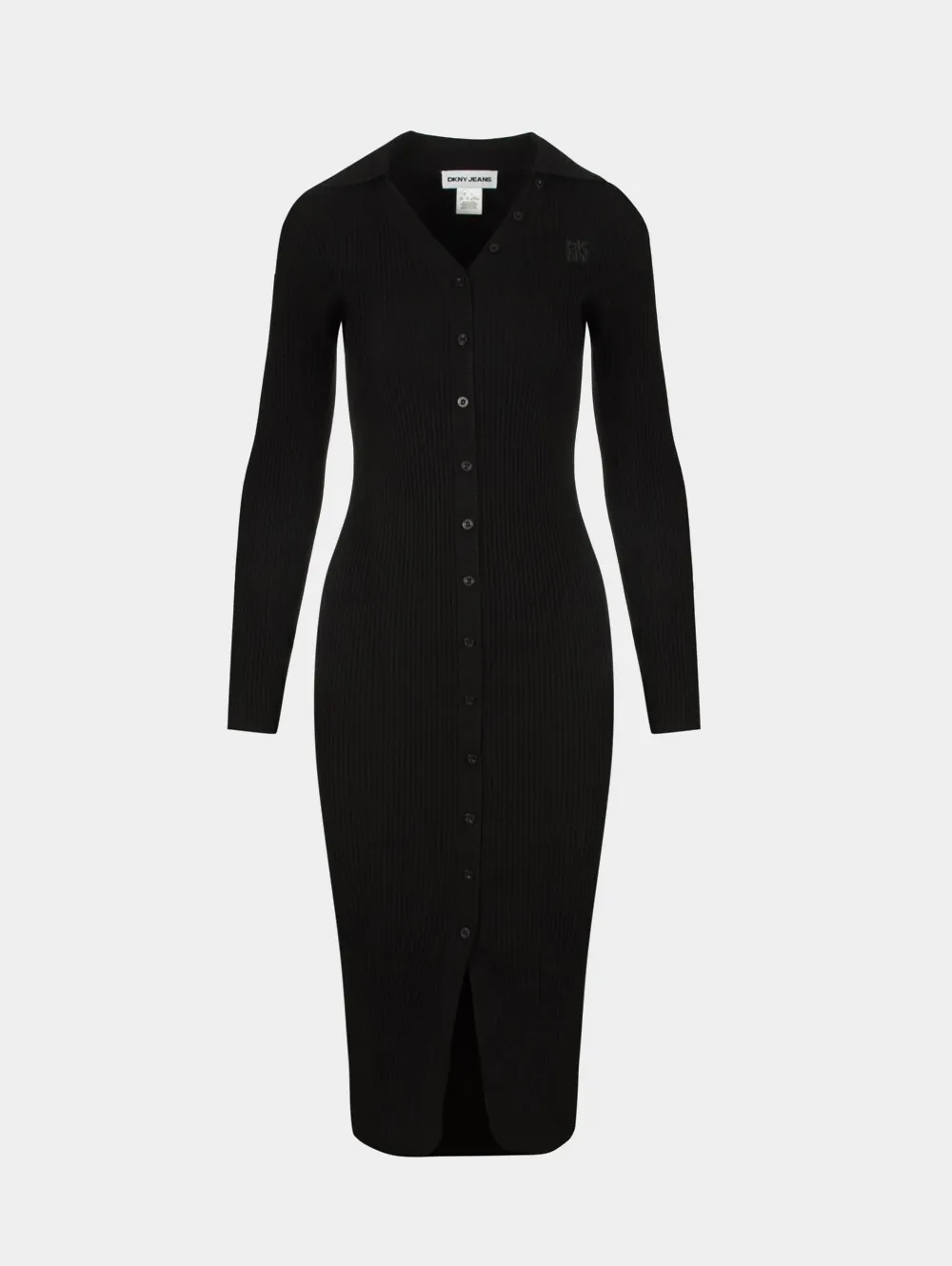 Черное трикотажное платье миди DKNY в рубчик с длинными рукавами — универсальная база для повседневных образов. Облегающий крой из мягкого трикотажа подчёркивает фигуру, а V-образный вырез с застёжкой на пуговицы добавляет акцент.