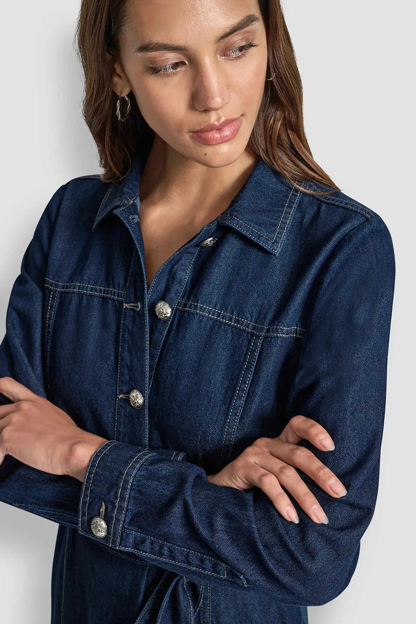 Женское джинсовое платье макси А-силуэта. Свободный крой и съёмный пояс позволяют легко менять посадку и образ. Застёжка на пуговицы дополняет лаконичный дизайн, а боковые разрезы обеспечивают лёгкость и комфорт в движении. Идеальный вариант для стильных повседневных выходов.