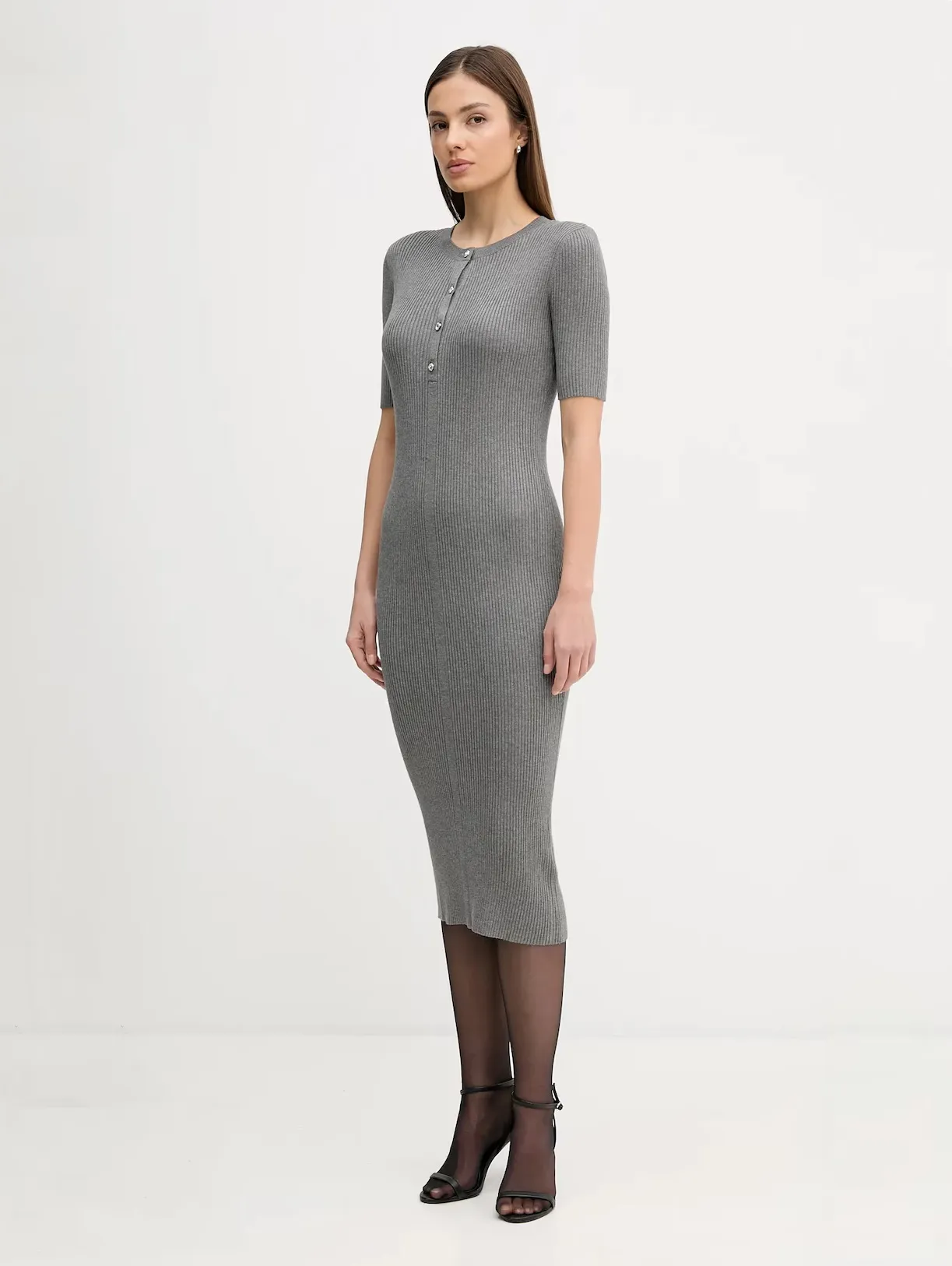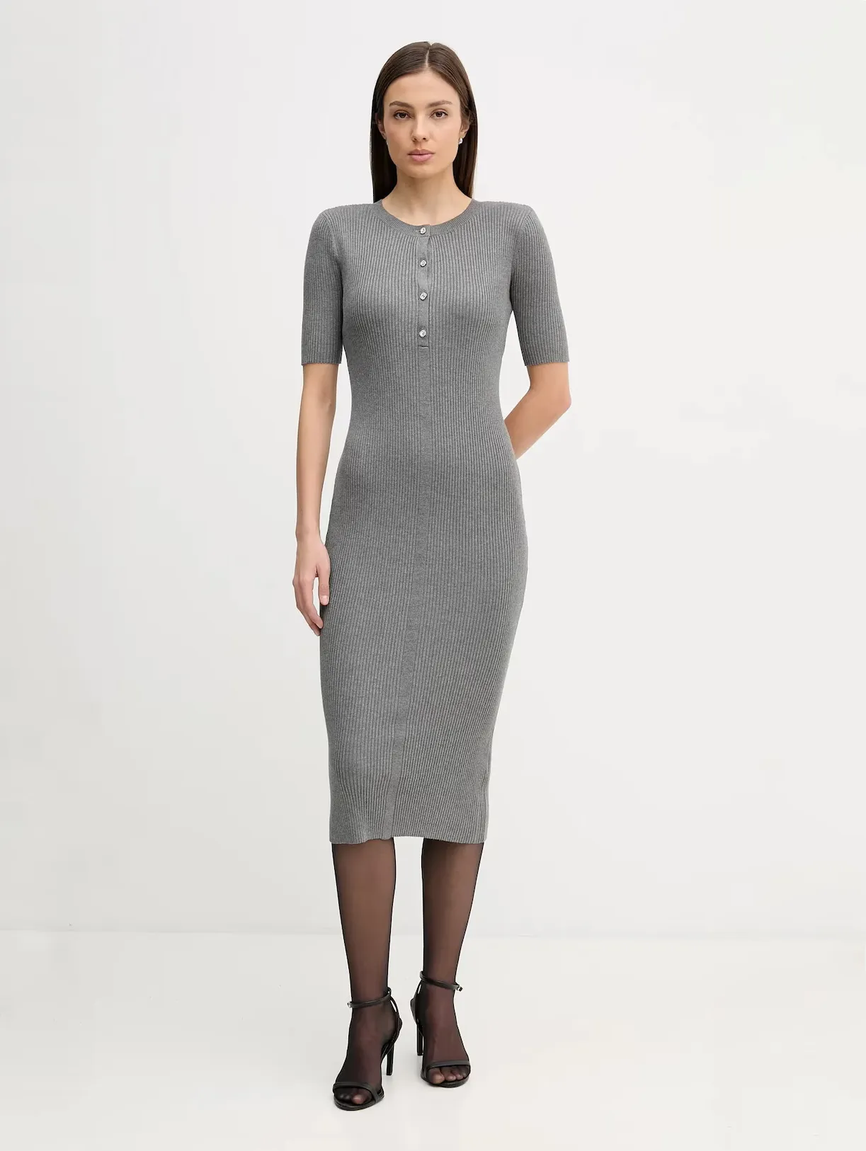 Женское трикотажное платье миди приталенного силуэта — элегантная модель для стильного повседневного и делового гардероба. Платье выполнено из мягкого эластичного трикотажа в рубчик, который красиво подчеркивает фигуру и обеспечивает комфортную посадку. Длина миди, короткий рукав и аккуратная планка с пуговицами придают образу современный и лаконичный вид. Идеальный вариант для офиса, прогулок и городских образов.