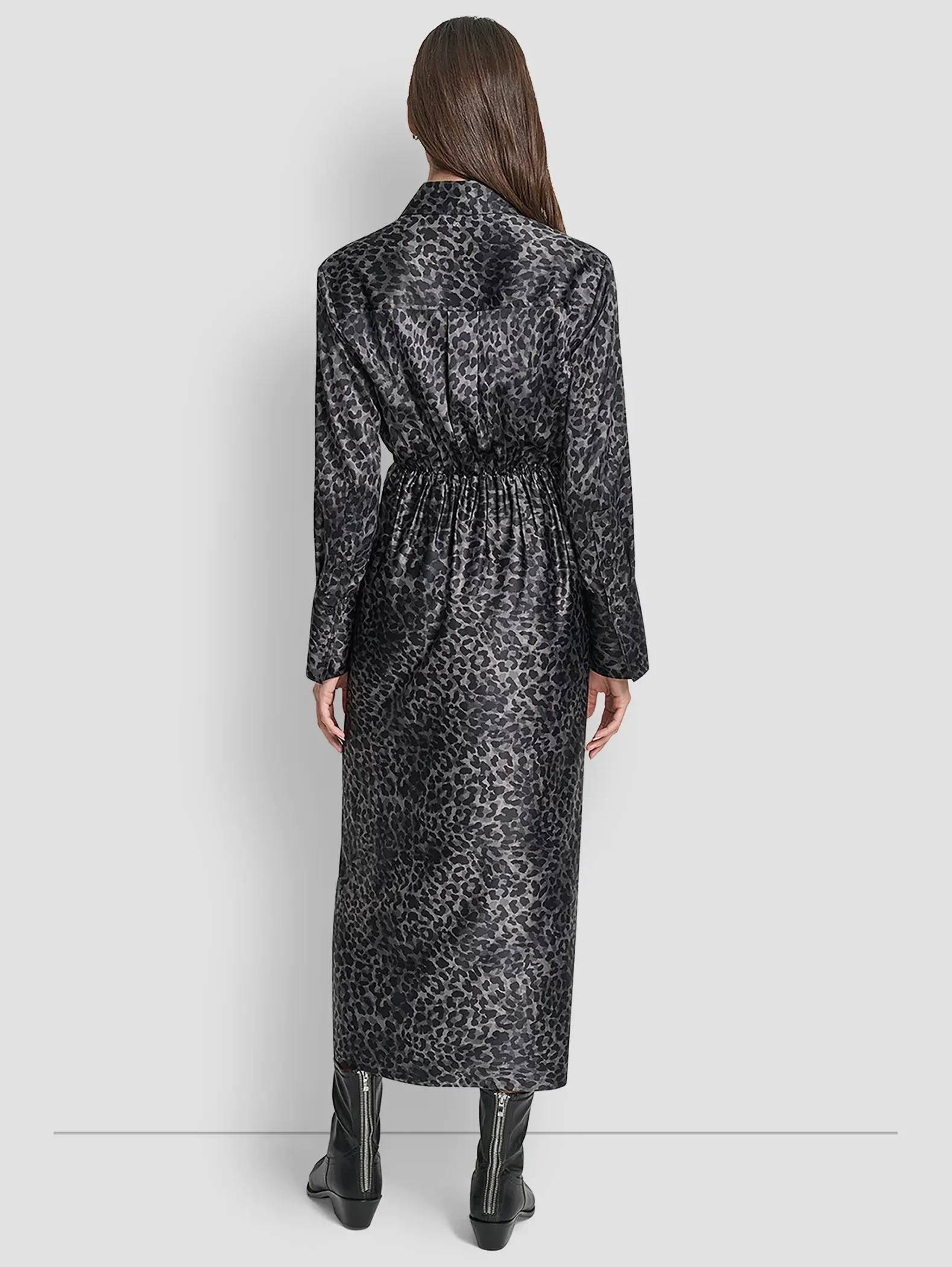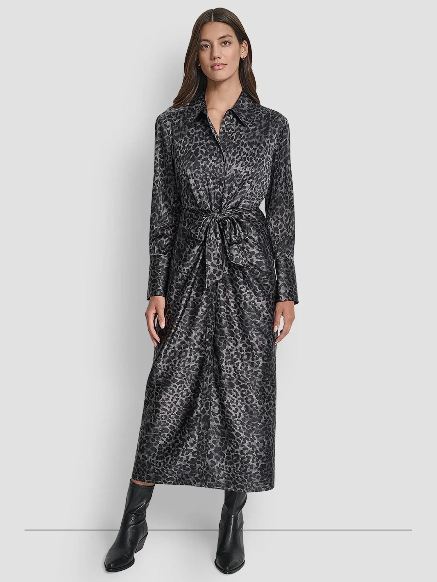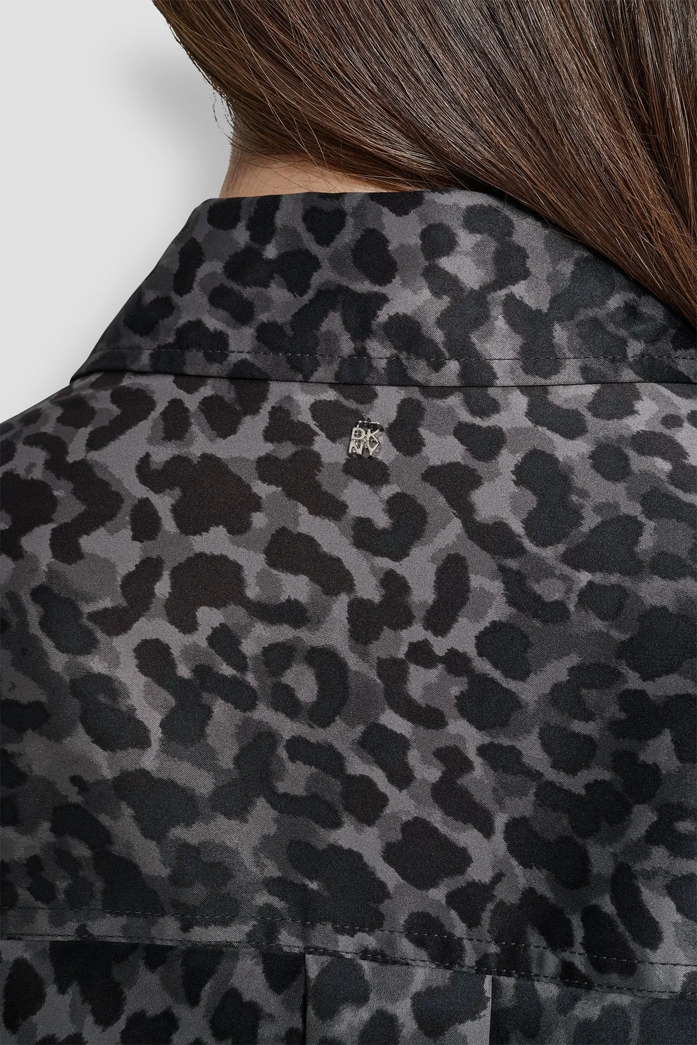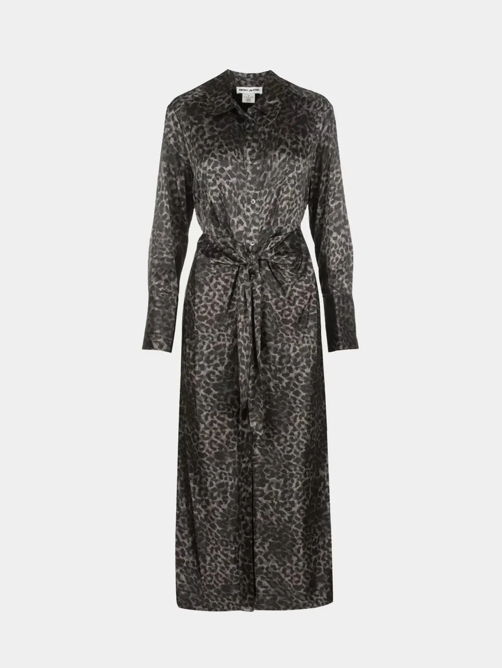 Женское платье-рубашка DKNY из атласа с леопардовым принтом в черном цвете создано для эффектных выходов. Длина миди смотрится утончённо и элегантно, пояс на талии подчёркивает фигуру, а эластичная вставка сзади дарит комфорт в движении. Классическая застёжка на пуговицы и смелый принт создают стильный контраст. Лёгкое и выразительное — платье, которое превращает каждый вечер в особенный.