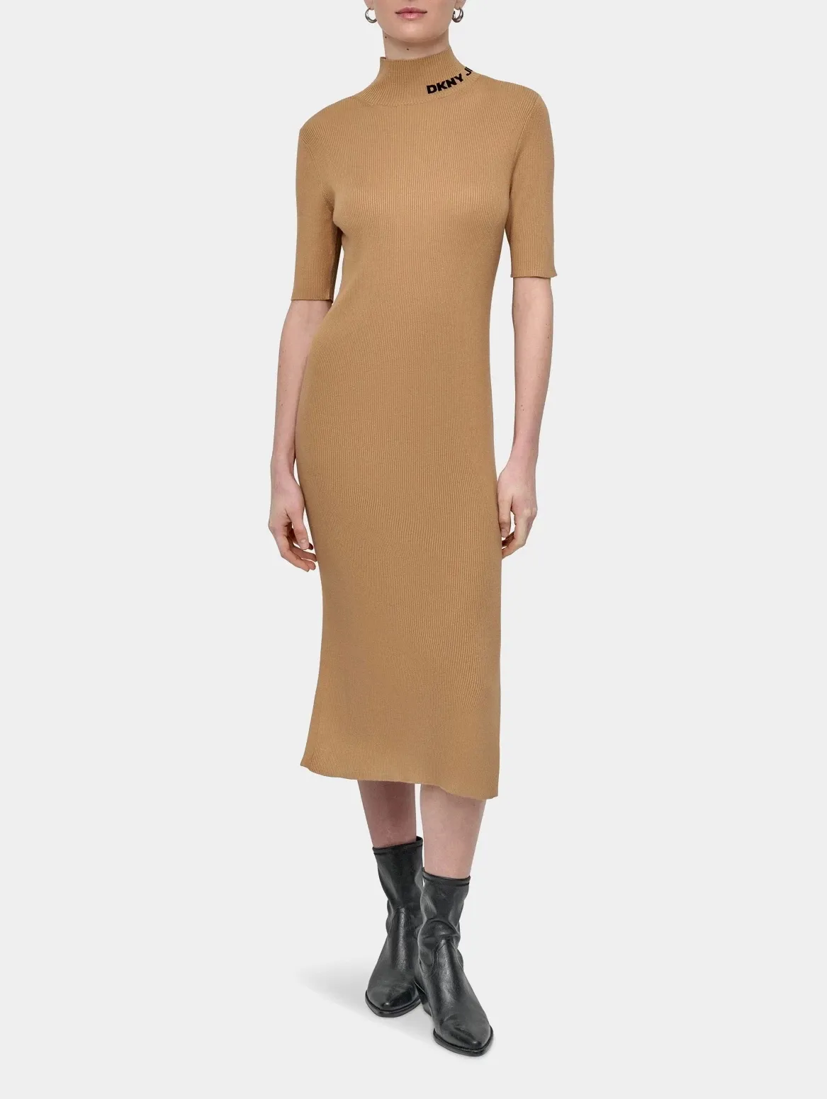 Светло-коричневое платье DKNY из тонкого эластичного трикотажа в мелкий рубчик. Облегающий крой подчёркивает силуэт, а разрезы по бокам и короткие рукава добавляют динамики.