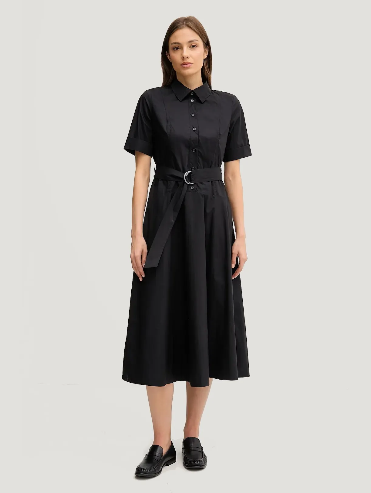 Платье миди из коллекции DKNY выполнено из хлопковой ткани, обеспечивающей комфорт в течение всего дня. Модель расклешённого кроя дарит лёгкость и свободу движений. Короткая застёжка на пуговицах, боковые карманы. Короткие рукава делают платье идеальным выбором для тёплой погоды. В комплект входит пояс, подчёркивающий талию.