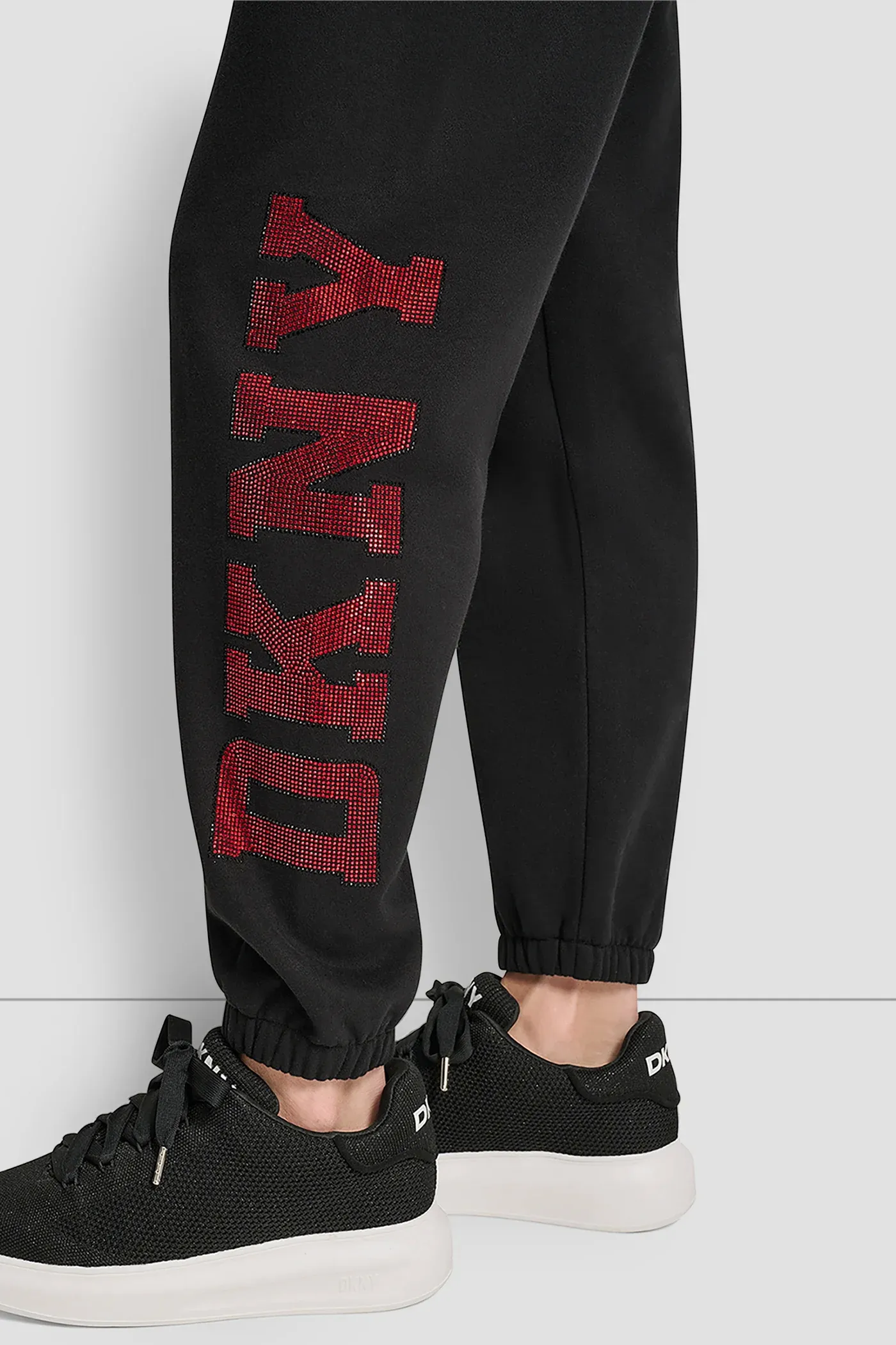 Женские спортивные брюки DKNY черного цвета выполнены из мягкого хлопка и украшены крупным контрастным логотипом со стразами. Прямой крой с манжетами, высокая посадка на талии. Модель дополнена боковыми карманами. Универсальный дизайн делает брюки отличным выбором для тренировок, прогулок и активного отдыха.