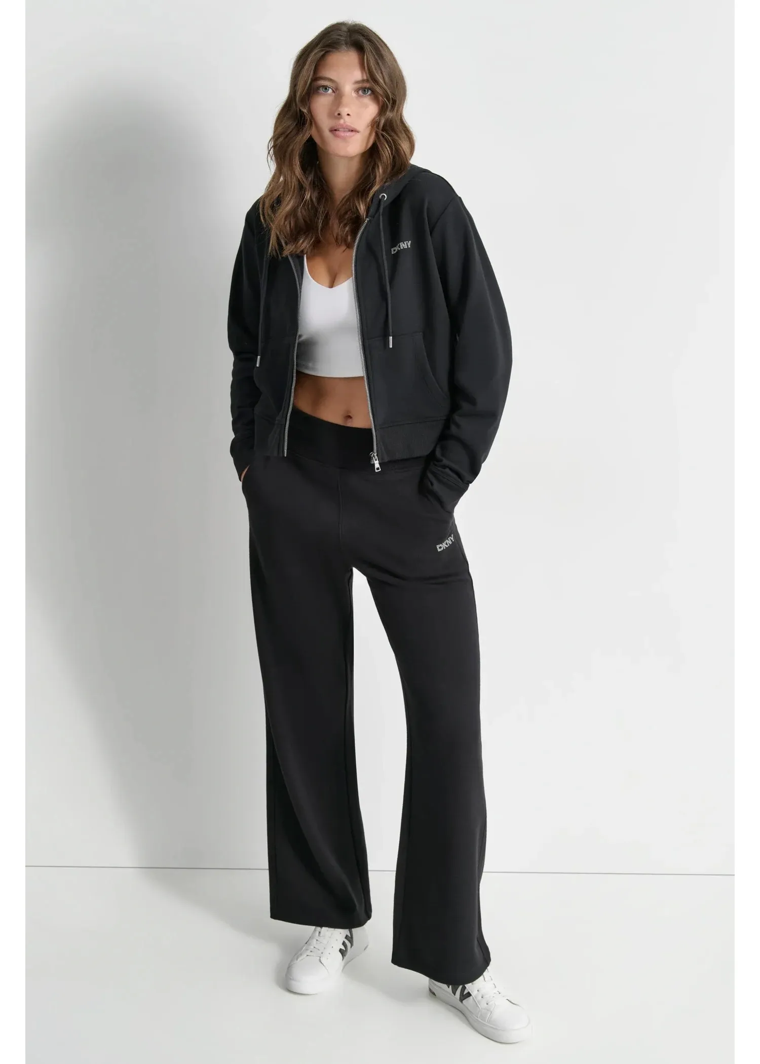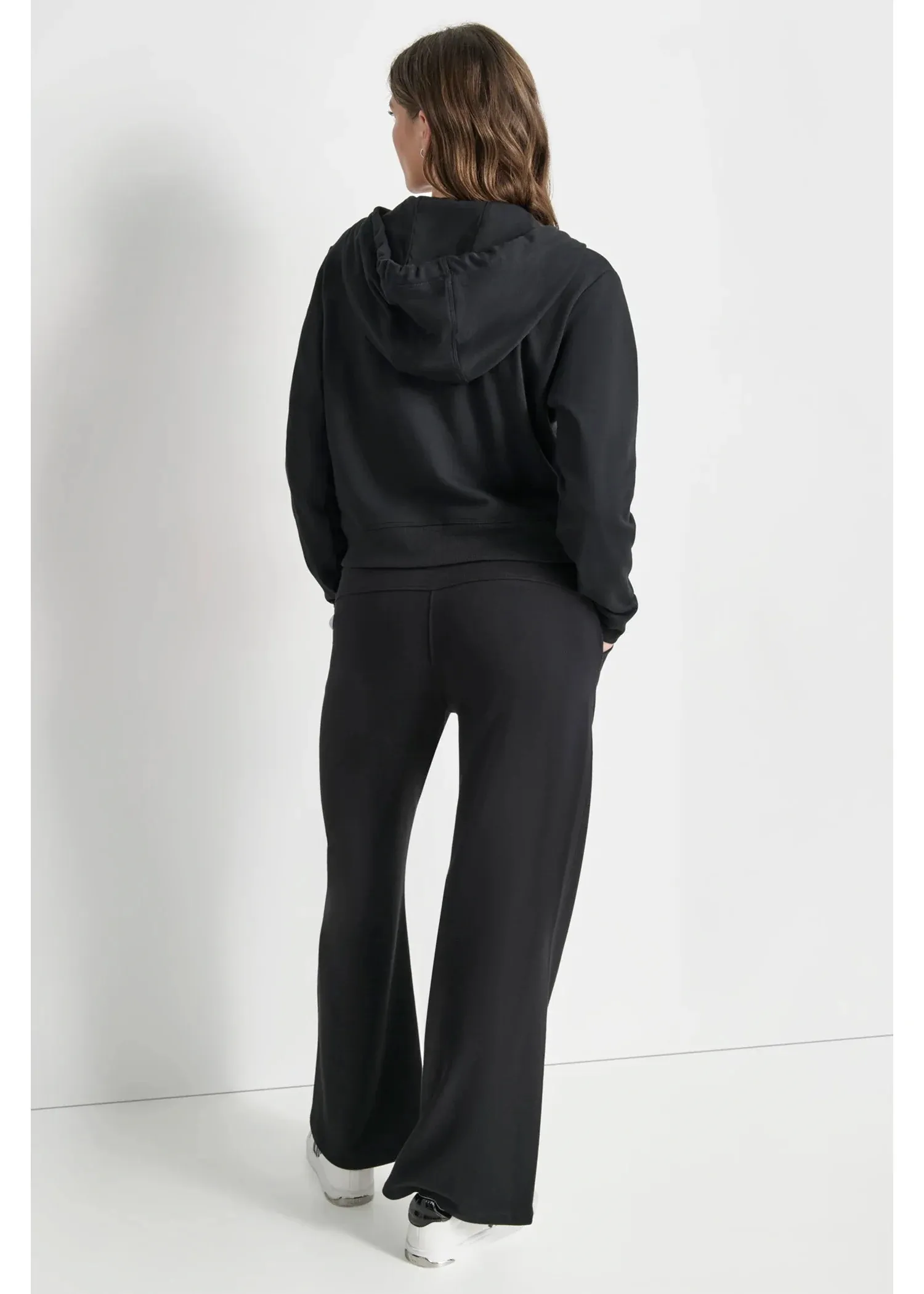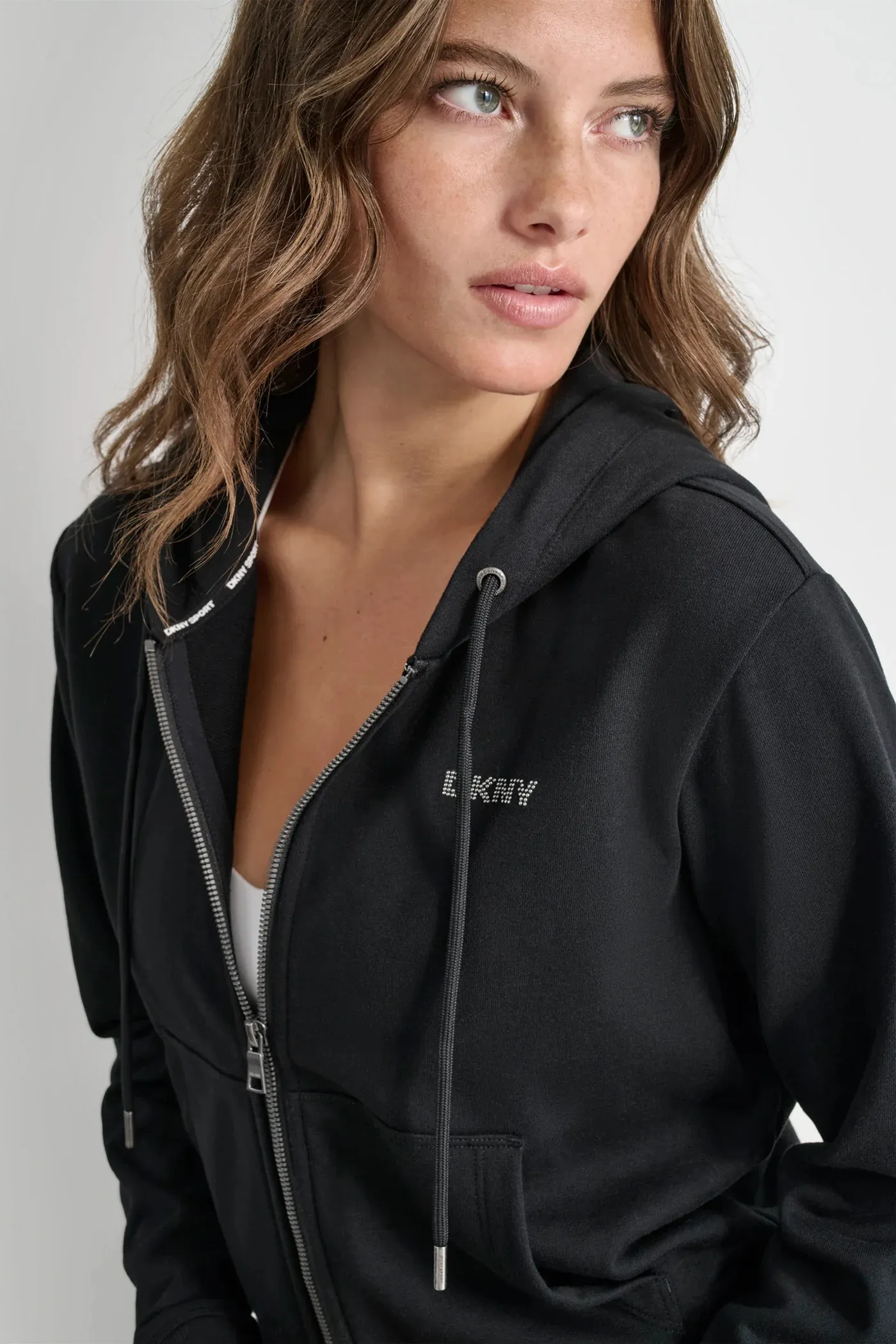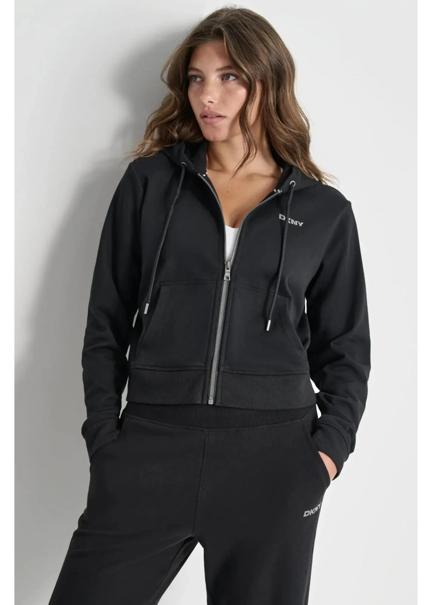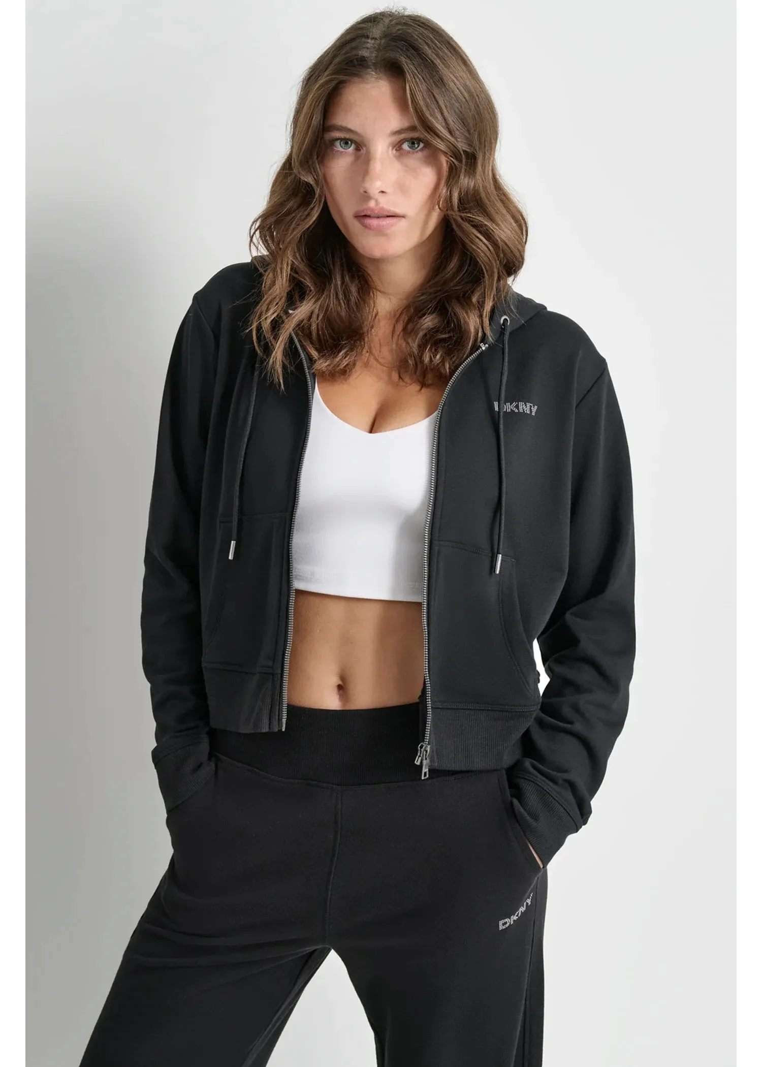 Женская укороченная спортивная толстовка DKNY с капюшоном черного цвета — стильное сочетание комфорта и функциональности. Модель на молнии, со свободным кроем и спущенной линией плеч, создает расслабленный силуэт и обеспечивает удобную посадку.