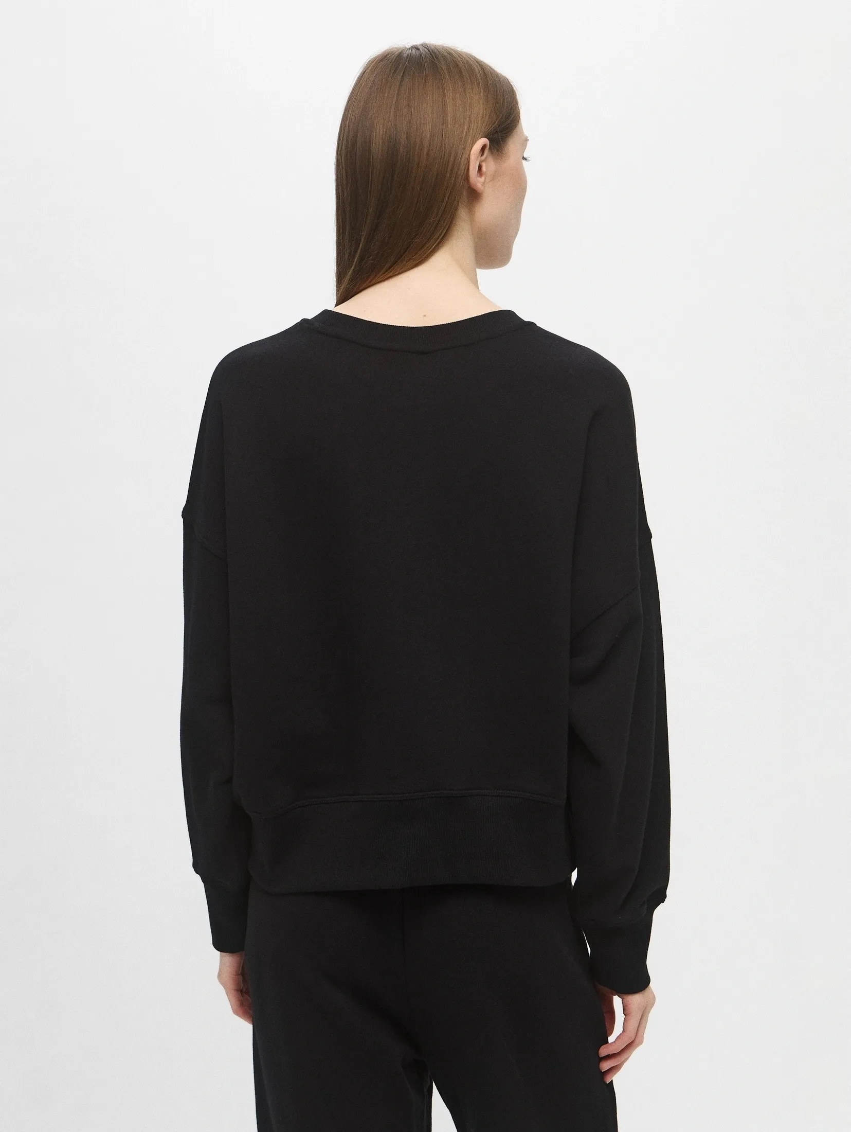 Женский оверсайз-свитшот DKNY чёрного цвета с логотипом из страз — комфорт с ярким акцентом. Мягкий материал, свободный крой и аккуратные трикотажные края создают идеальный образ для динамичных дней в городе.