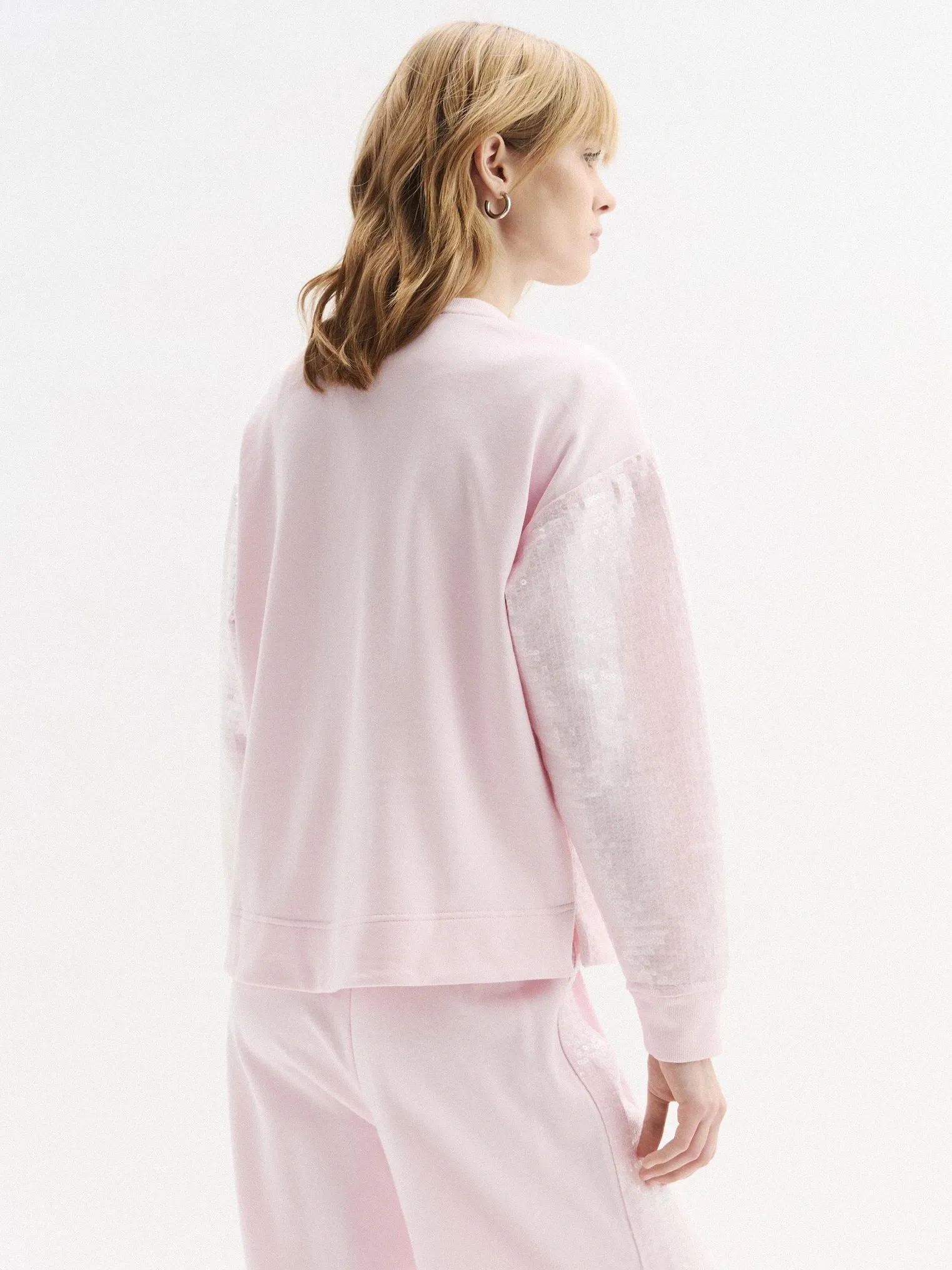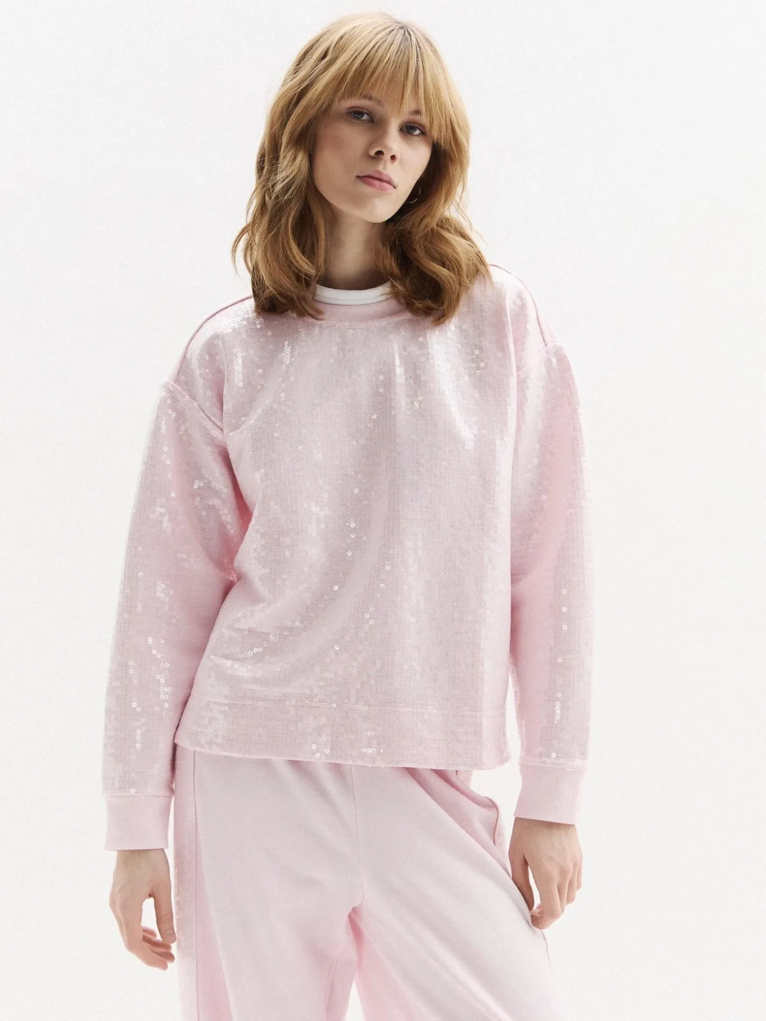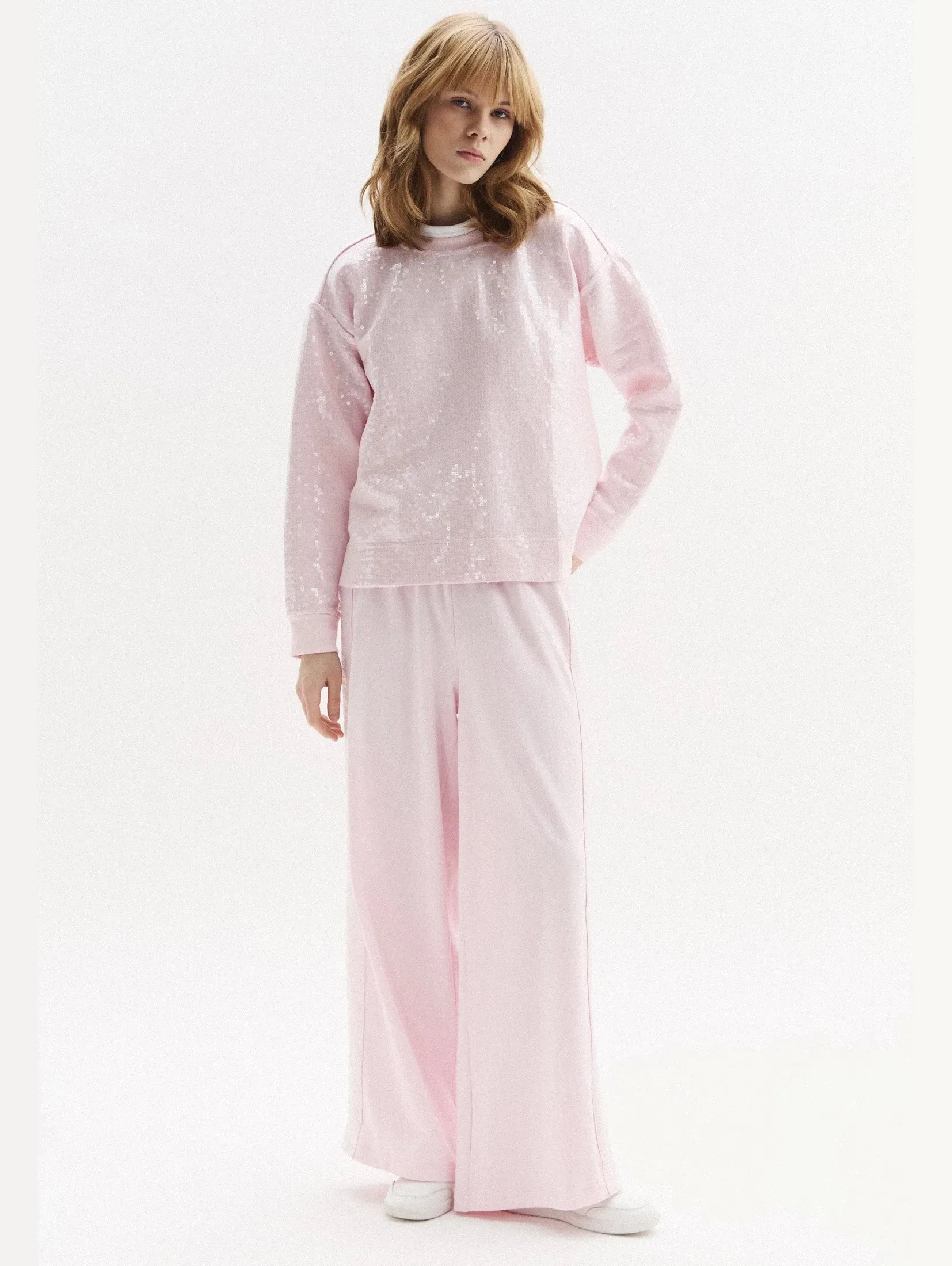 Женский укороченный свитшот из хлопка с добавлением полиэстера — удобная модель на каждый день. Мягкий футер приятен к телу и хорошо сохраняет форму. Свободный крой и спущенная линия плеч обеспечивают комфортную посадку. Пайетки спереди дополняют дизайн. Отлично сочетается с брюками из коллекции.