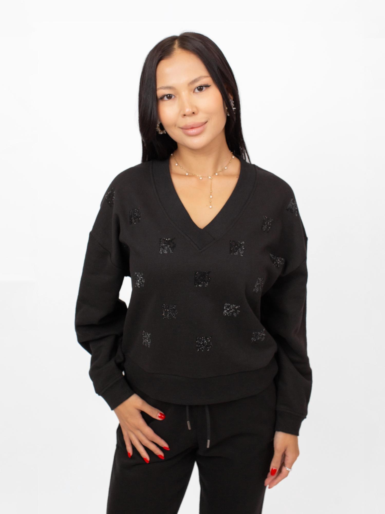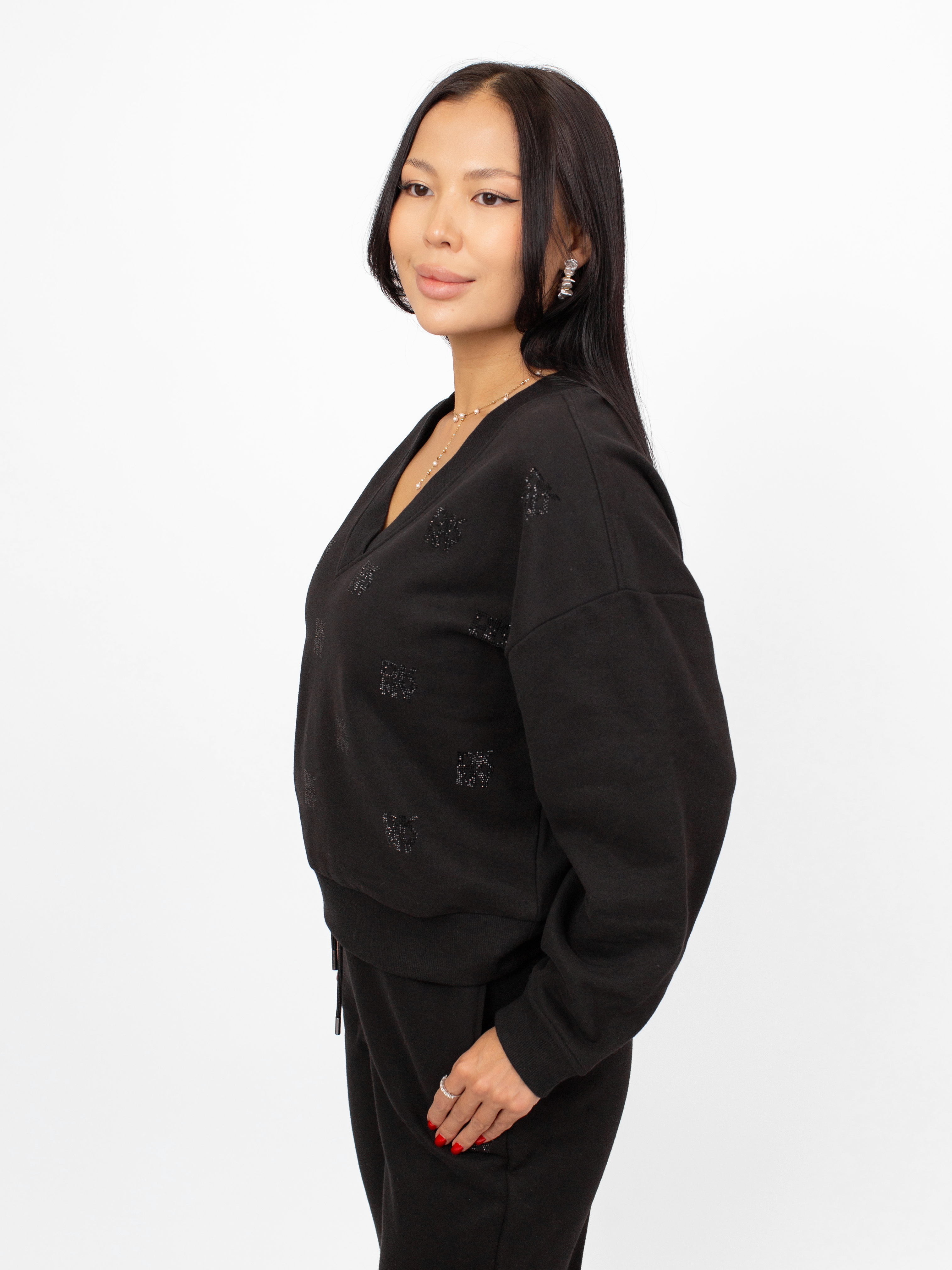 Женский оверсайз свитшот на флисе от DKNY — стильная и комфортная модель для повседневных образов. Свободный крой со спущенными рукавами и V-образным вырезом подчёркивает расслабленный силуэт, а блестящие логотипы из страз спереди добавляют эффектный акцент.