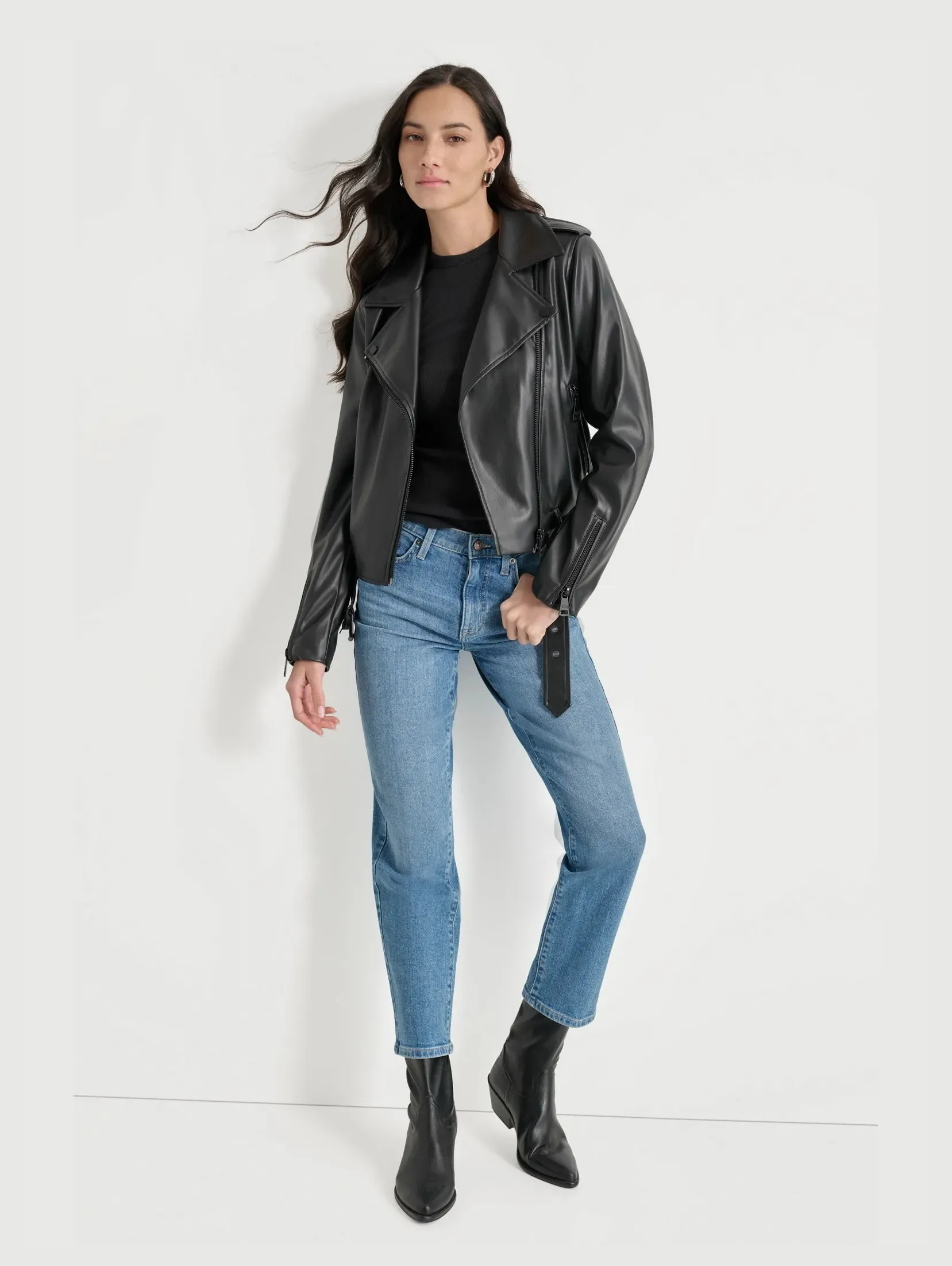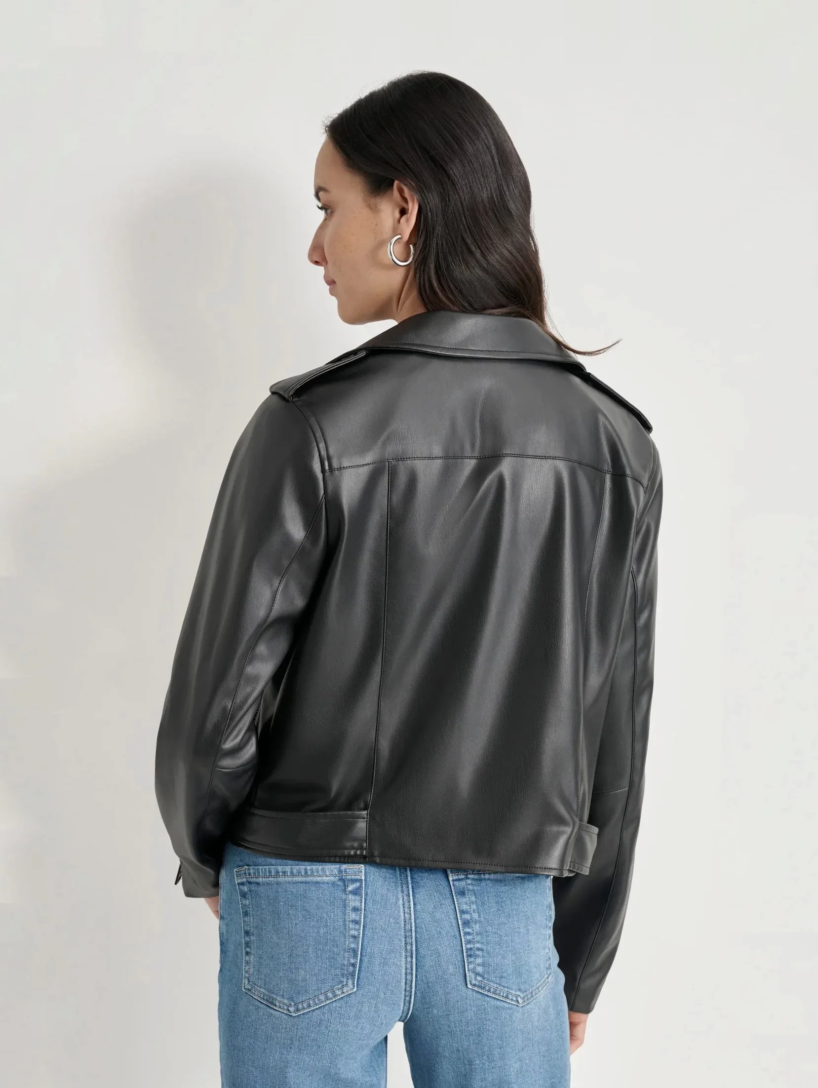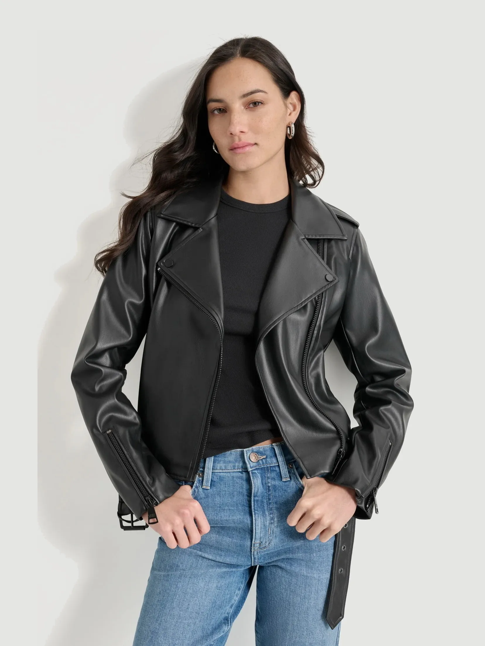 Женская кожаная куртка — стильная интерпретация классического мото-стиля. Модель выполнена из гладкой экокожи и дополнена асимметричной застёжкой-молнией, подчёркивающей дерзкий характер образа. Свободный крой и длина до бедра обеспечивают комфорт и универсальность в сочетании с любым гардеробом. Ремень на талии акцентирует силуэт, а застёжки-молнии на рукавах и боковые карманы придают куртке актуальный урбанистический характер. Идеальный выбор для стильных образов в прохладную погоду.