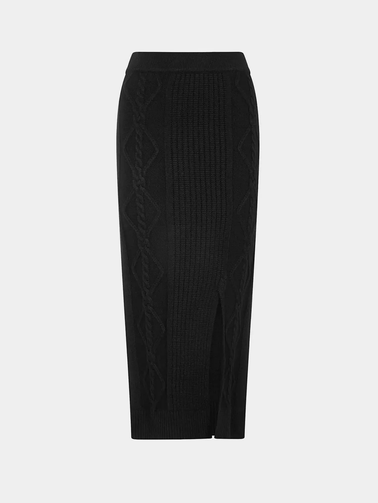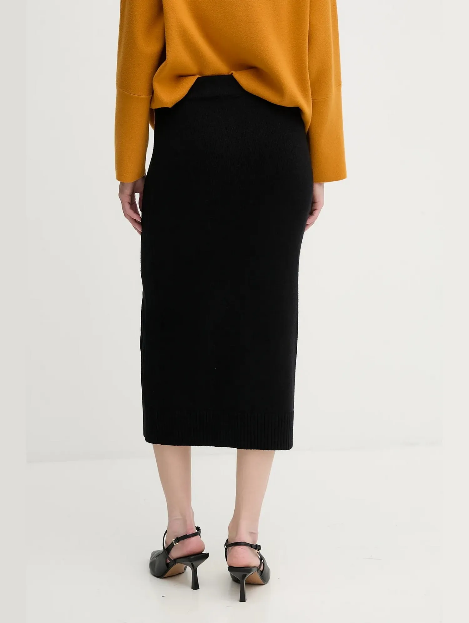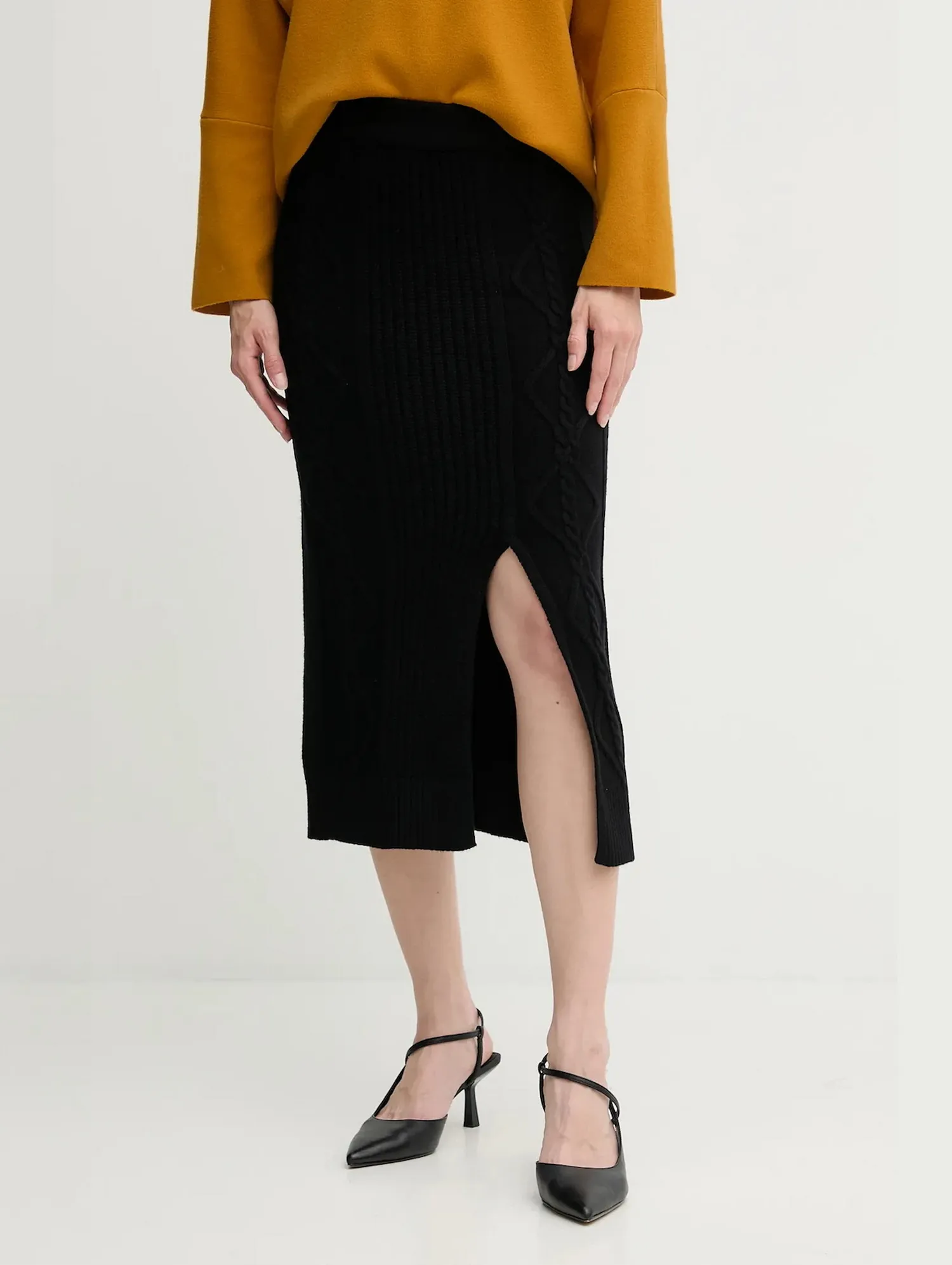 Женская трикотажная юбка-карандаш миди из осенней коллекции DKNY. Средняя посадка, эластичный пояс и разрез спереди создают комфорт и свободу движений. Вязаный декор спереди добавляет выразительный акцент. Дополните образ свитером из коллекции.