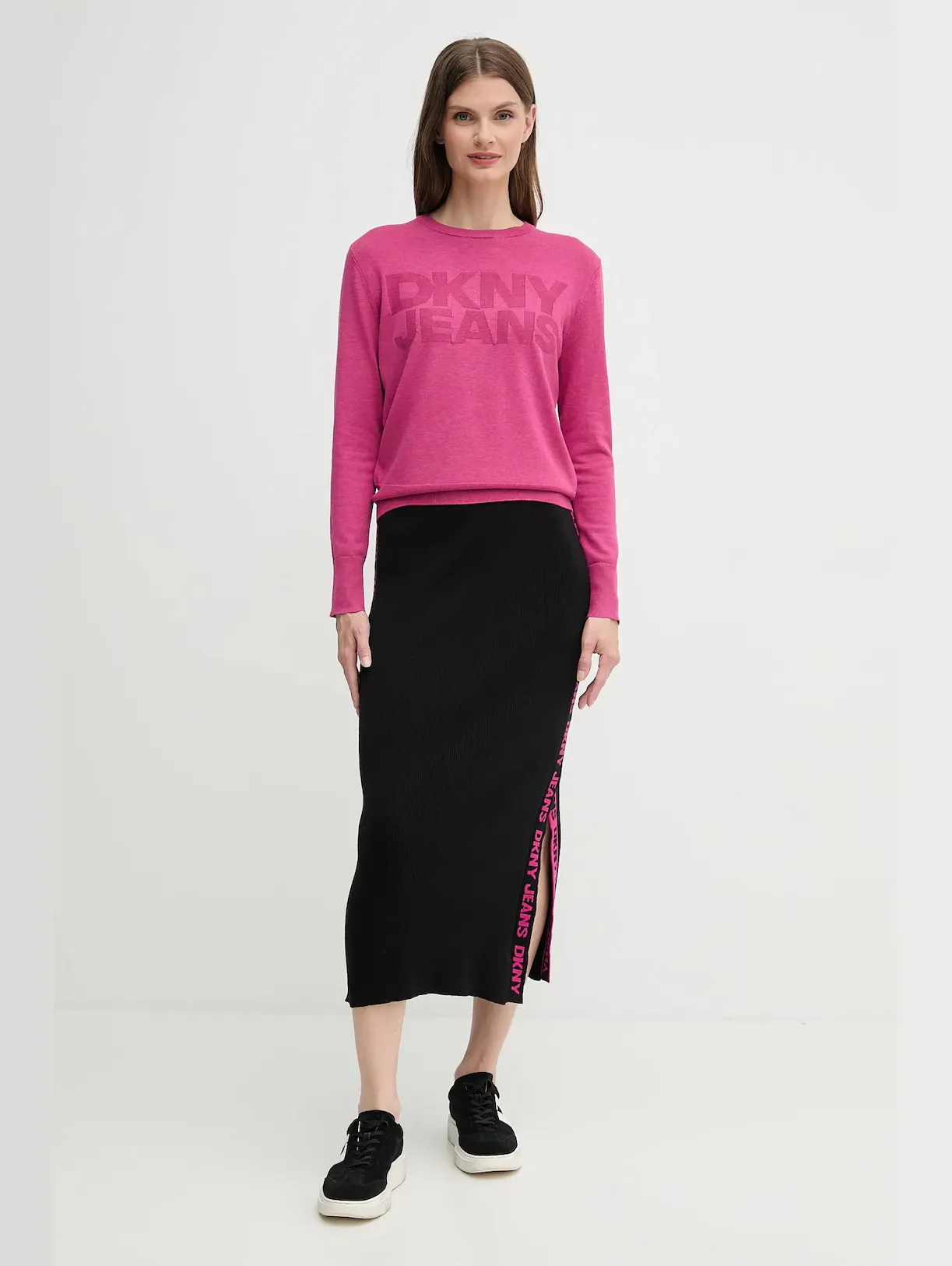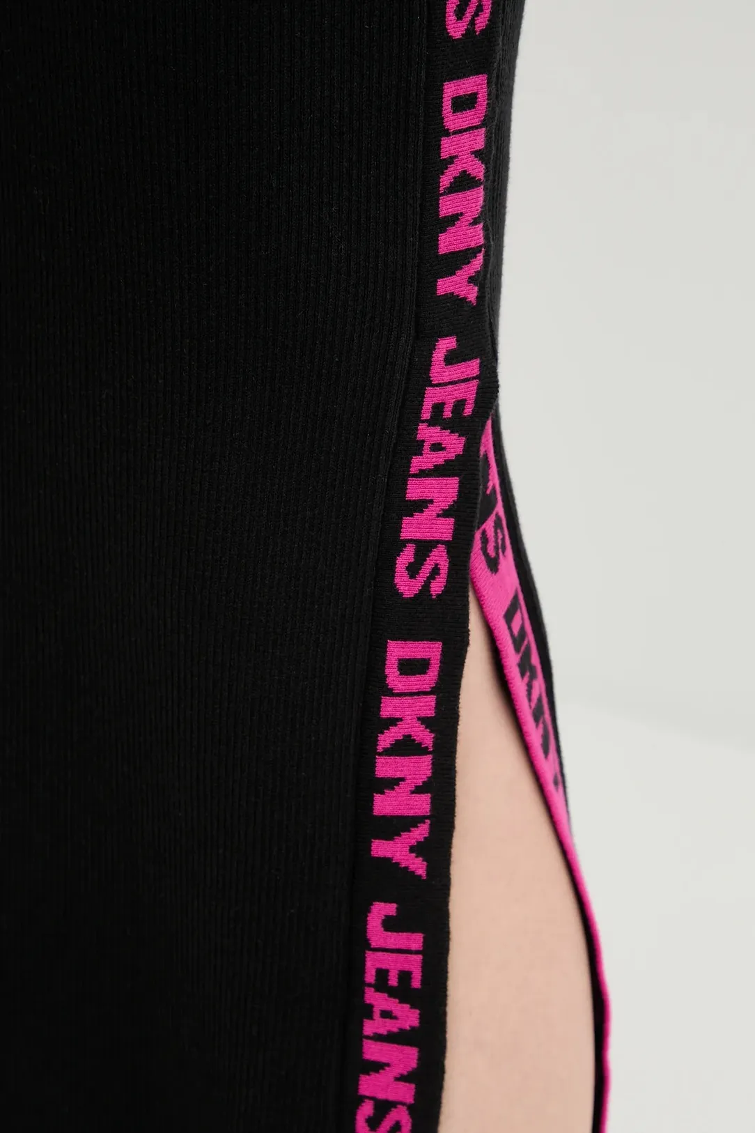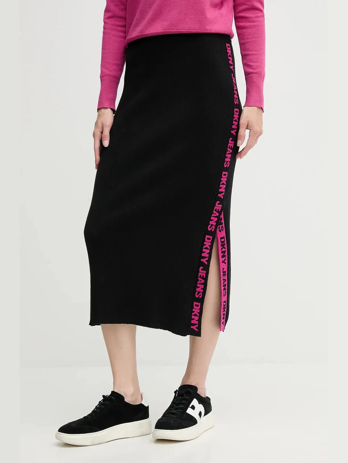 Чёрная юбка миди DKNY в рубчик с фирменной лентой по бокам — воплощение современного минимализма. Эластичный трикотаж обеспечивает комфорт и подчёркивает фигуру. Облегающий силуэт и боковые разрезы добавляют динамики, а длина миди делает модель универсальной — для повседневных и более формальных образов.