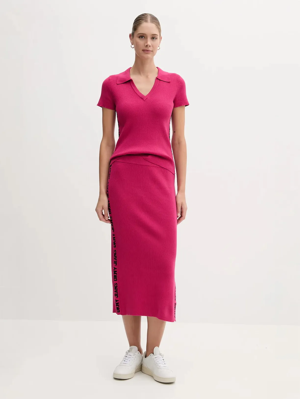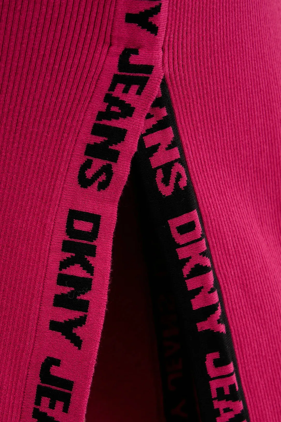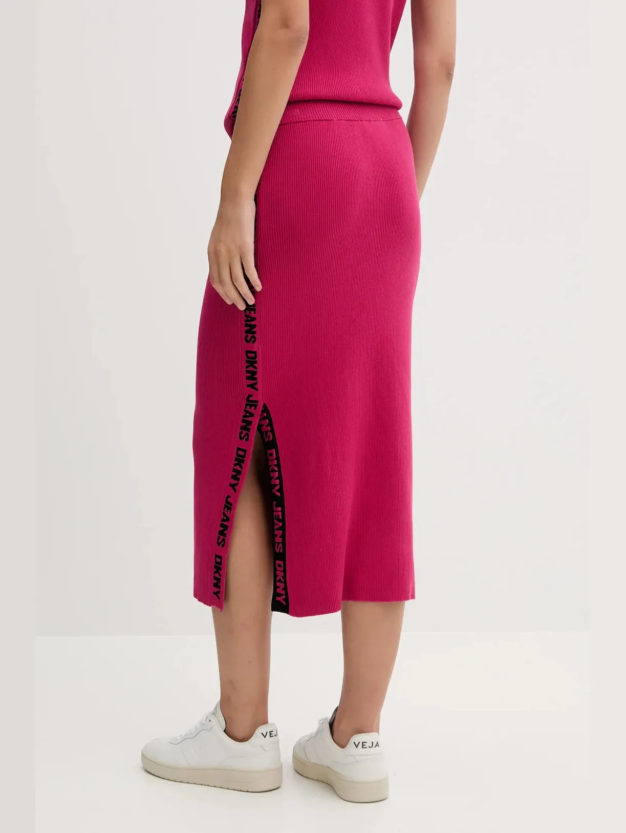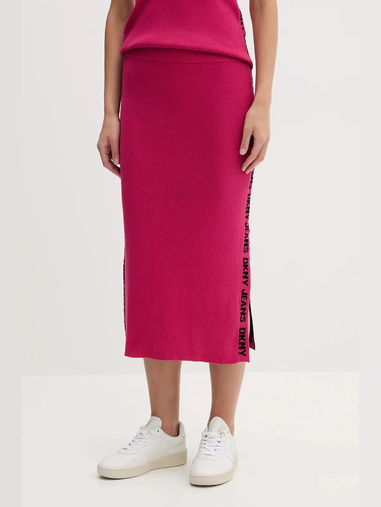 Женская юбка миди розового цвета от DKNY в рубчик с фирменной лентой по бокам — современный минимализм в действии. Эластичный трикотаж дарит комфорт и подчёркивает фигуру, а облегающий силуэт и боковые разрезы добавляют динамики. Универсальная длина миди подойдёт и для повседневных, и для более формальных образов.