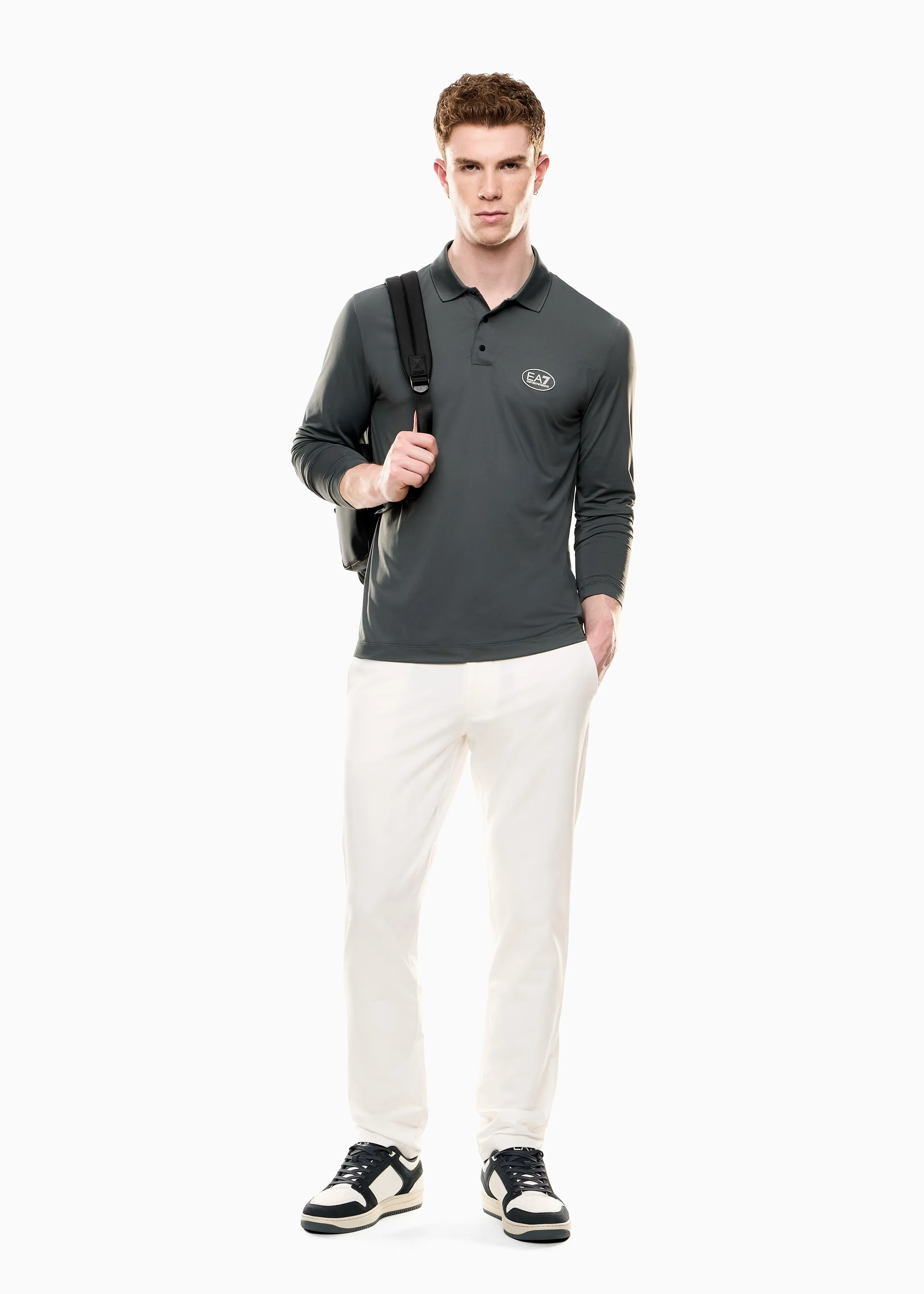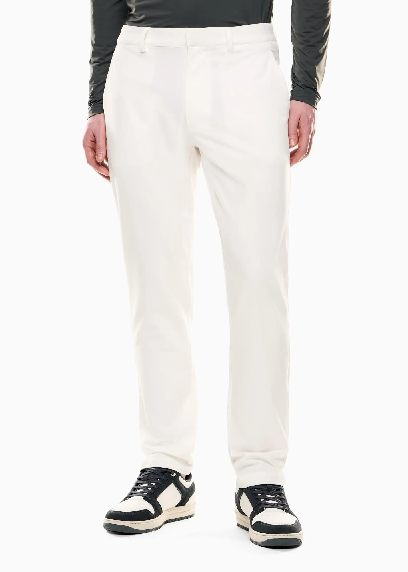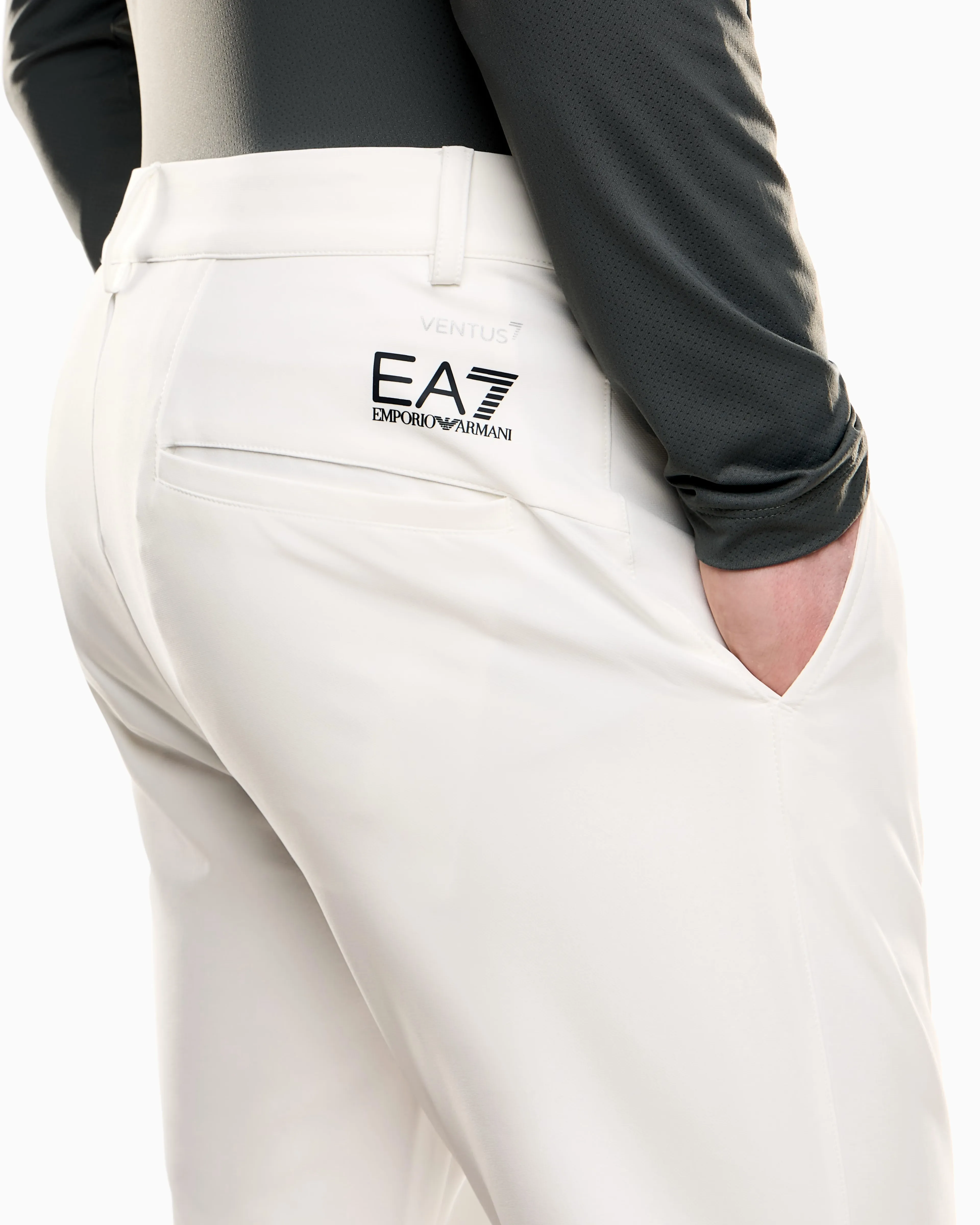 Мужские белые брюки из коллекции Golf Pro от EA7 Emporio Armani — универсальный выбор для игры в гольф и активных будней. Модель из высокотехнологичной ткани VENTUS7 обеспечивает комфорт и свободу движений в любых погодных условиях. Прямой, слегка зауженный крой, застёжка на молнию и пуговицу, пояс с петлями, боковые и задние карманы. Контрастный логотип EA7 добавляет фирменный акцент. Стиль, функциональность и комфорт — в каждой детали.