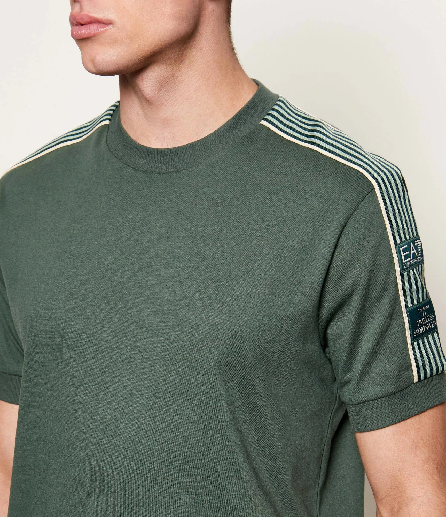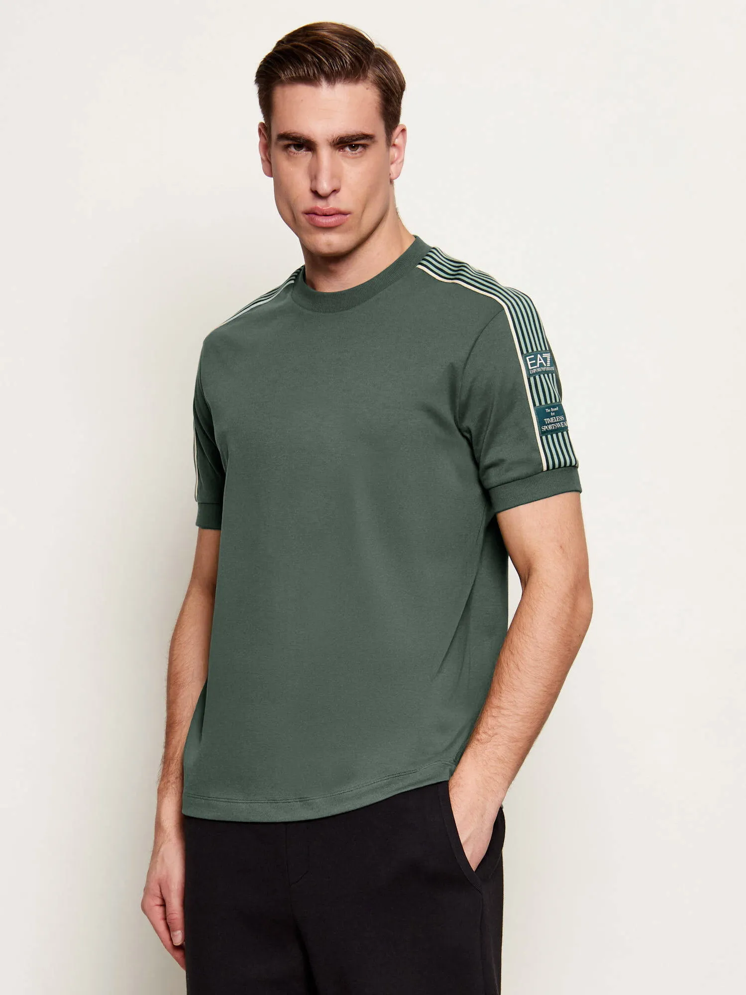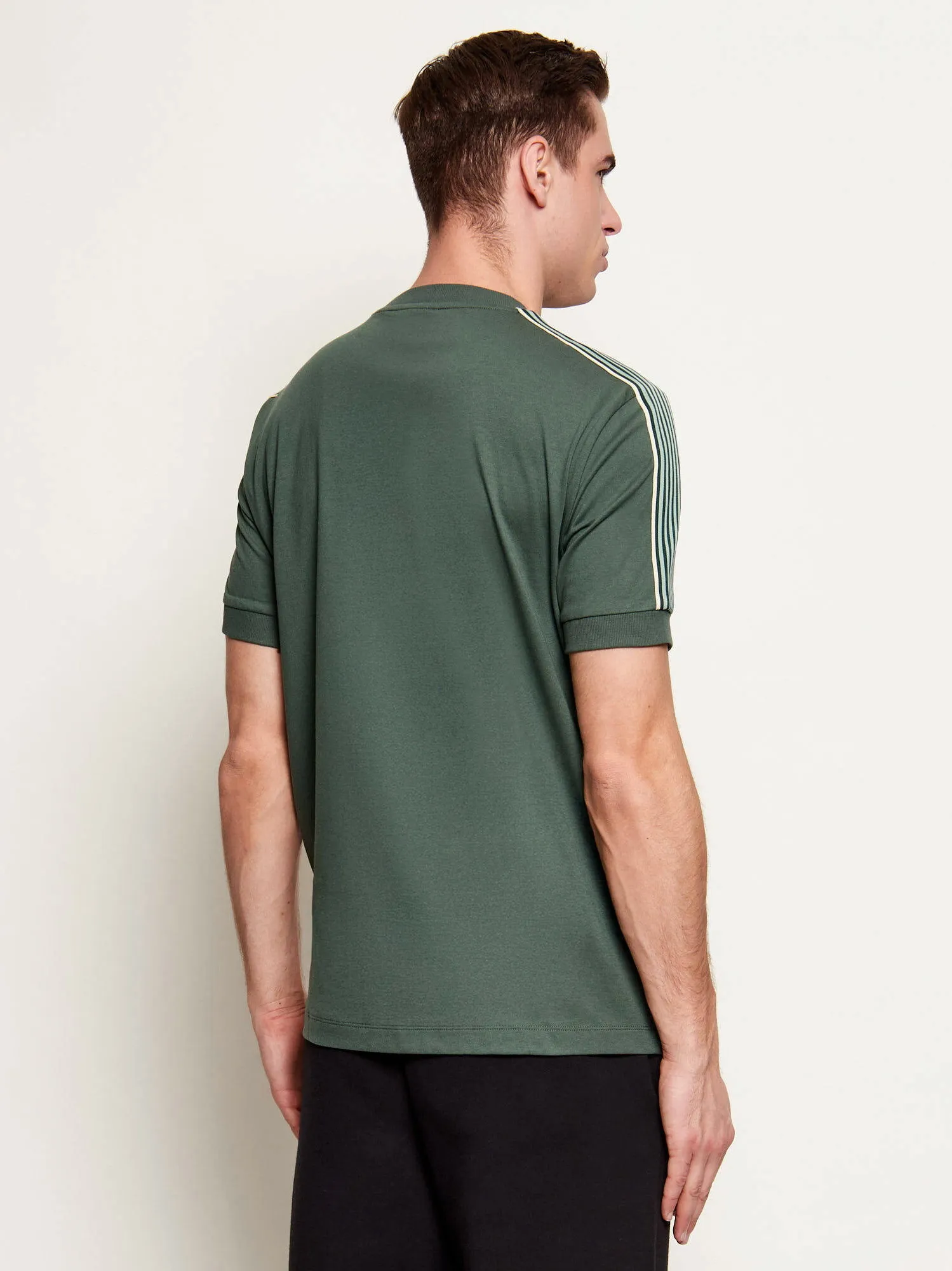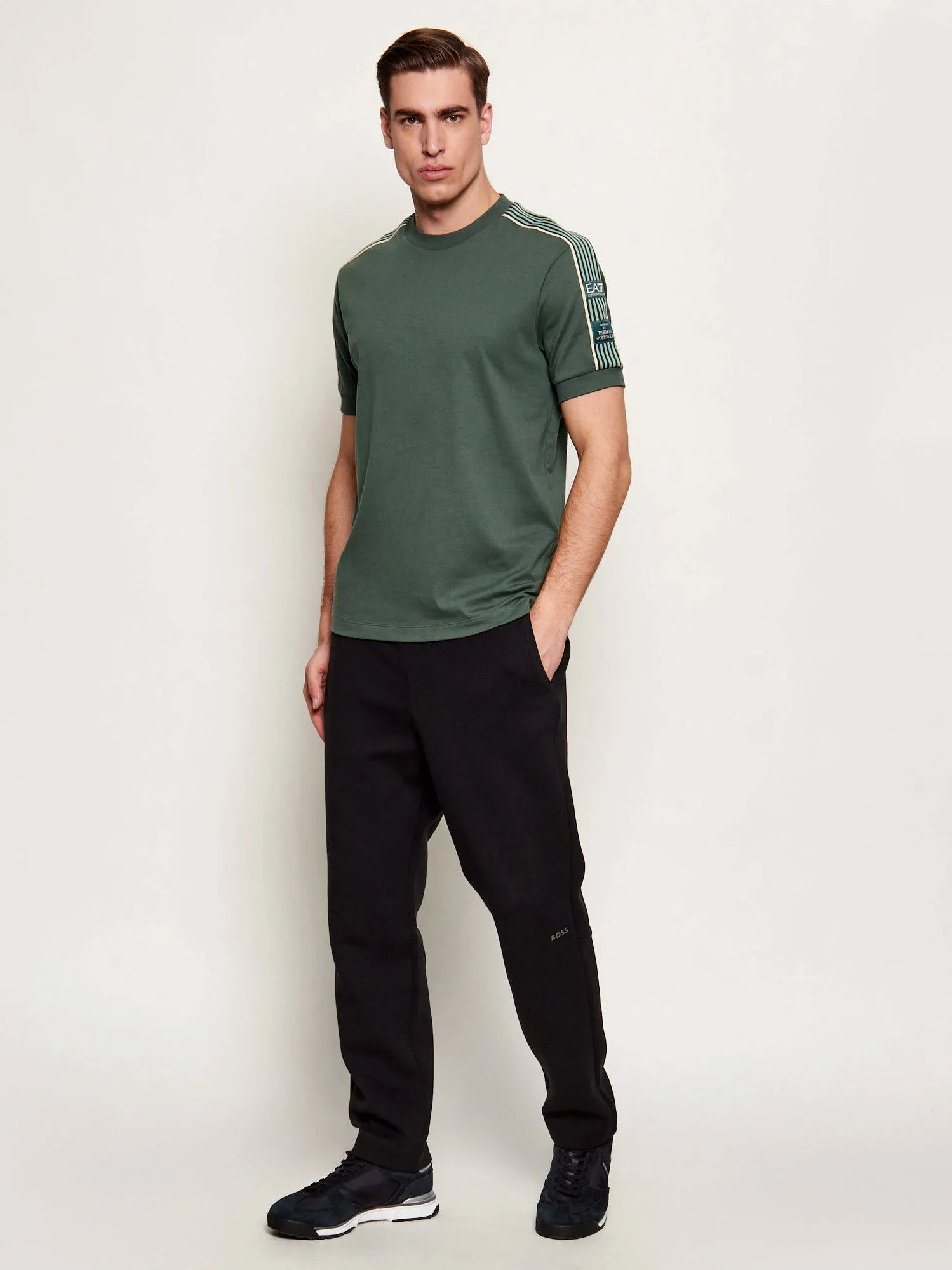 Мужская футболка с короткими рукавами и круглым вырезом выполнена из мягкого хлопка с добавлением полиэстера. Модель украшена фирменной лентой на плечах и контрастным логотипом бренда на груди. Универсальная вещь, которую легко сочетать с джоггерами из коллекции, создавая спортивный образ.