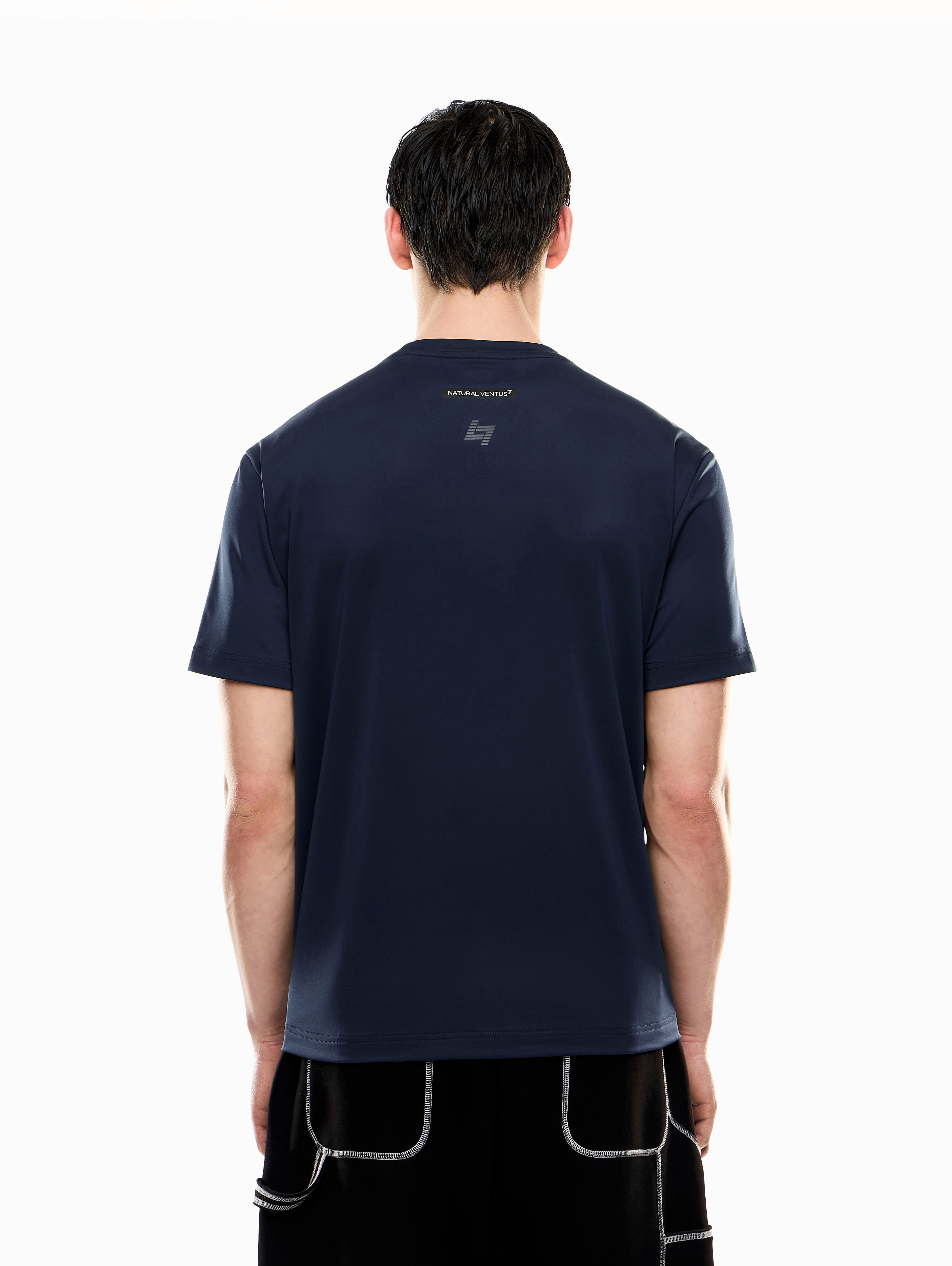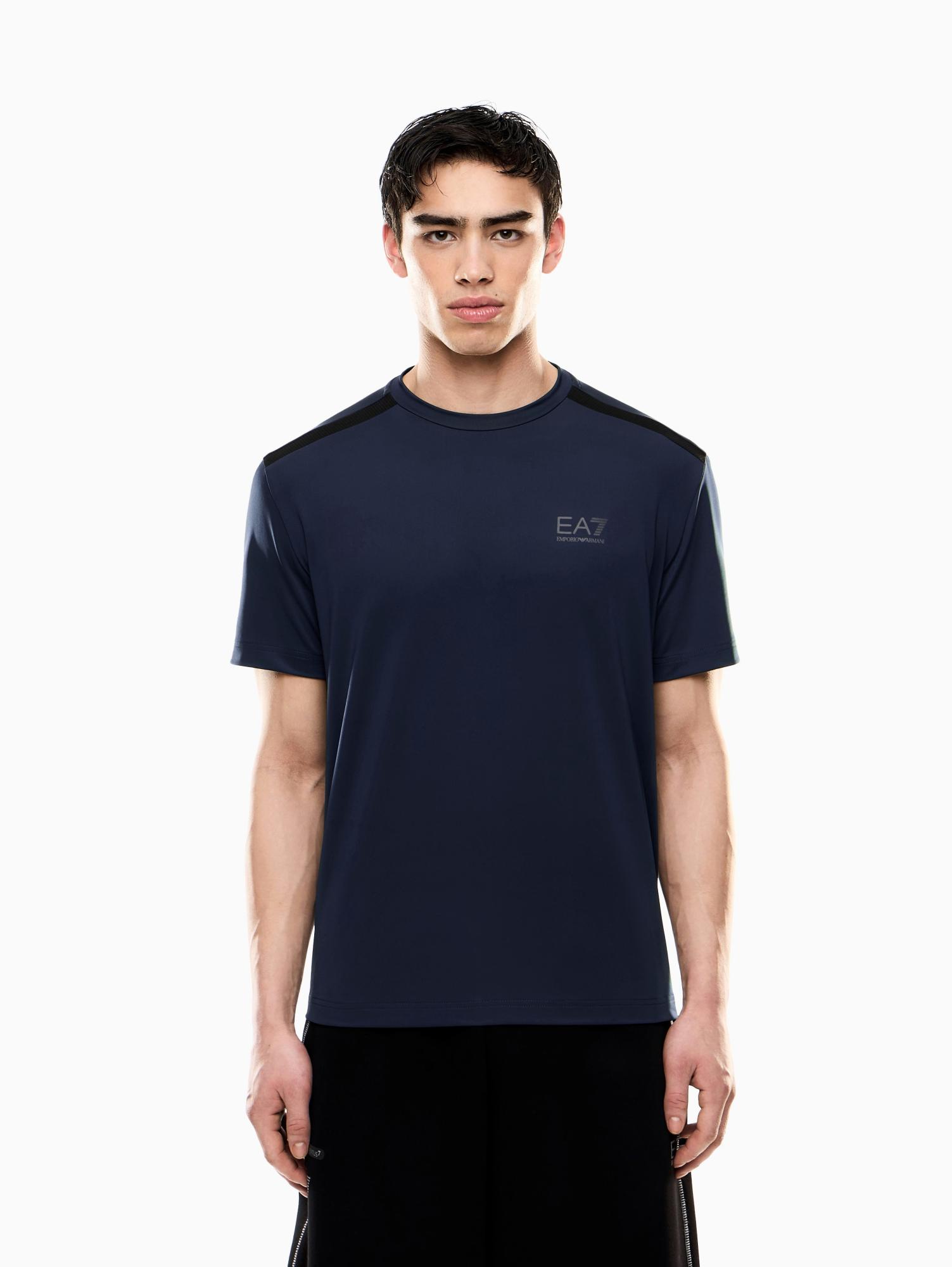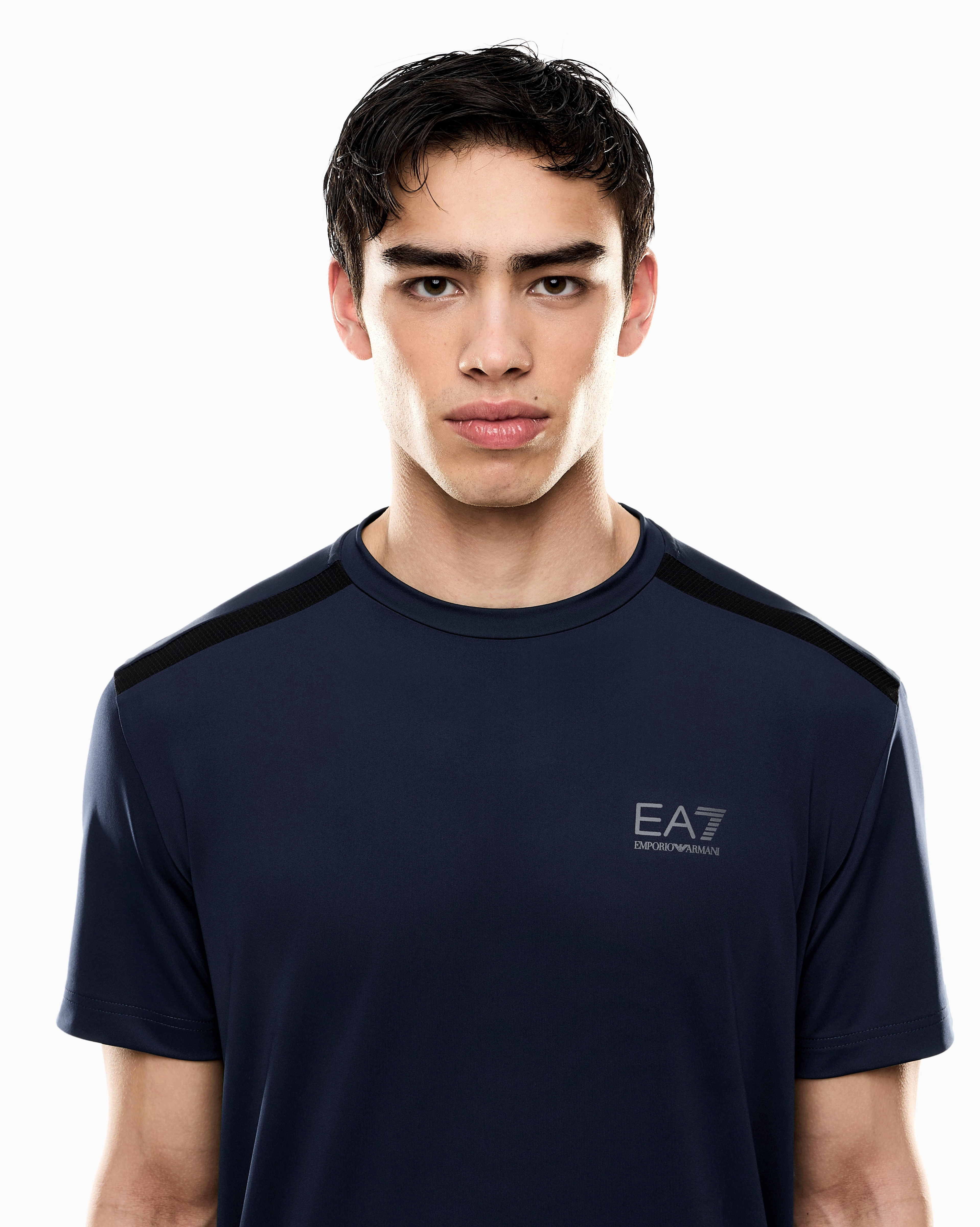 Мужская футболка темно-синего цвета с короткими рукавами и круглым вырезом выполнена из высокотехнологичного материала Natural Ventus7, который помогает коже дышать и сохраняет комфорт при активных нагрузках. Отличный выбор для тренировок на свежем воздухе. Декорирована фирменным логотипом EA7.