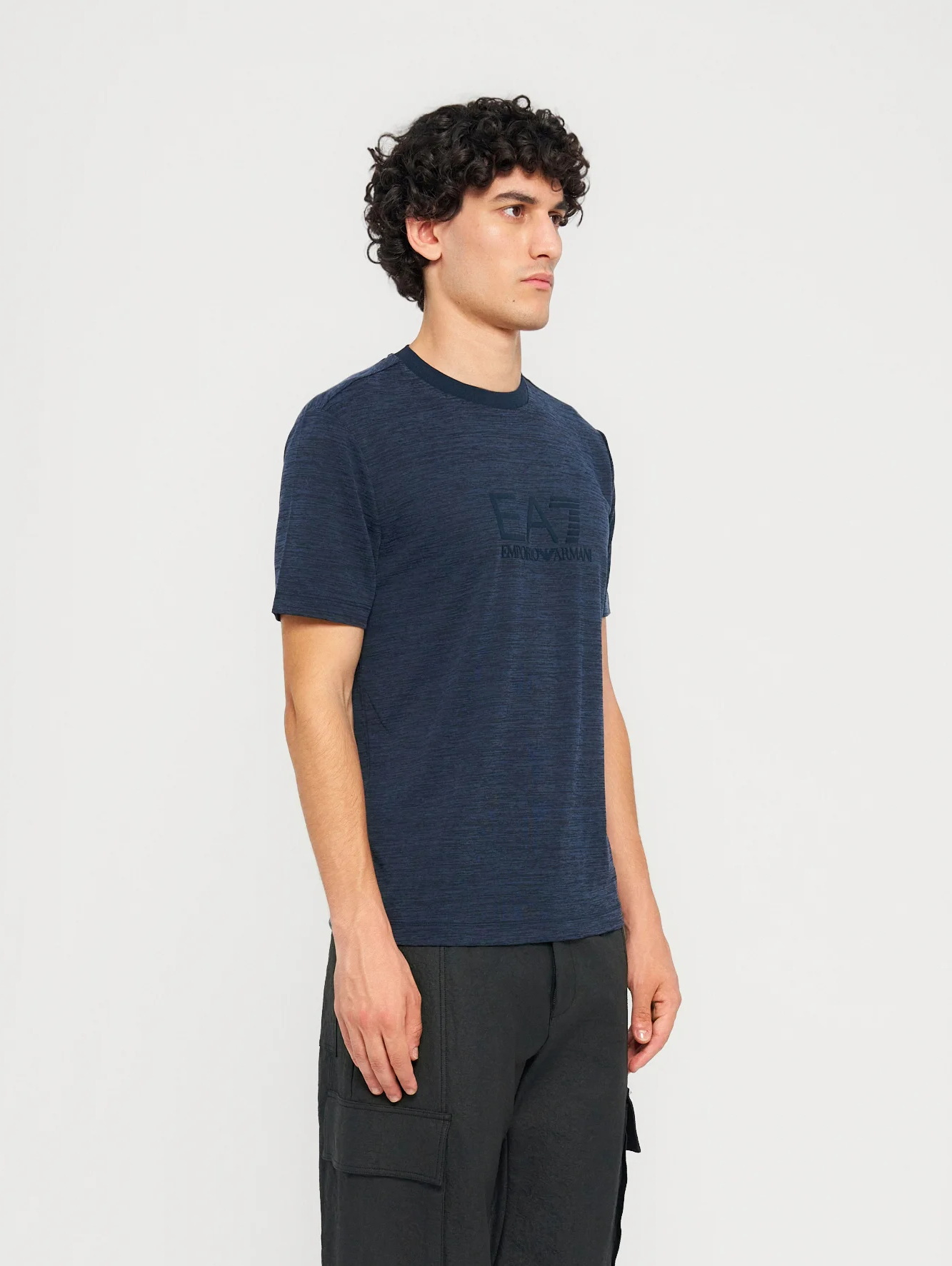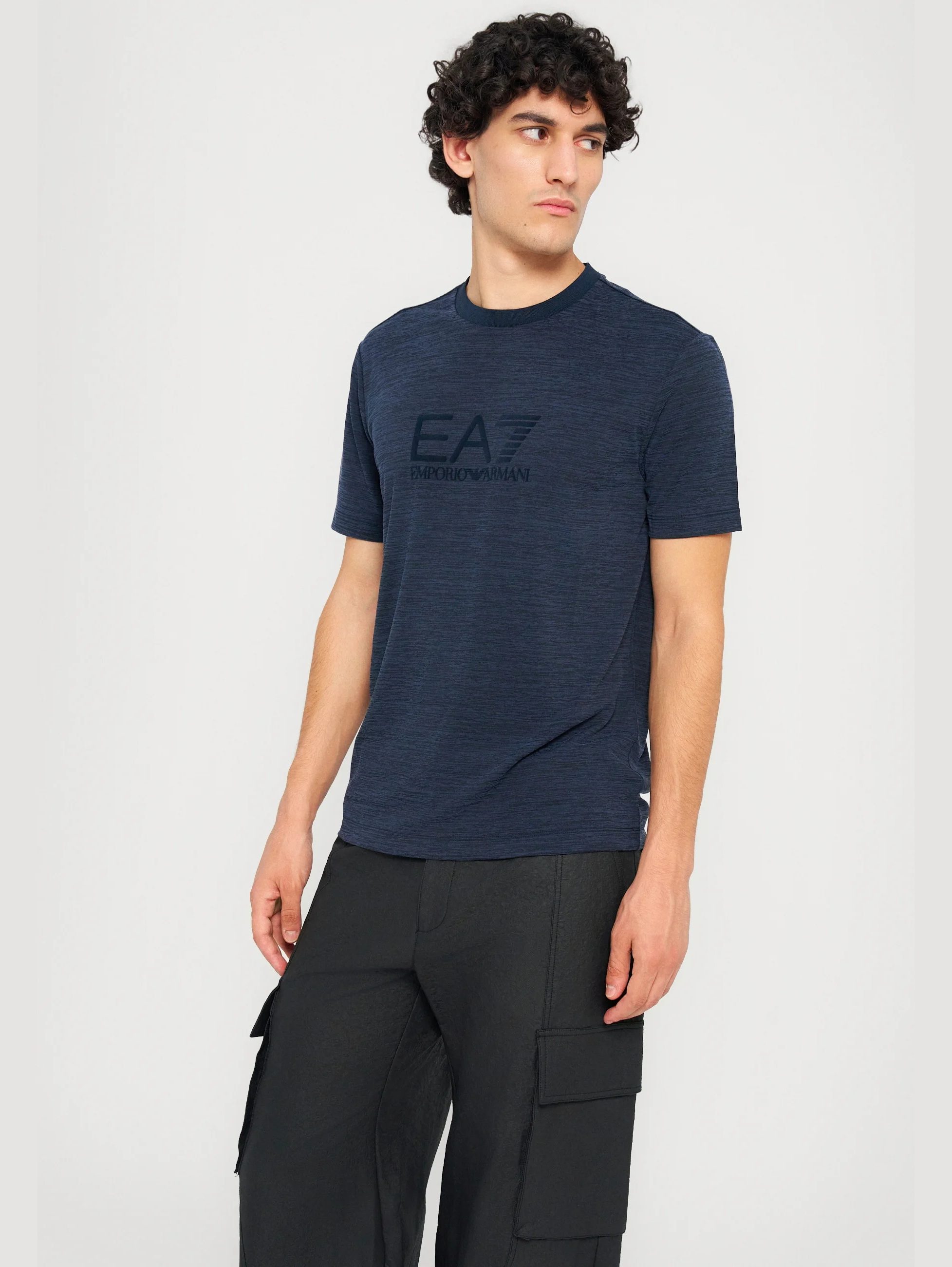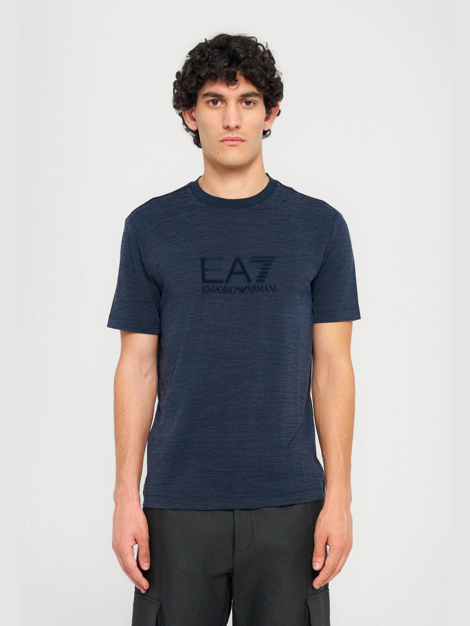 Мужская футболка темно-синего цвета EA7 Emporio Armani из коллекции LUX IDENTITY — лаконичная модель прямого кроя с короткими рукавами и круглым вырезом. Изготовлена из мягкой смеси лиоцелла и полиэстера и украшена фирменным логотипом бренда.