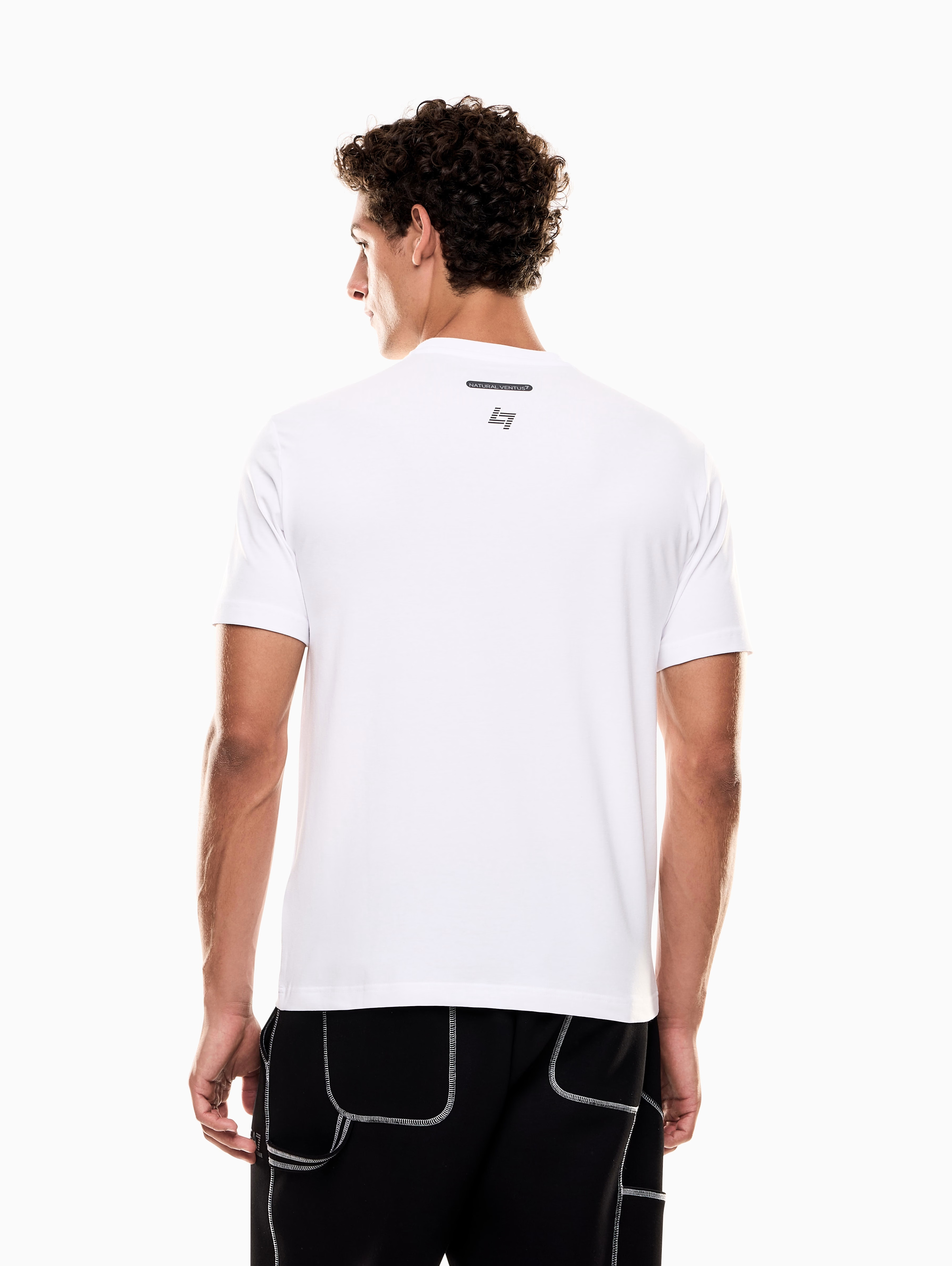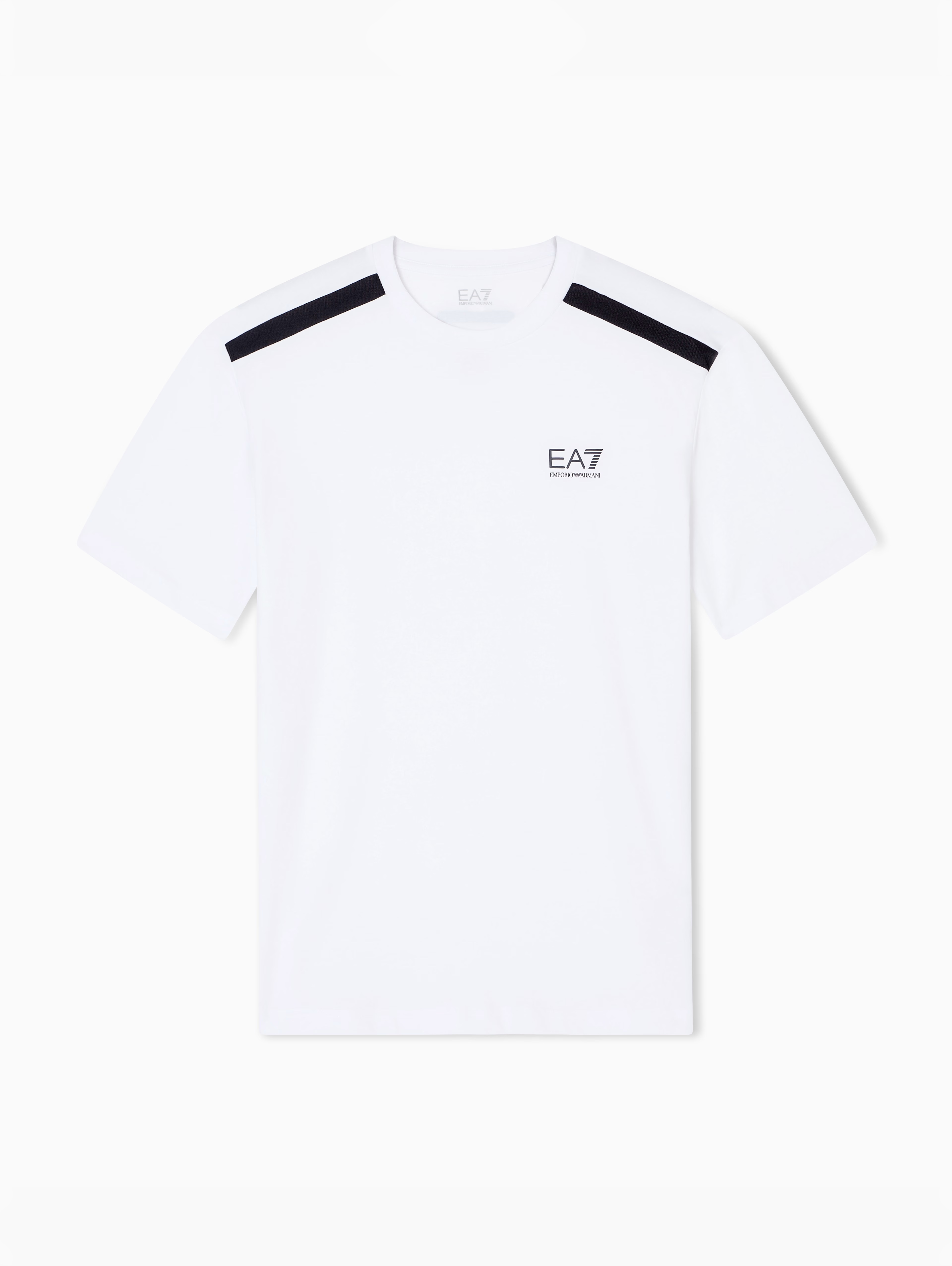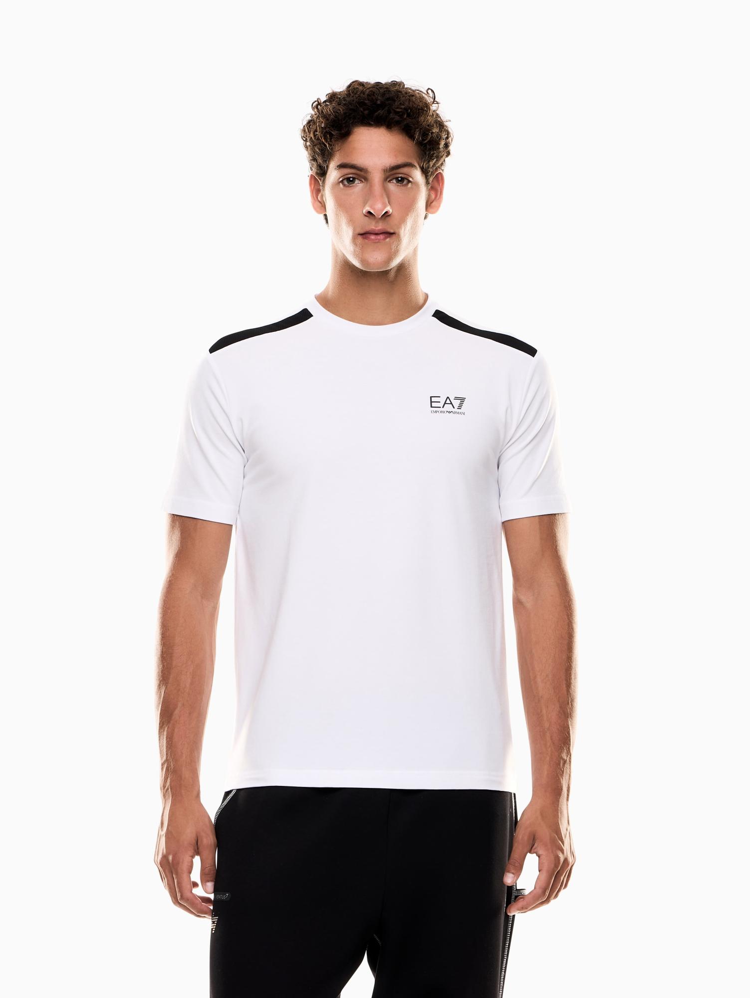 Мужская футболка белого цвета с короткими рукавами и круглым вырезом выполнена из высокотехнологичного материала Natural Ventus7, который помогает коже дышать и сохраняет комфорт при активных нагрузках. Отличный выбор для тренировок на свежем воздухе. Декорирована фирменным логотипом EA7.