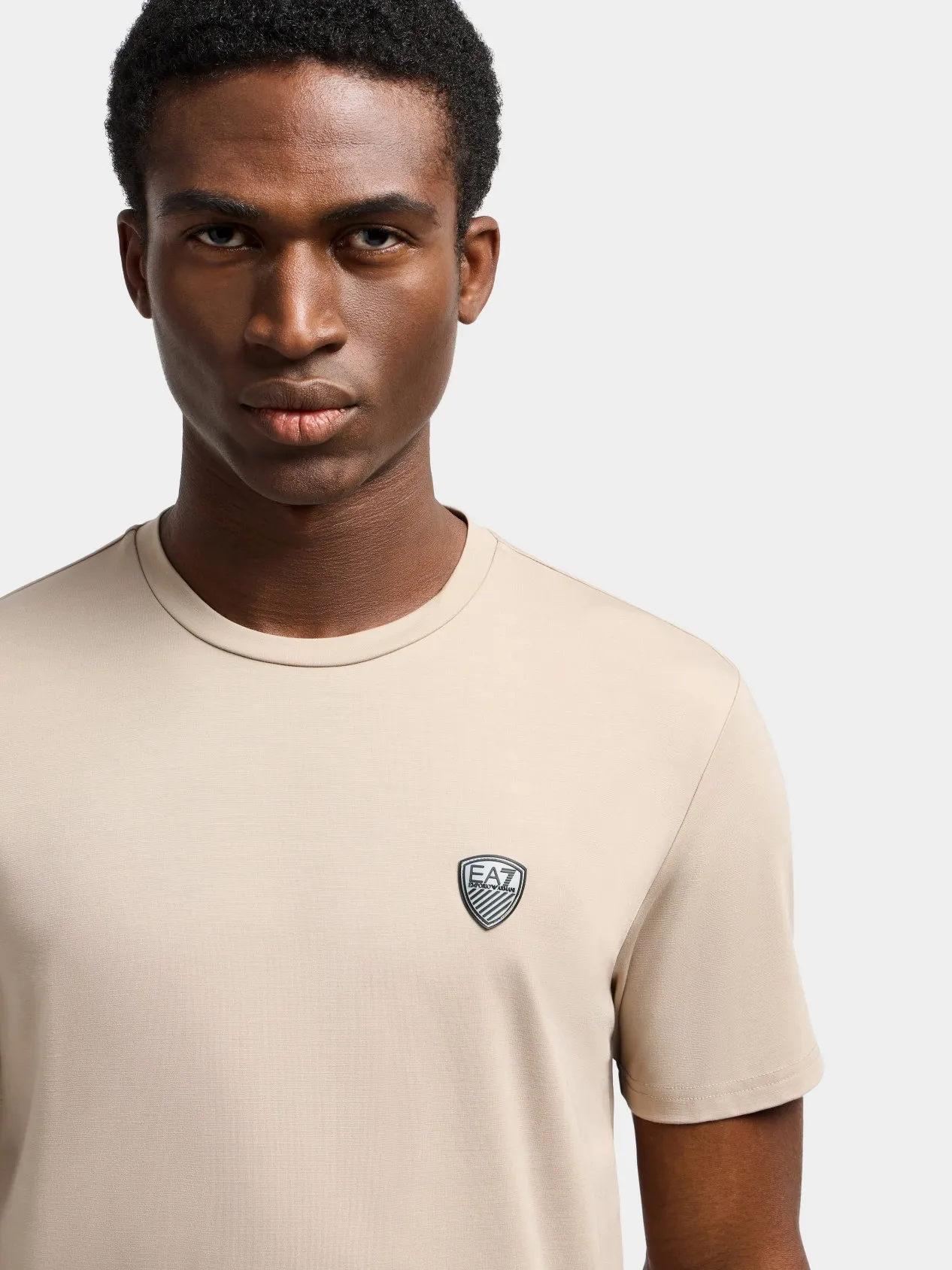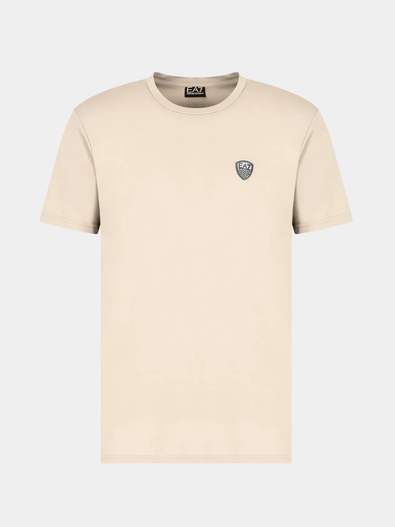Лаконичная бежевая футболка для мужчин от бренда EA7. На груди размещен аккуратный логотип бренда. Футболка изготовлена из эластичного, приятного на ощупь материала. Мужская футболка идеально подходит спорта и активного отдыха.
