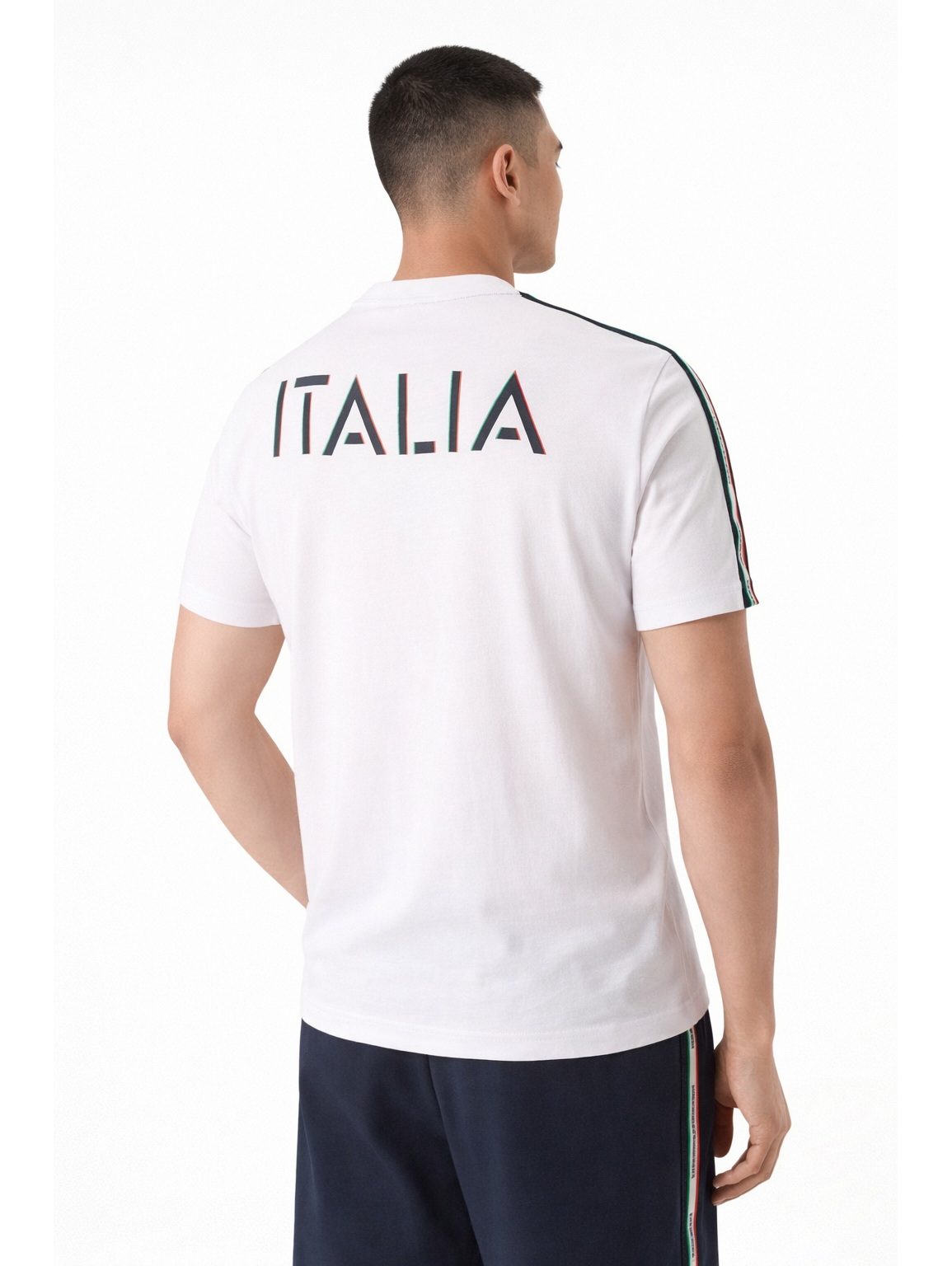 Мужская футболка с короткими рукавами и круглым вырезом выполнена из натурального хлопка. Модель украшена контрастной фирменной тесьмой на плечах и рукавах, а также надписью на спине. Подходит для повседневной носки.