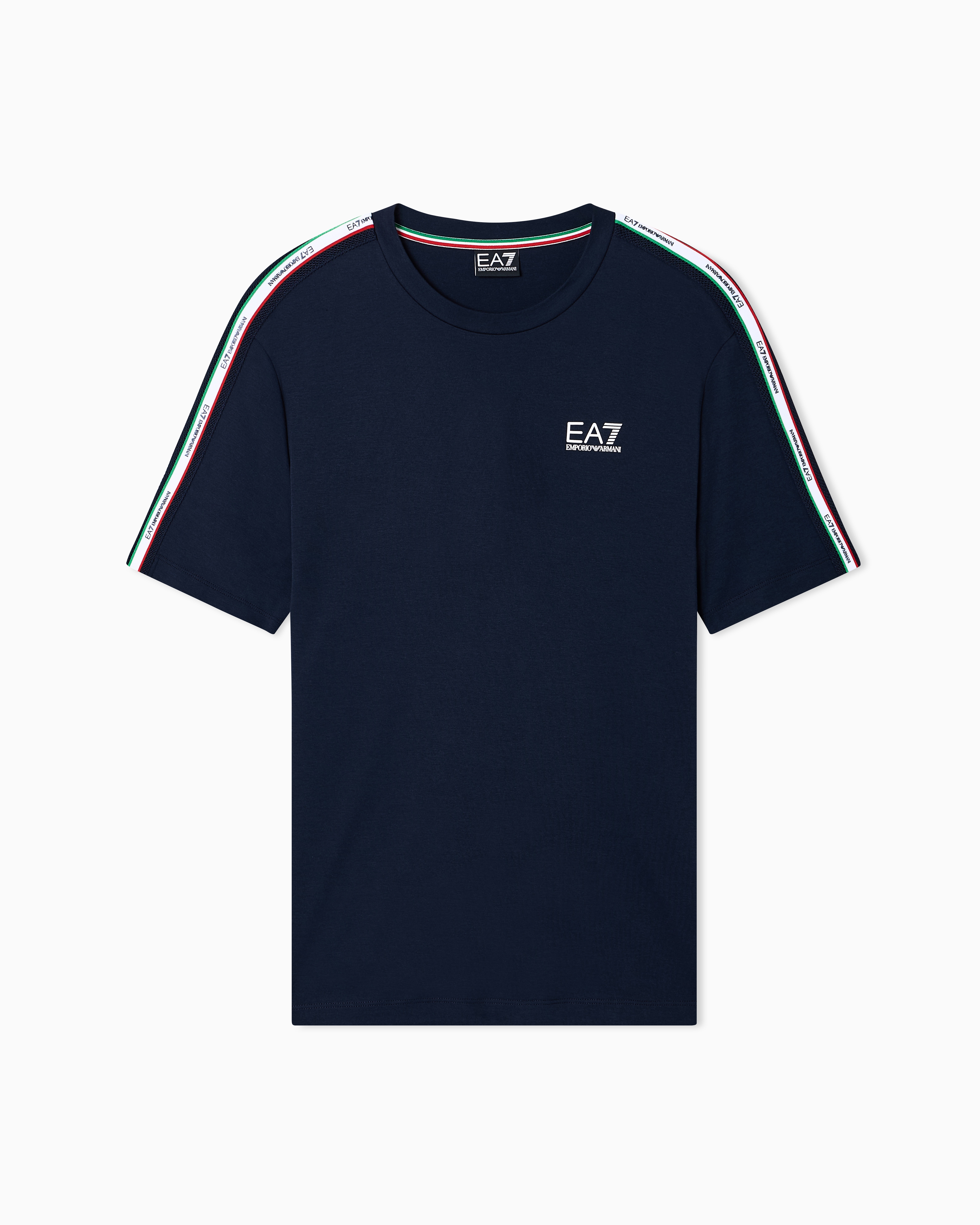 Мужская футболка с короткими рукавами и круглым вырезом выполнена из натурального хлопка. Модель украшена контрастной фирменной тесьмой на плечах и рукавах, а также надписью на спине. Подходит для повседневной носки.