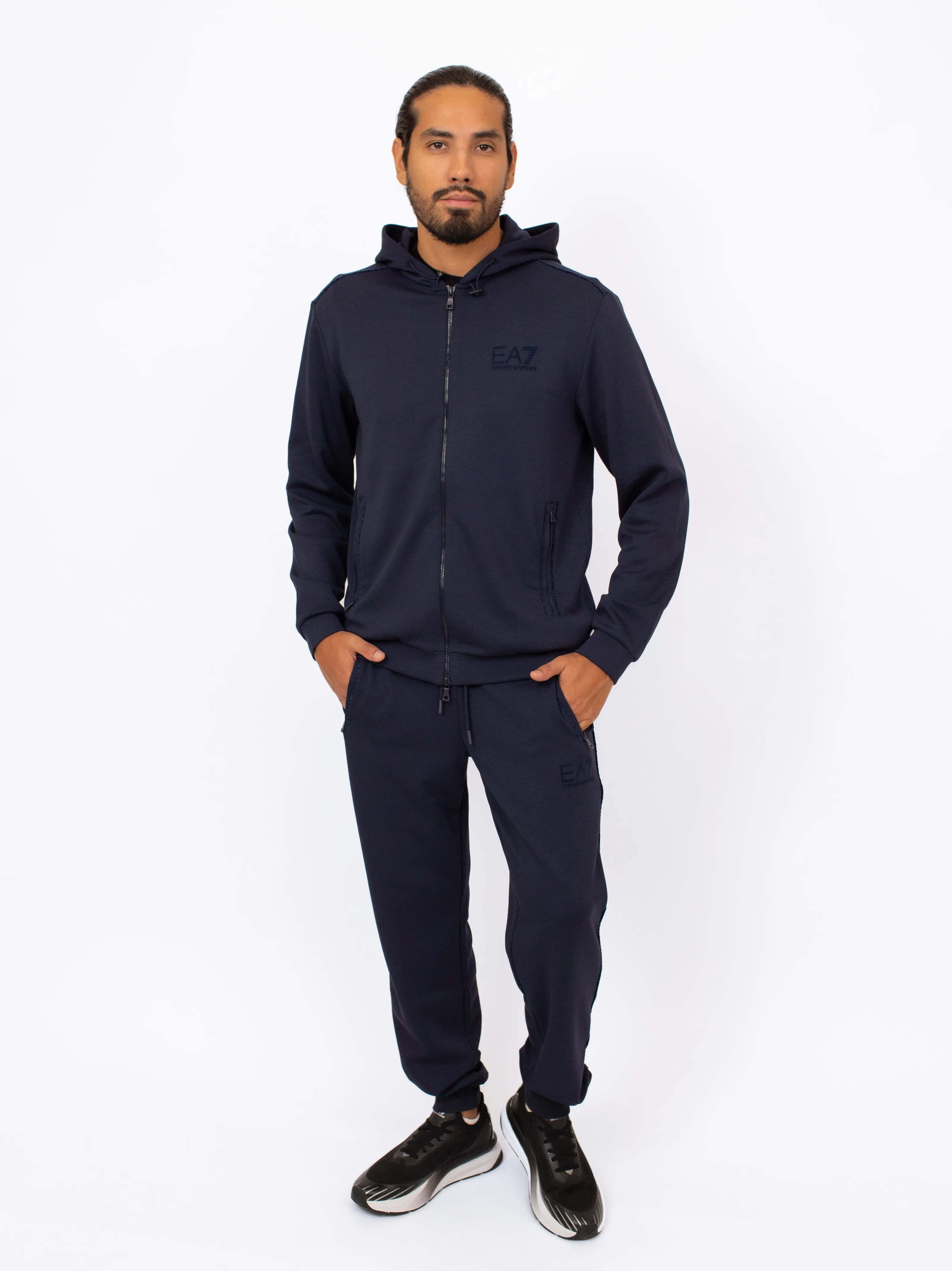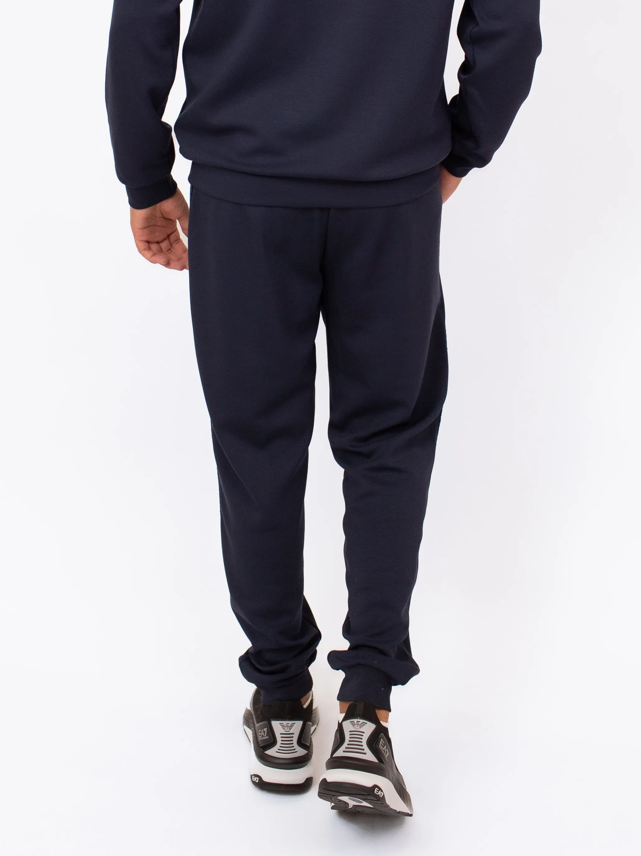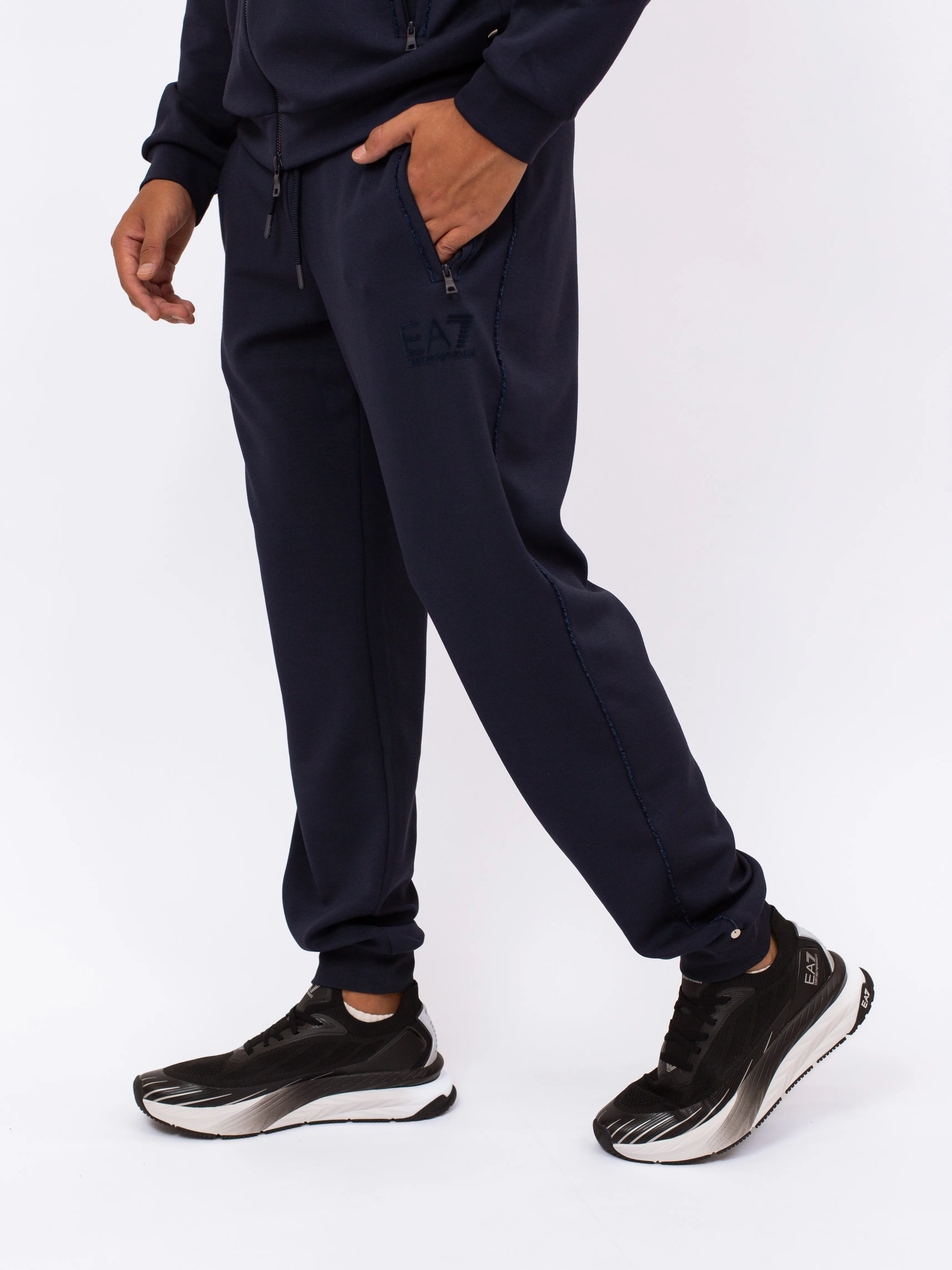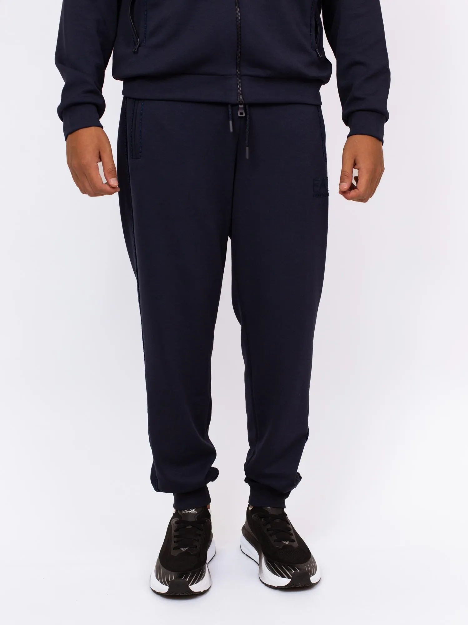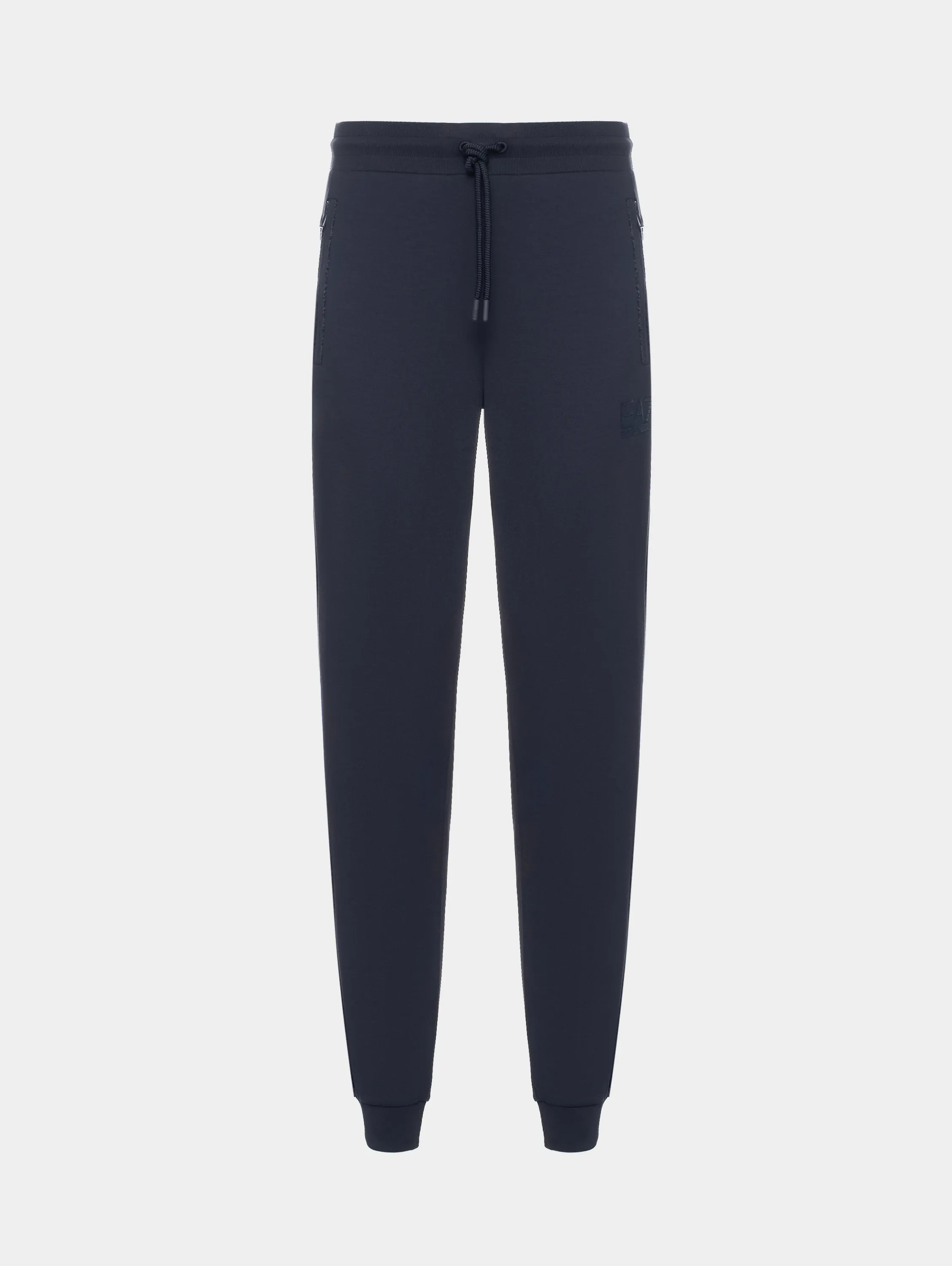 Мужские спортивные брюки EA7 LUX IDENTITY темно-синего цвета — стильный вариант прямого кроя, слегка зауженного к низу. Выполнены из мягкой смеси полиэстера, модала и эластана, оснащены удобными боковыми карманами на молнии. Отлично сочетаются с толстовками из коллекции и подойдут как для тренировок, так и для активного отдыха.