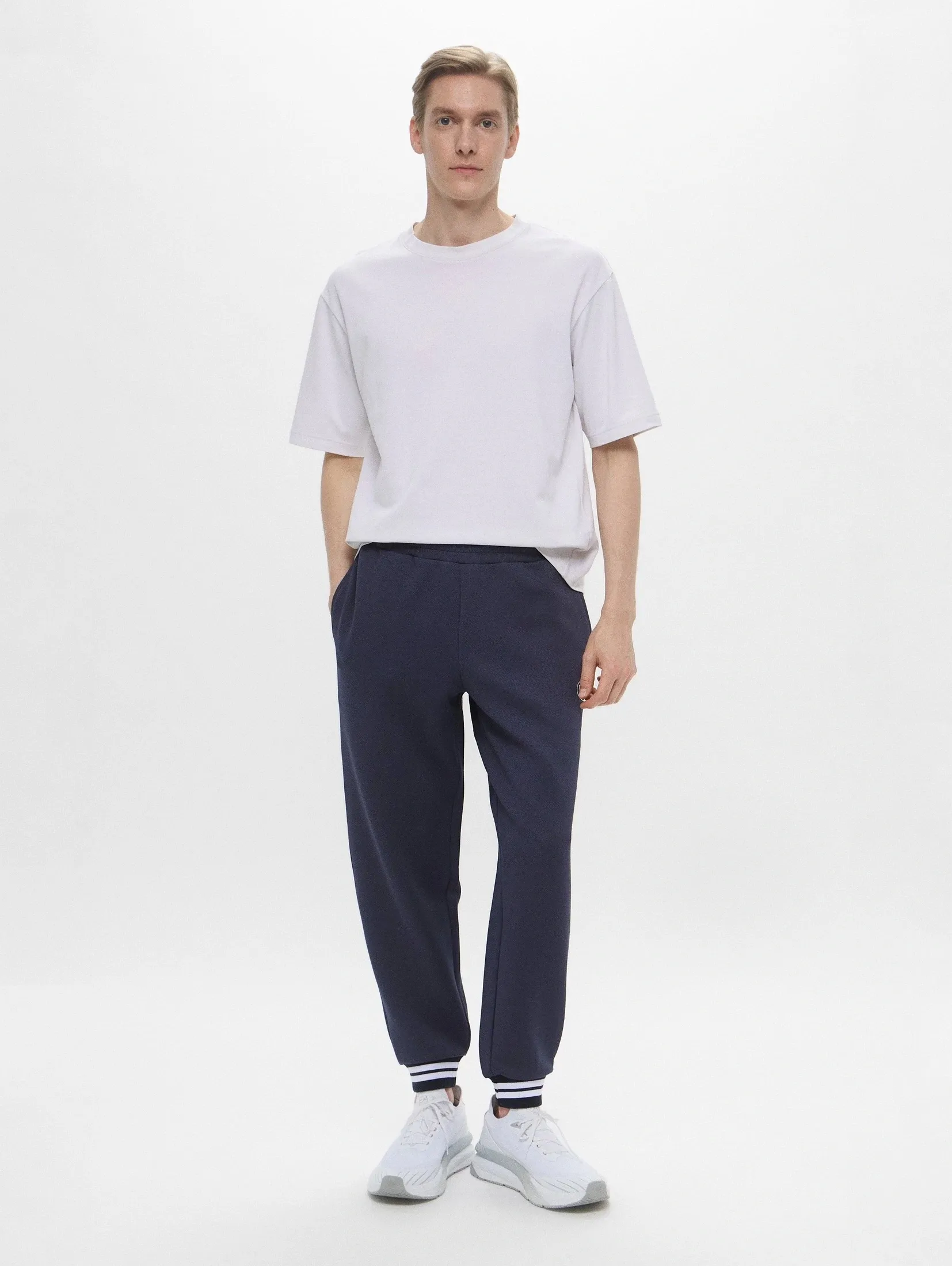 Мужские спортивные брюки EA7 TENNIS CLUB тёмно-синего цвета — функциональная и стильная модель, гармонично сочетающаяся с толстовками из коллекции. Идеальны для тренировок, тенниса и активного отдыха. Выполнены из смеси полиэстера, вискозы и эластана, оснащены эластичными манжетами и удобными боковыми карманами.