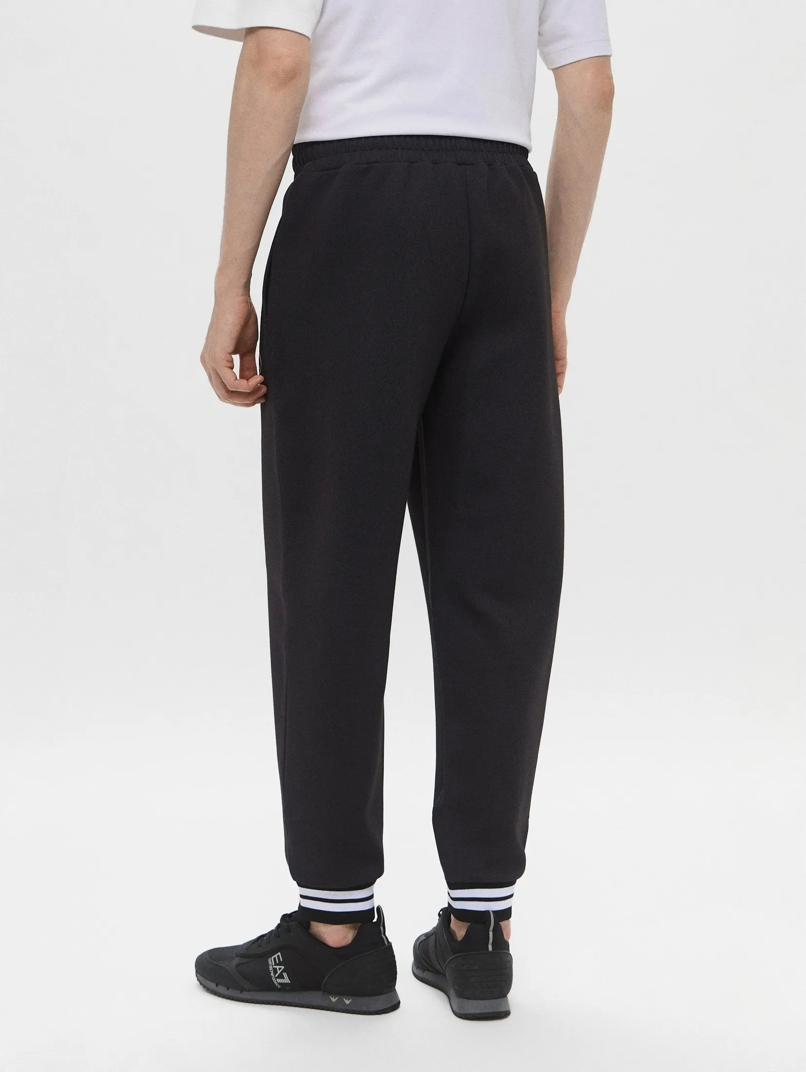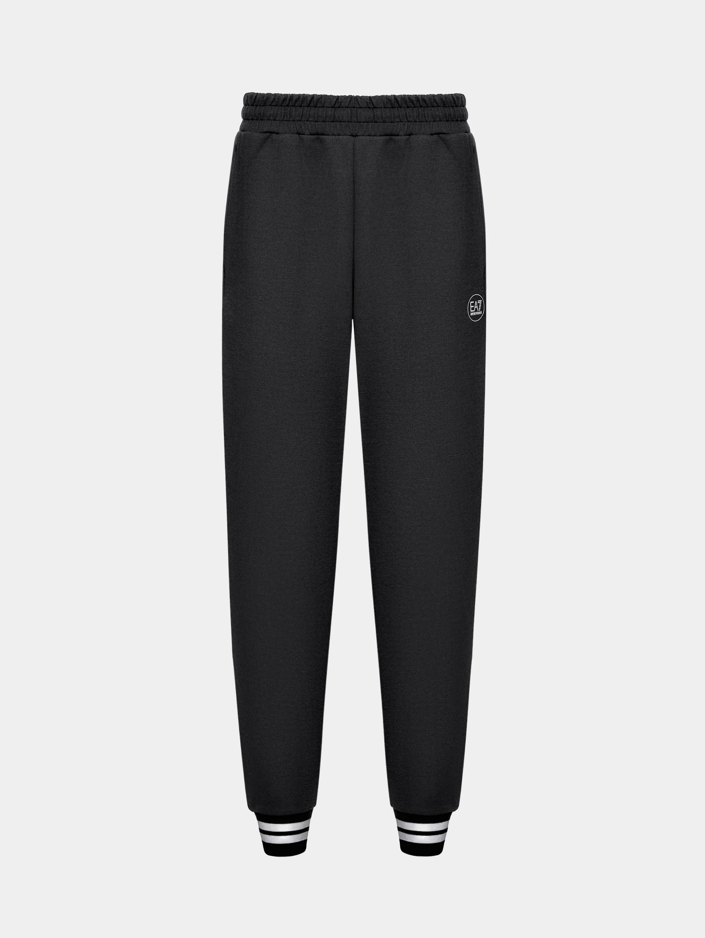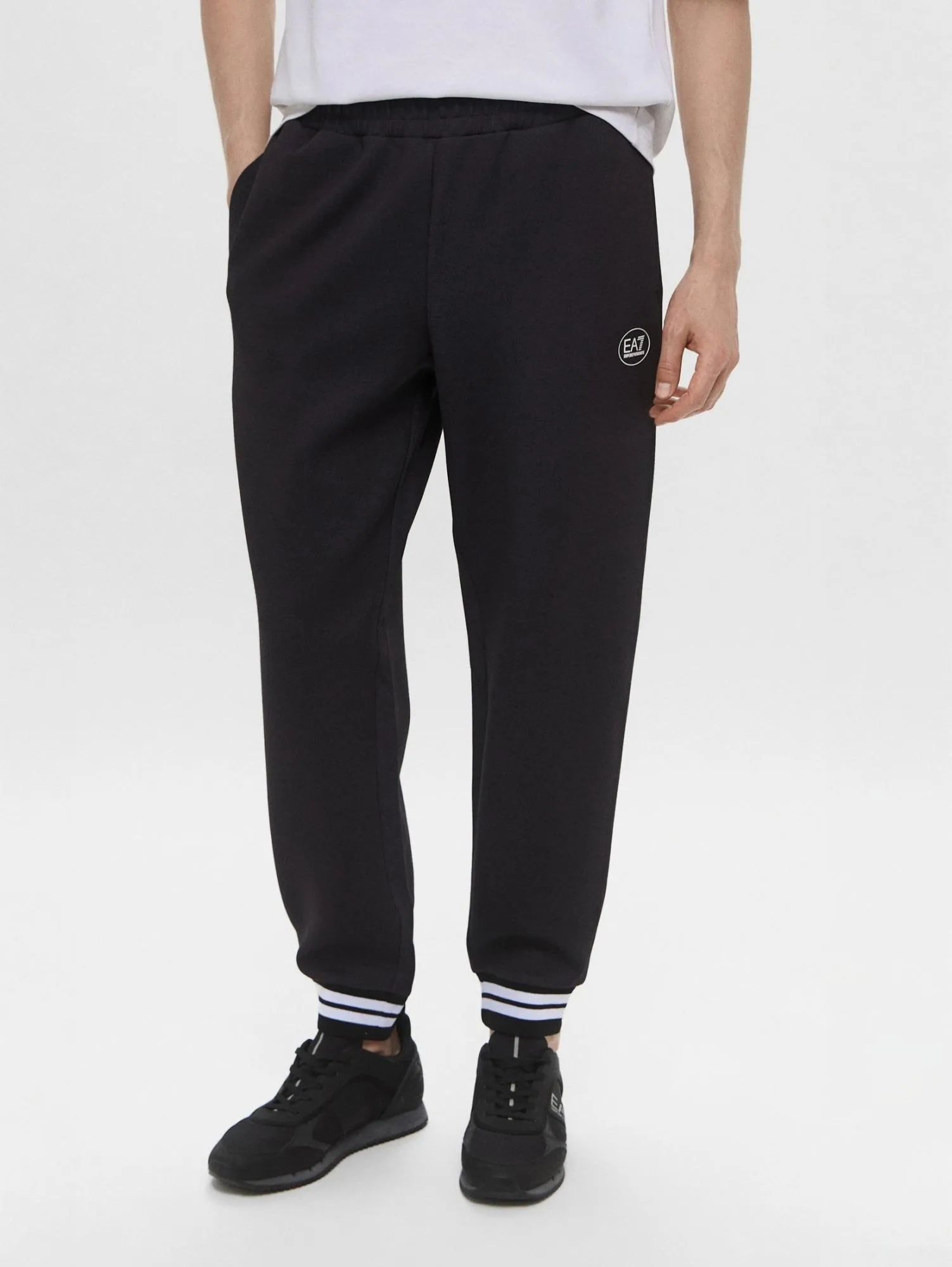 Мужские спортивные брюки EA7 TENNIS CLUB черного цвета — функциональная и стильная модель, гармонично сочетающаяся с толстовками из коллекции. Идеальны для тренировок, тенниса и активного отдыха. Выполнены из смеси полиэстера, вискозы и эластана, оснащены эластичными манжетами и удобными боковыми карманами.