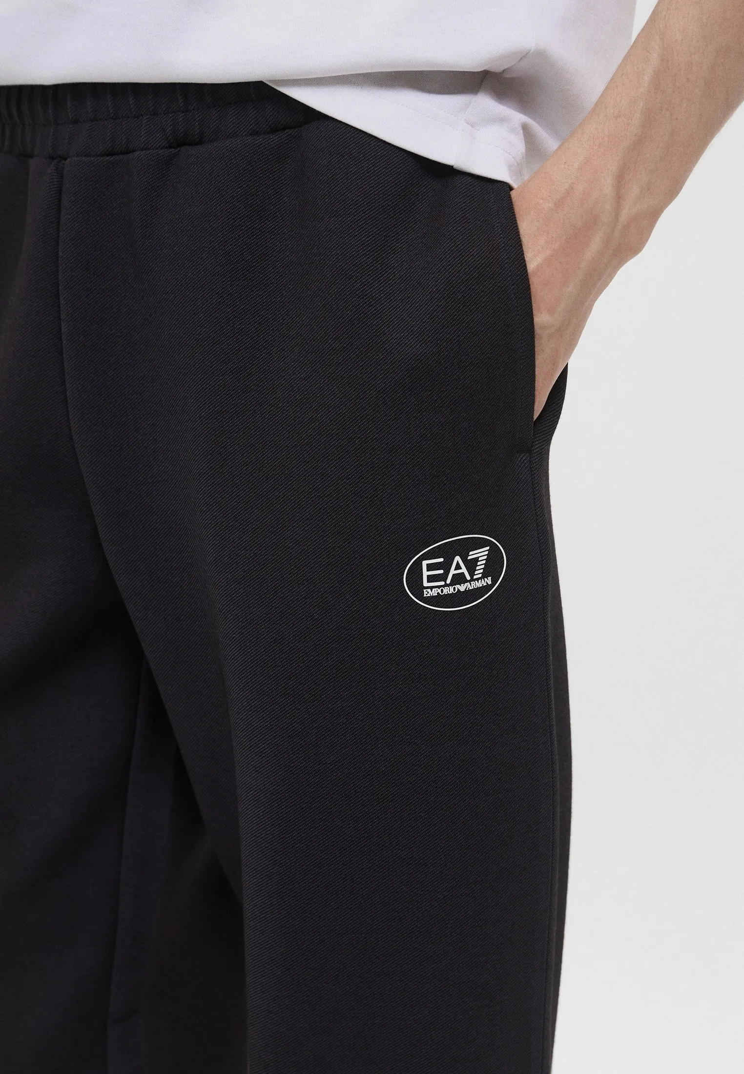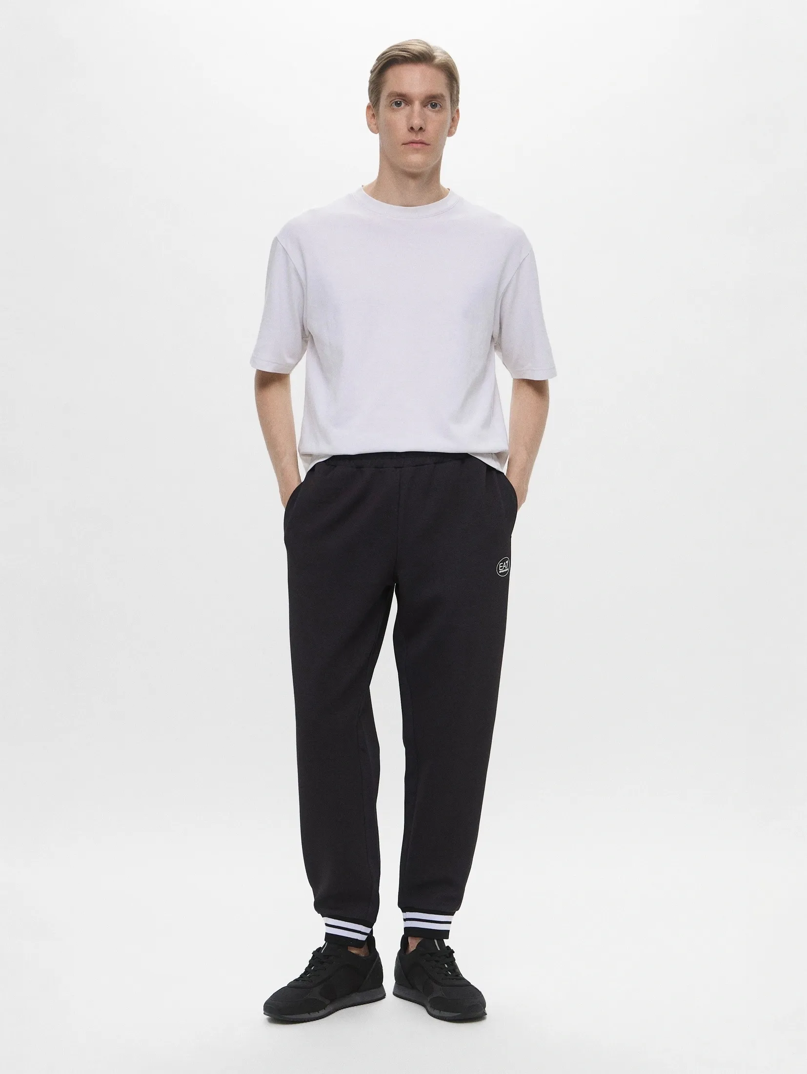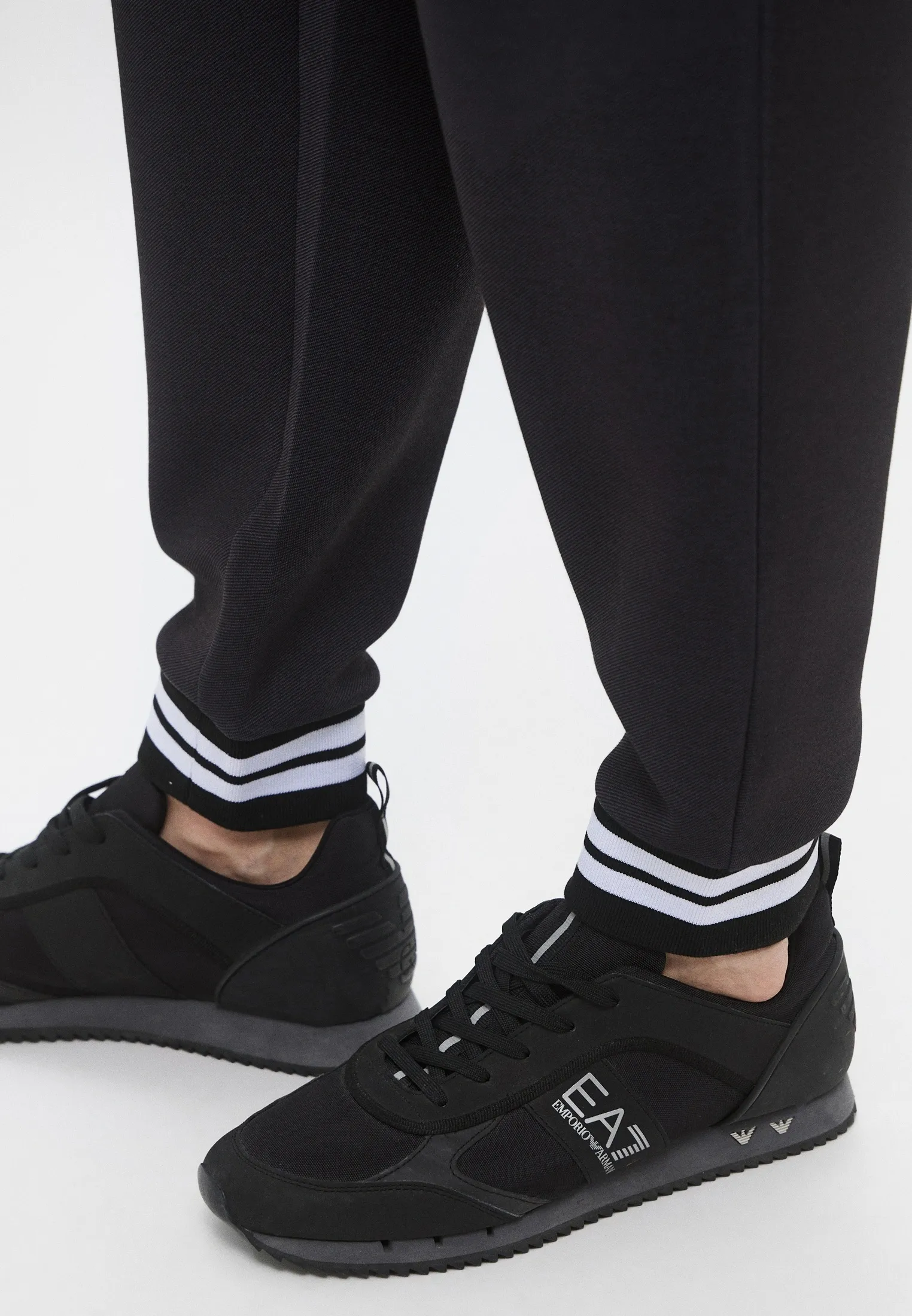 Мужские спортивные брюки EA7 TENNIS CLUB черного цвета — функциональная и стильная модель, гармонично сочетающаяся с толстовками из коллекции. Идеальны для тренировок, тенниса и активного отдыха. Выполнены из смеси полиэстера, вискозы и эластана, оснащены эластичными манжетами и удобными боковыми карманами.