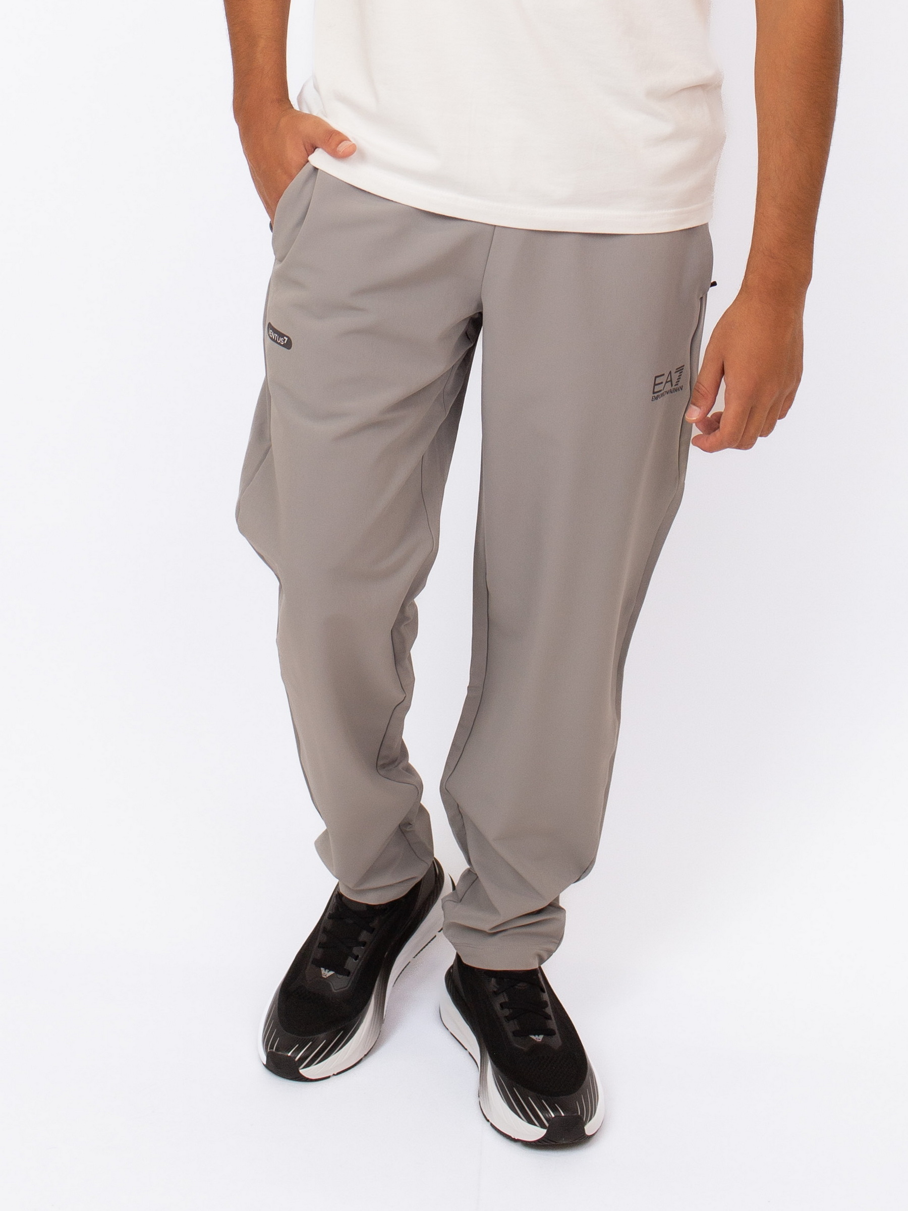 Мужские спортивные брюки EA7 серого цвета, слегка зауженного кроя. Выполнены из технологичной ткани VENTUS7, поддерживающей вентиляцию и комфортную температуру тела на протяжении активной физической нагрузки. Оснащены боковыми карманами на молнии и светоотражающими вставками.