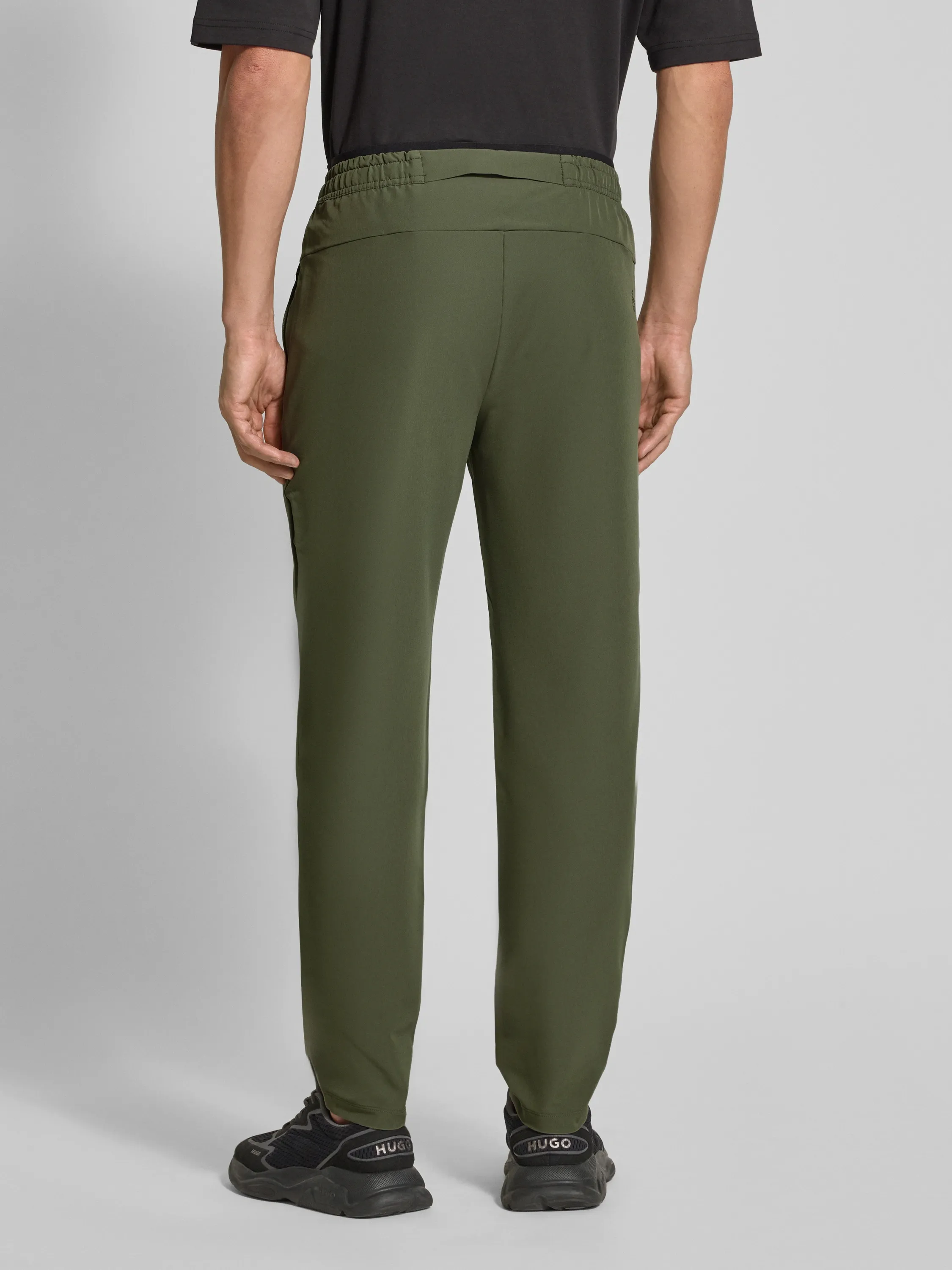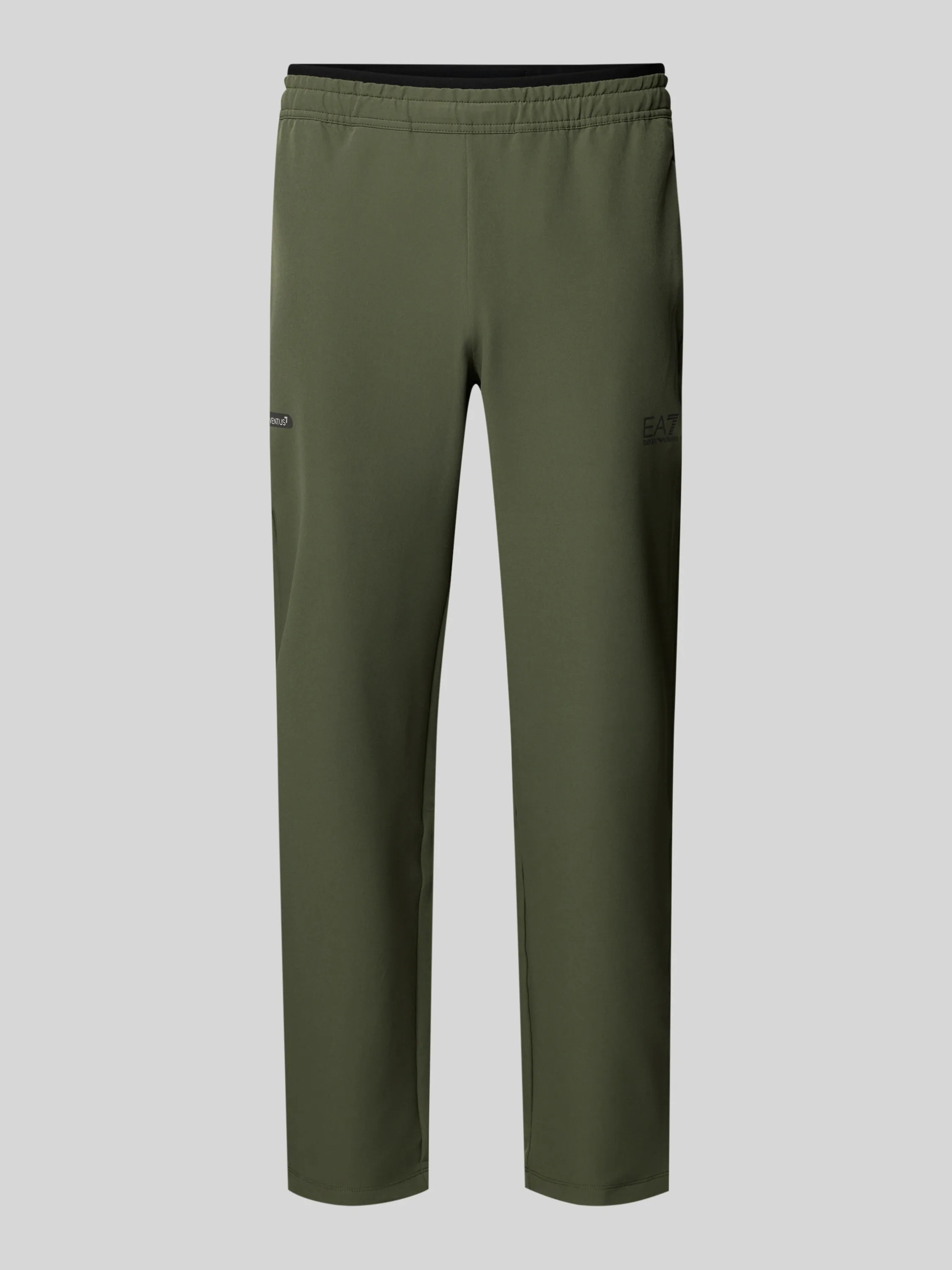 Мужские спортивные брюки EA7 зеленого цвета, слегка зауженного кроя. Выполнены из технологичной ткани VENTUS7, поддерживающей вентиляцию и комфортную температуру тела на протяжении активной физической нагрузки. Оснащены боковыми карманами на молнии и светоотражающими вставками.