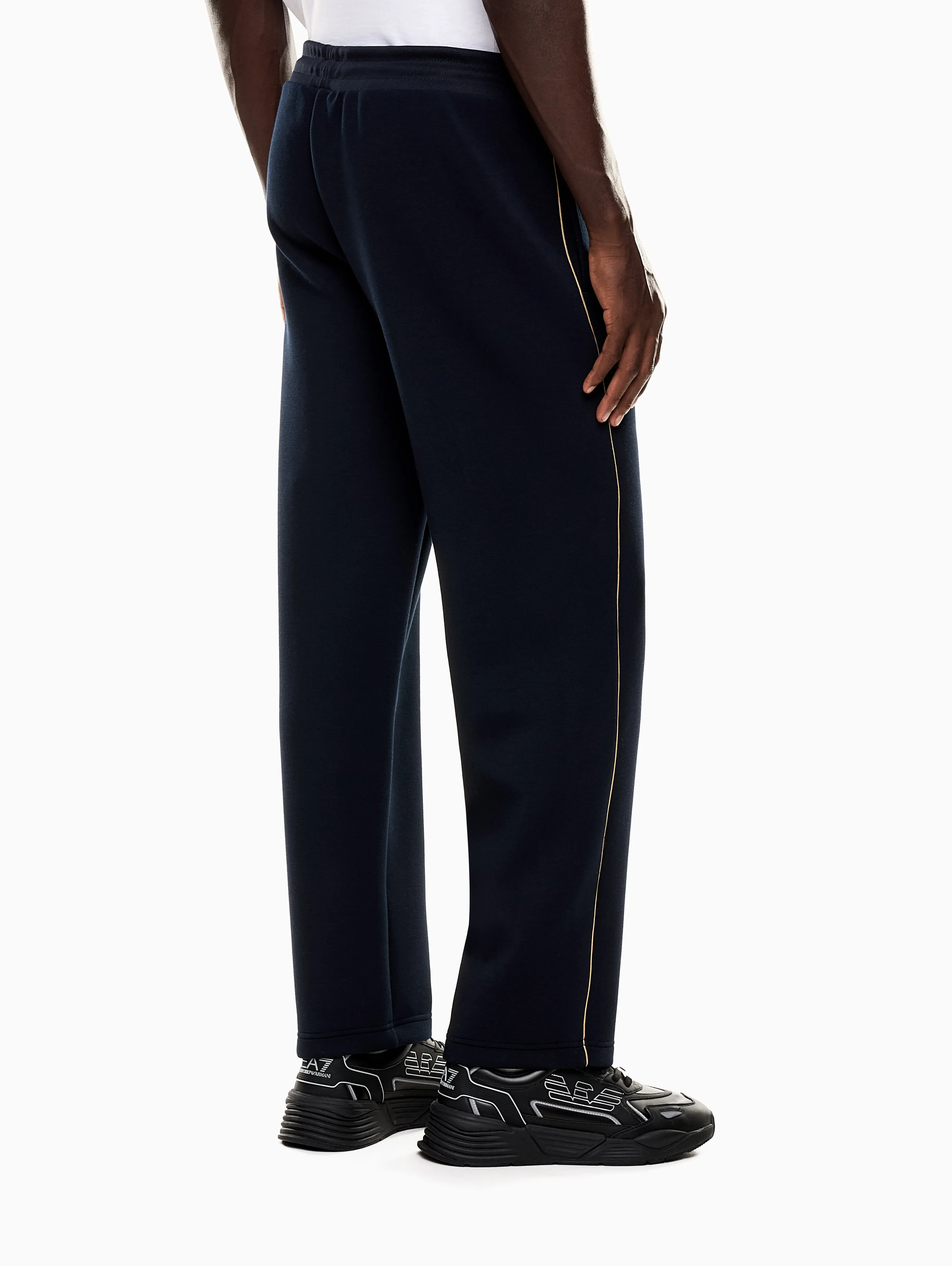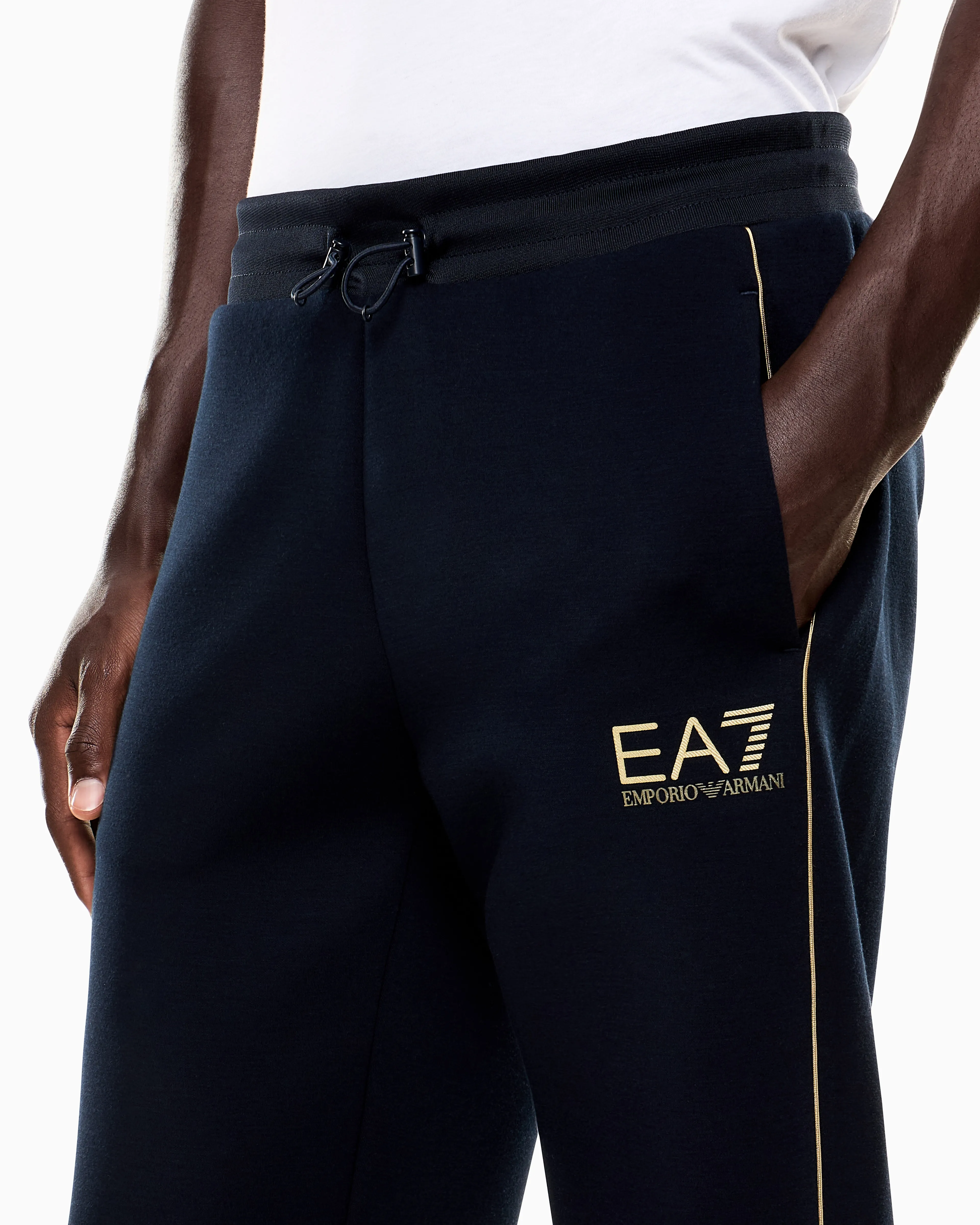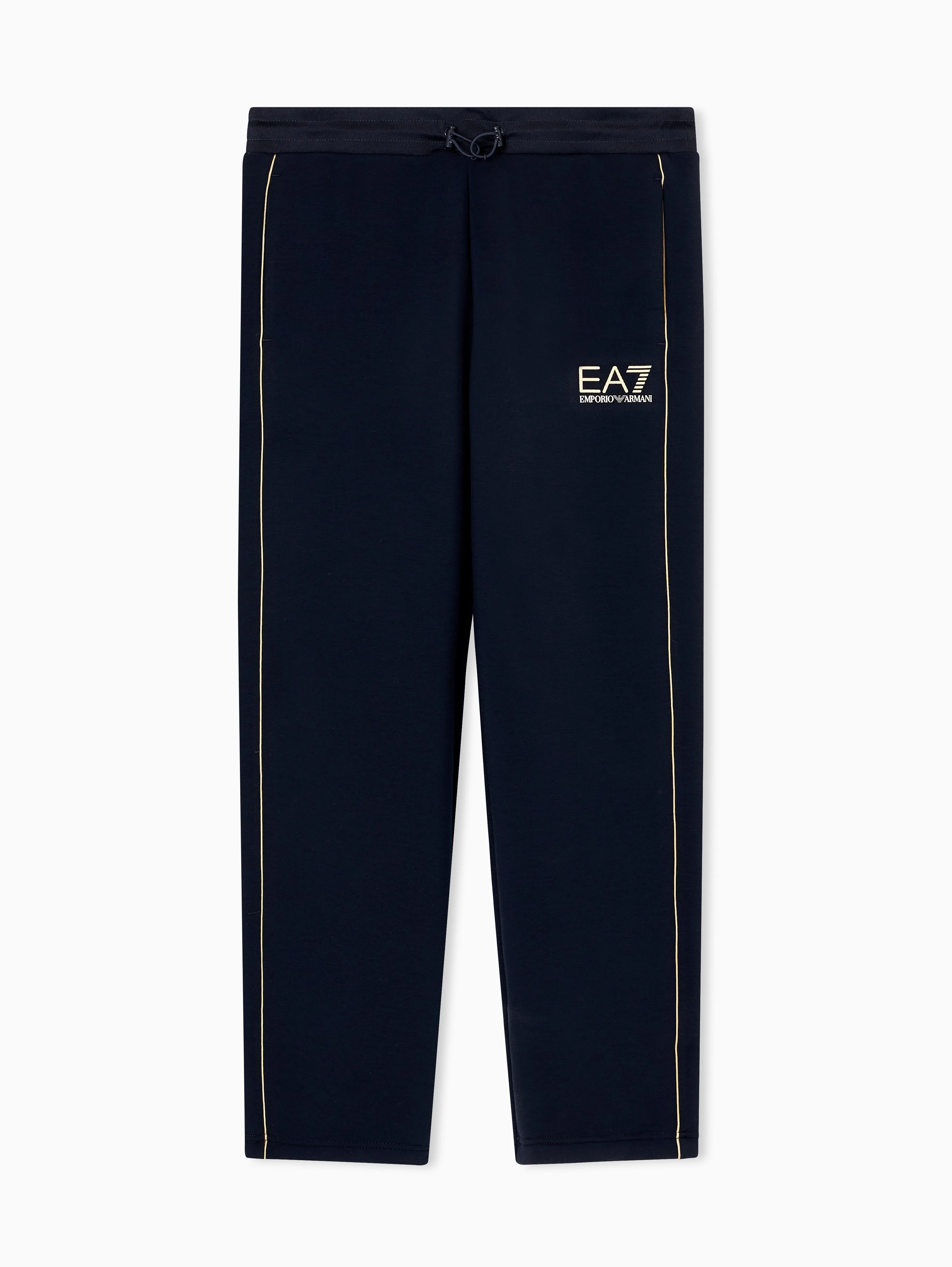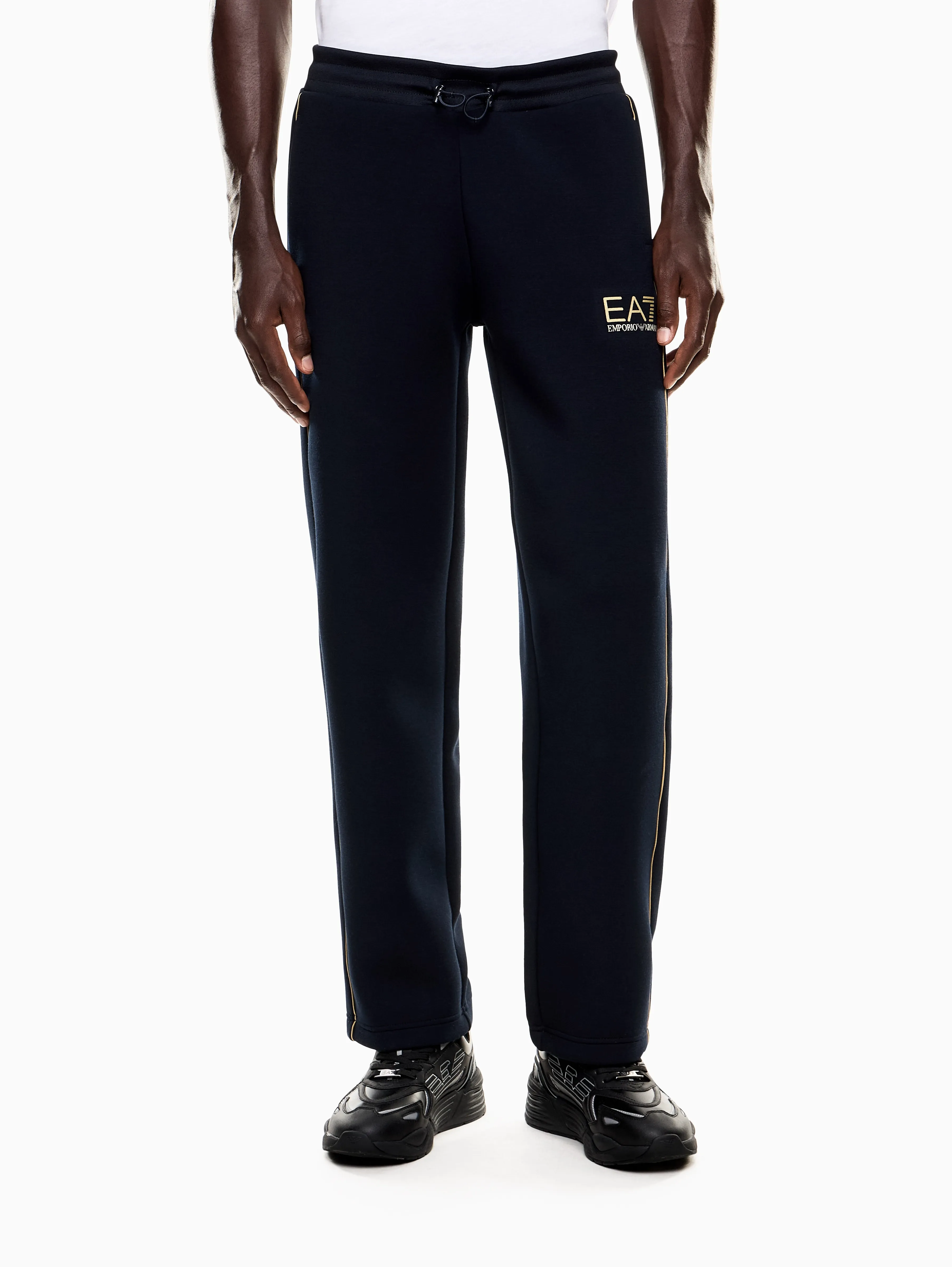 Мужские спортивные брюки EA7 из коллекции Gold Label темно-синего цвета прямого кроя. Золотистый логотип и боковые акценты подчеркивают премиальный стиль модели. Эластичная ткань с добавлением вискозы и эластана дарит комфорт и свободу движений. Отличный выбор для спорта и активного отдыха.