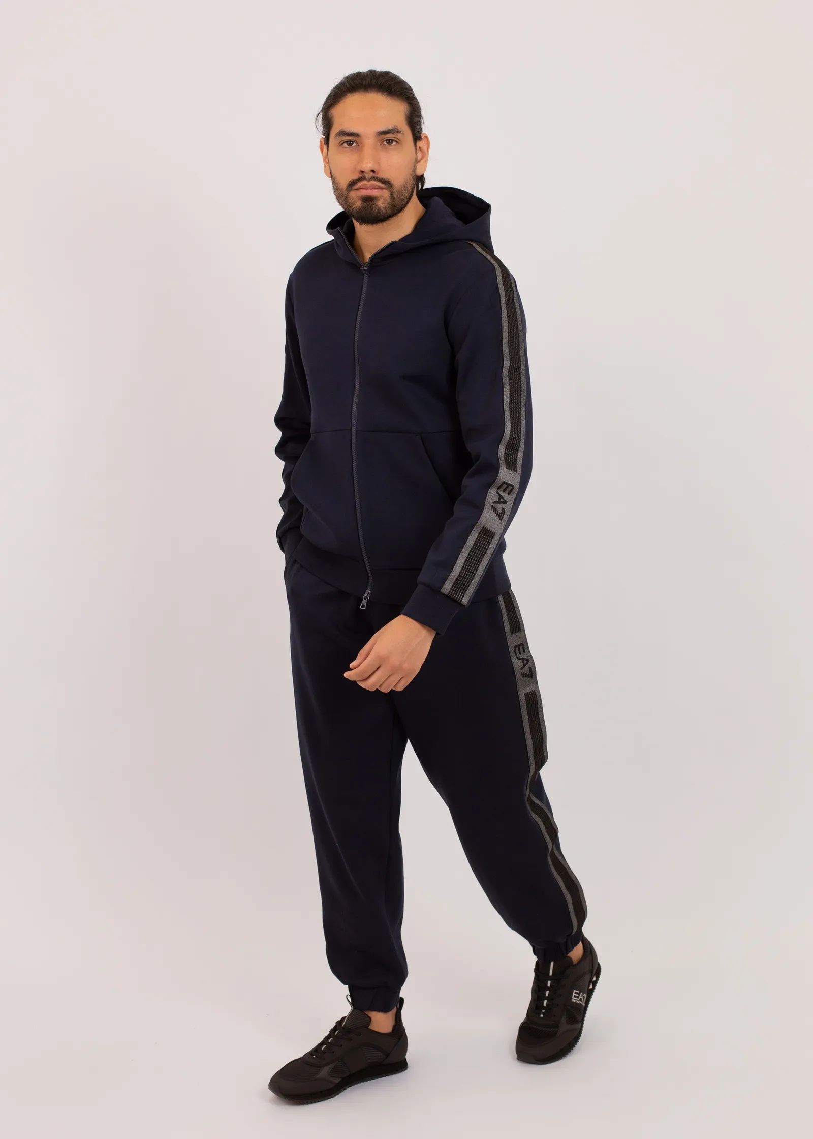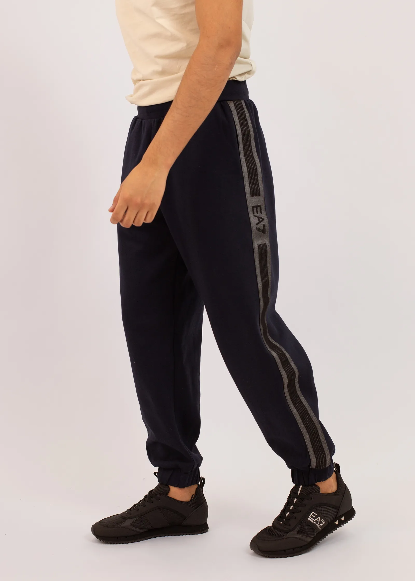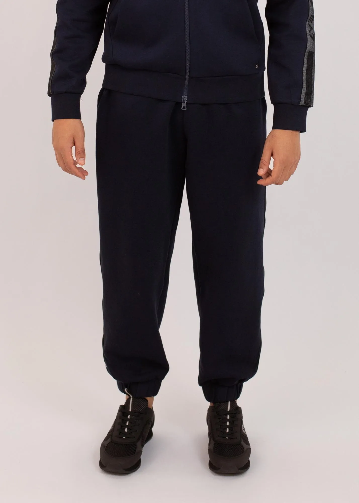 Мужские спортивные брюки EA7 Emporio Armani темно-синего цвета с фирменными контрастными лампасами. Эластичная талия и манжеты обеспечивают комфортную посадку, а боковые карманы добавляют практичности. Идеальный выбор для активного отдыха и повседневного стиля.