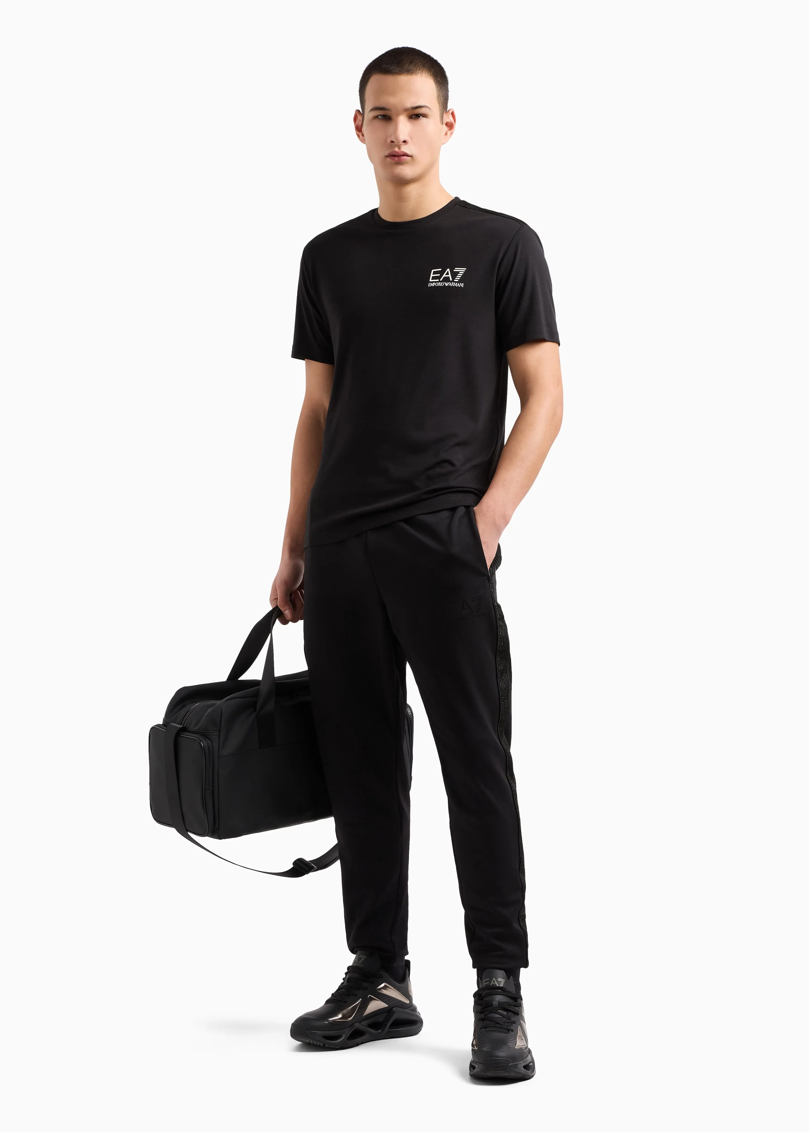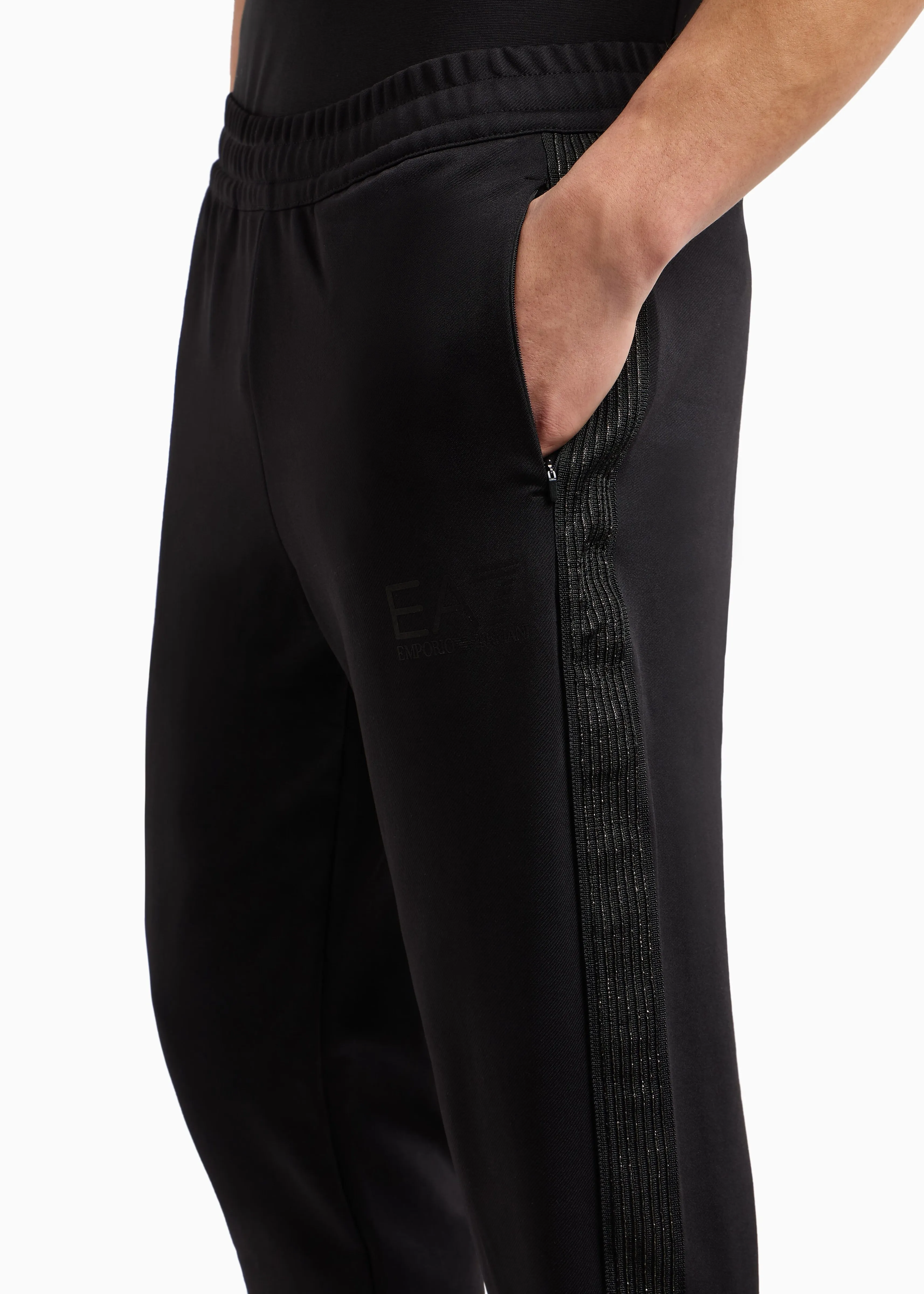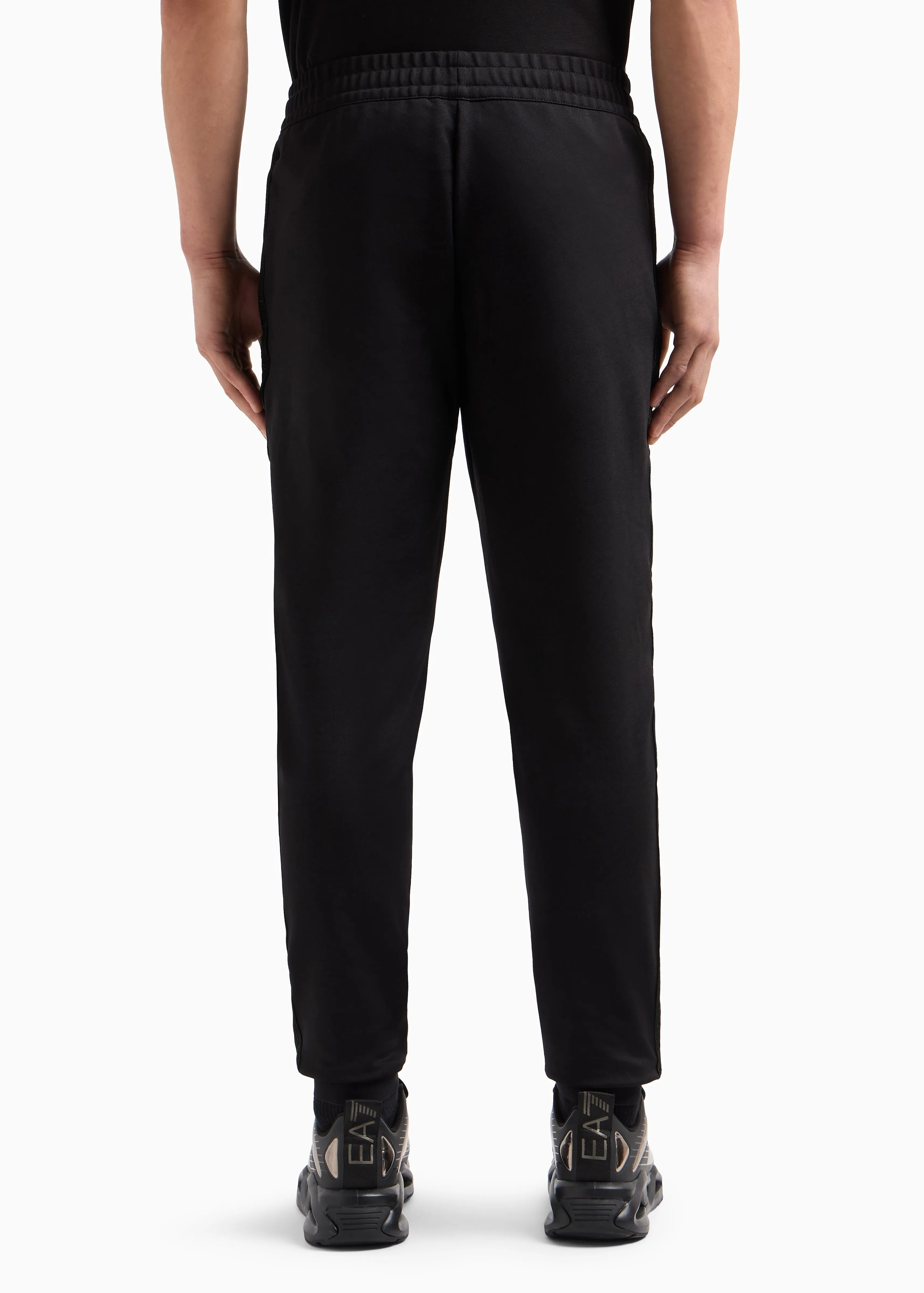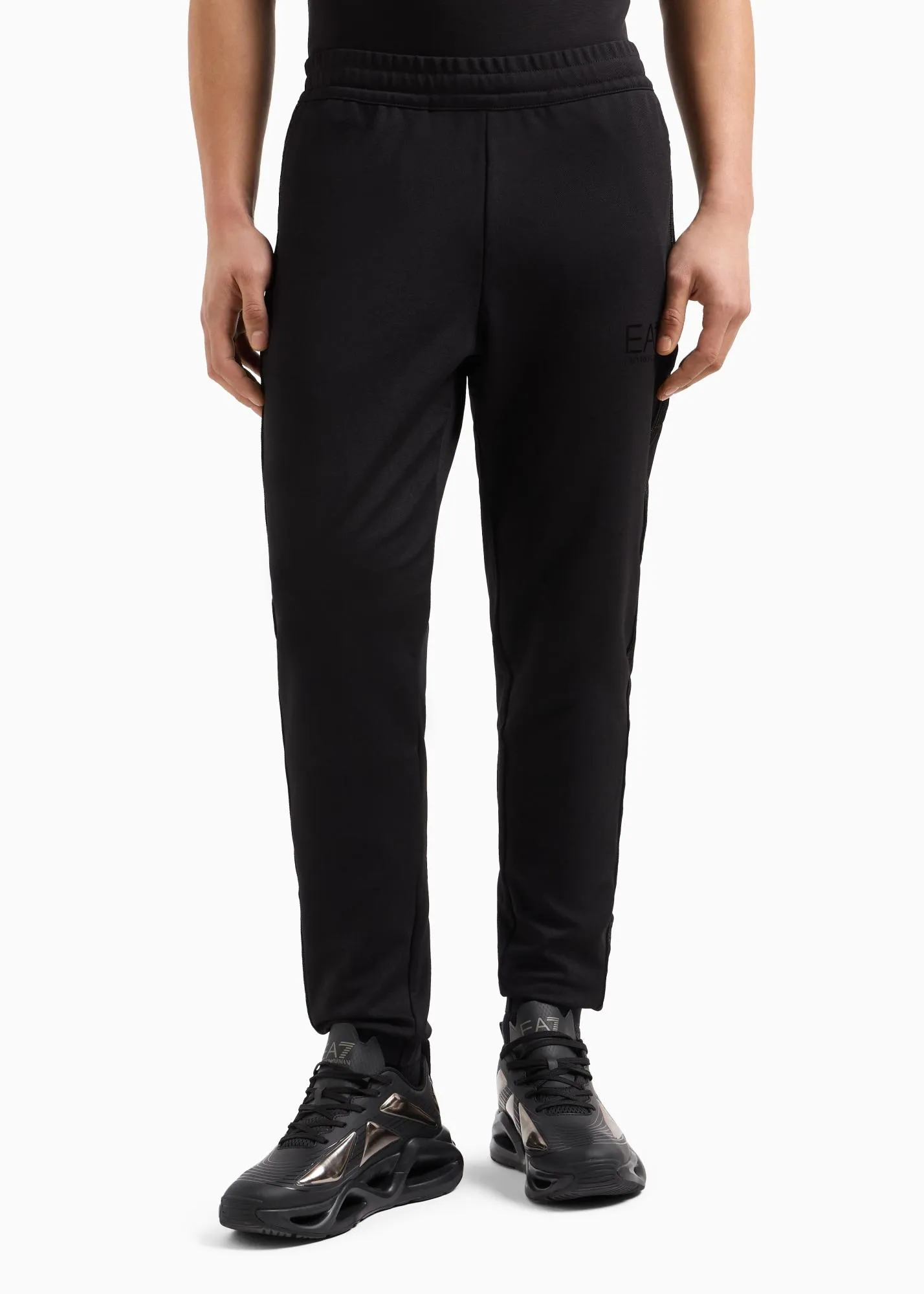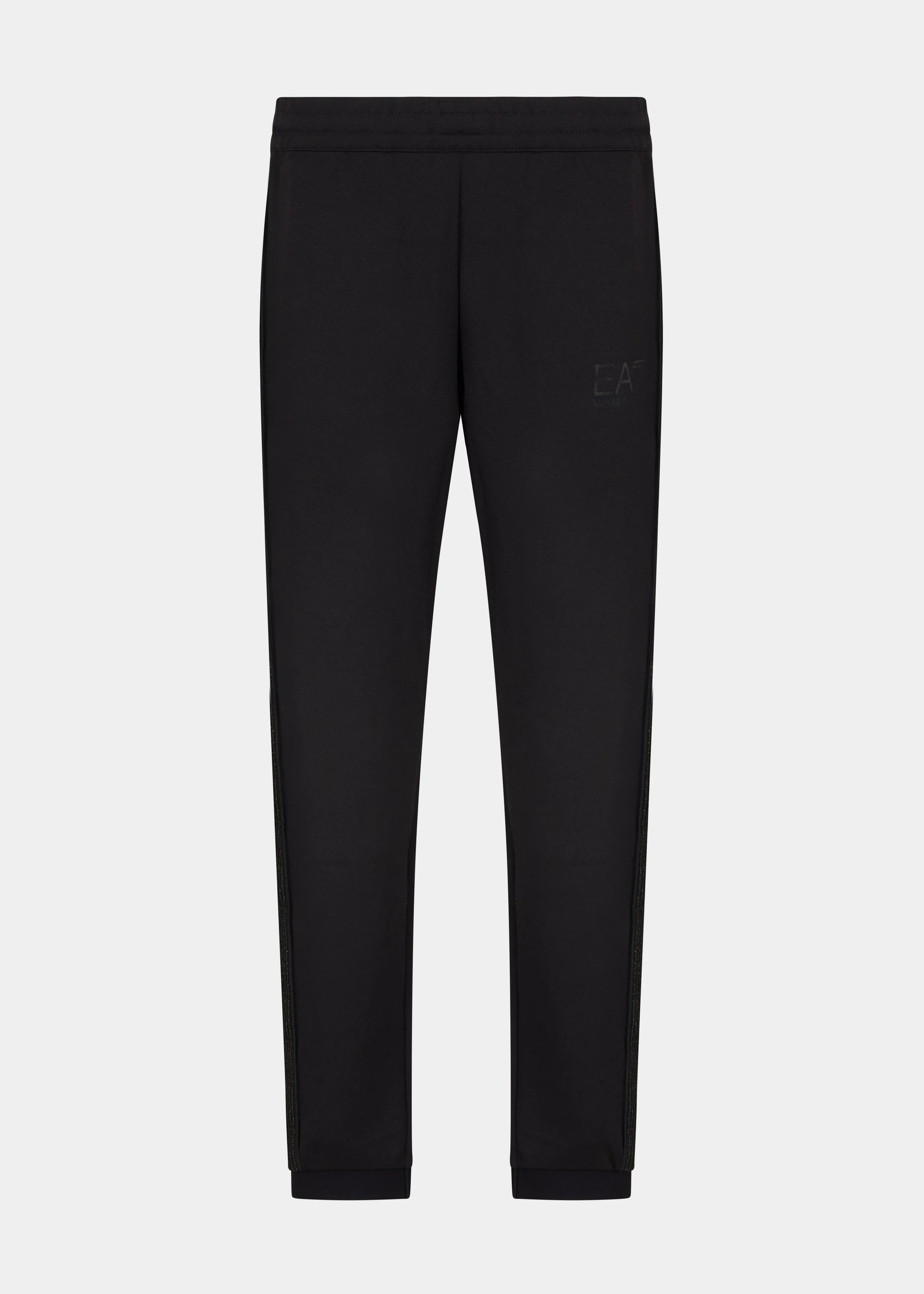 Мужские спортивные брюки EA7 черного цвета с лампасами и контрастным логотипом – стильный выбор для спорта и активного отдыха. Прямой крой с манжетами, эластичная талия и эластичная техническая ткань обеспечивают максимальный комфорт и свободу движений.