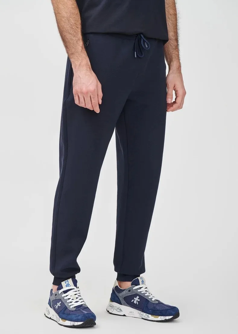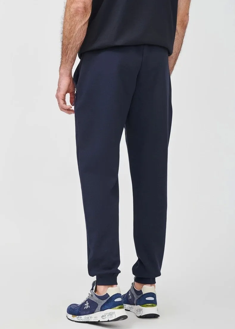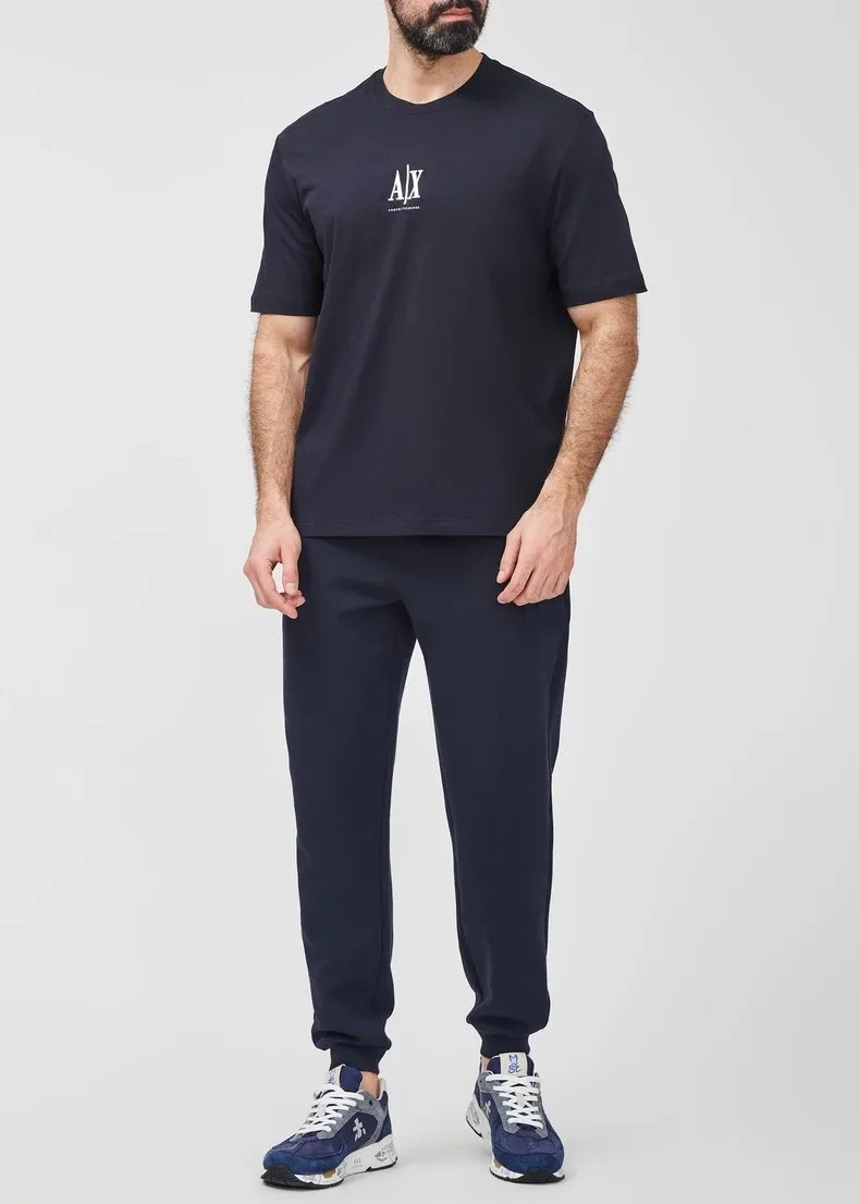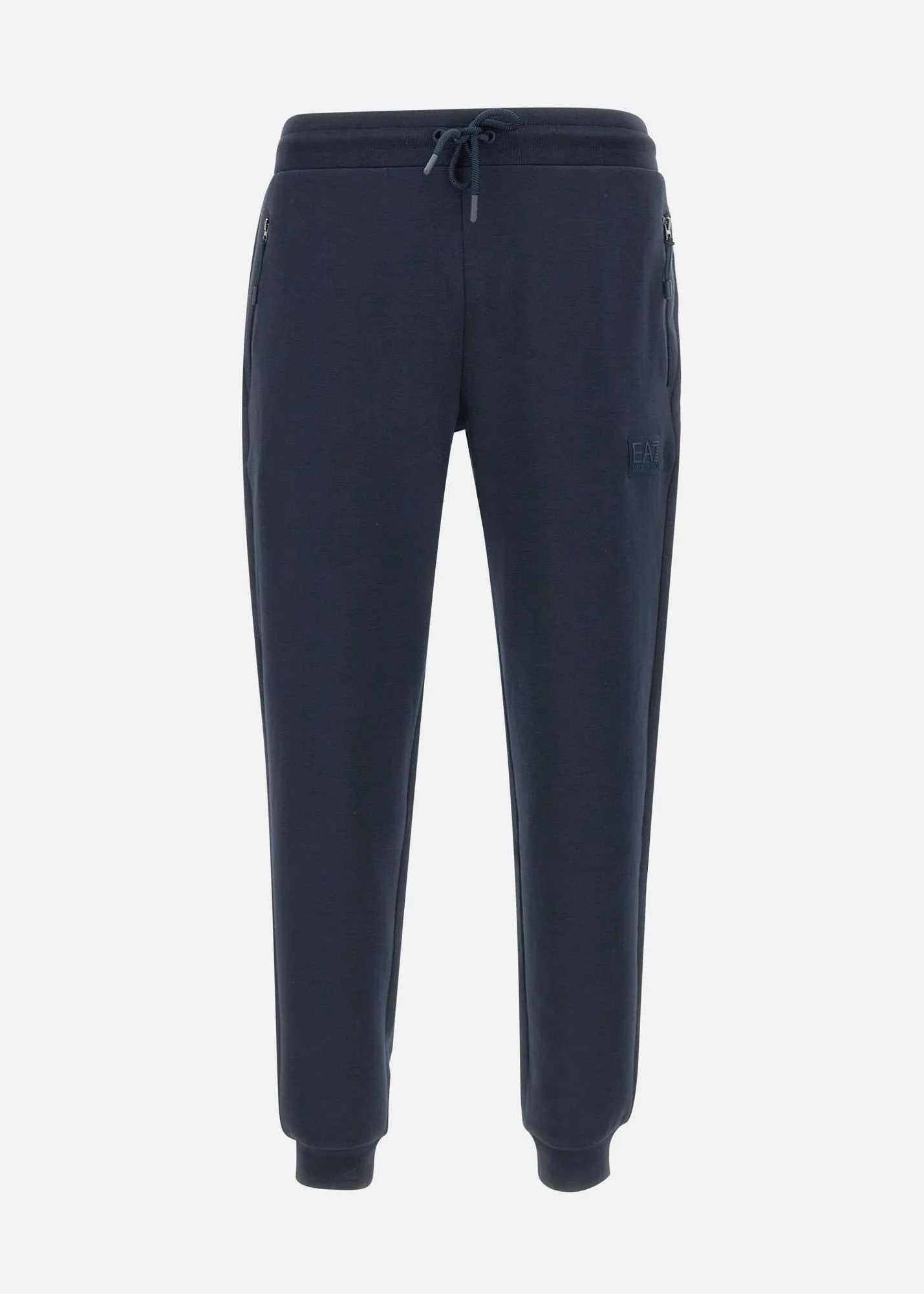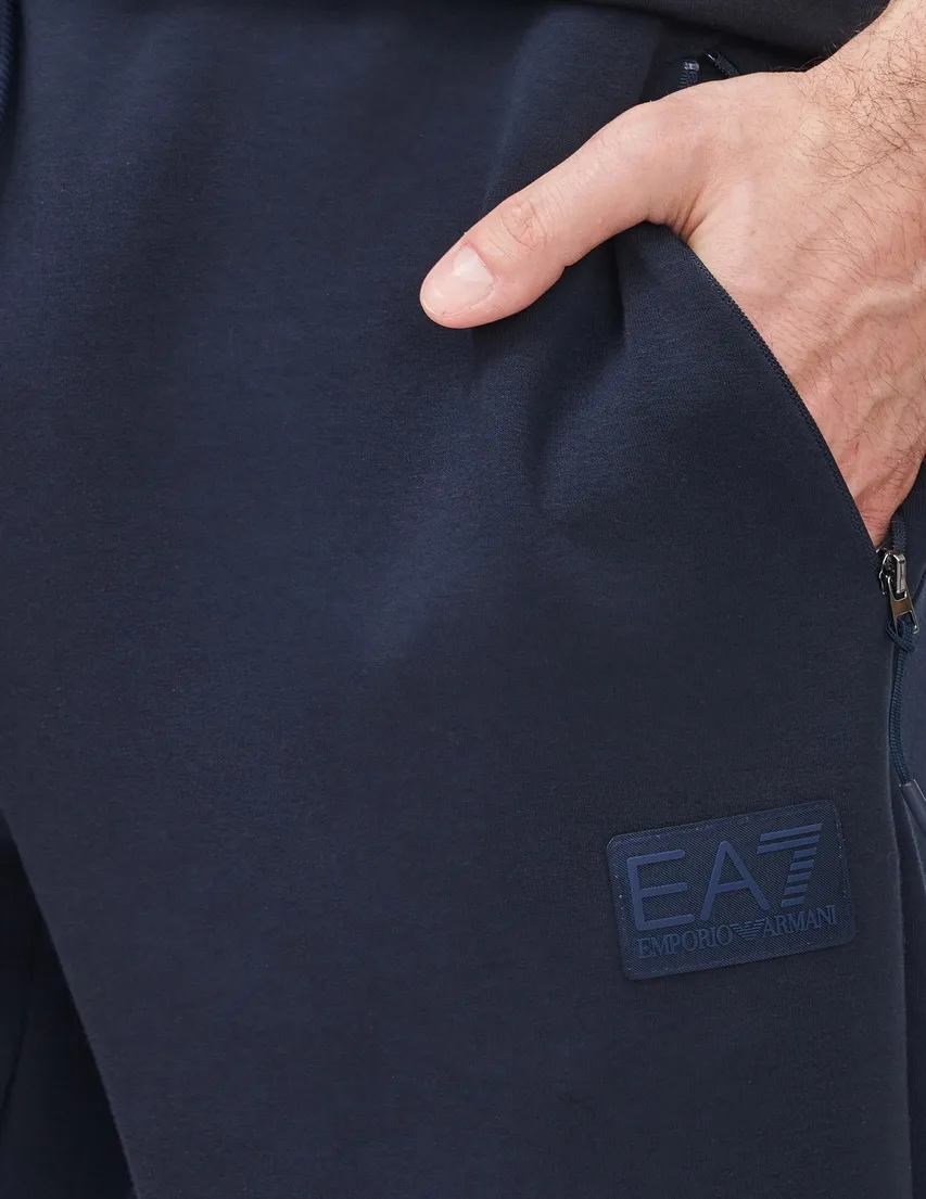 Мужские джоггеры EA7 из смесового хлопка, темно-синего цвета. Талия с кулиской, боковые карманы на молнии, логотип на штанине, трикотажные манжеты шириной 12 см, стандартная посадка.
